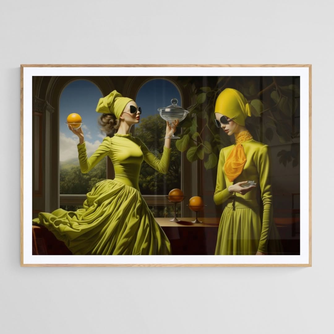 Futuristic women with glasses, oranges in a vase and dressed in green against a dream landscape.