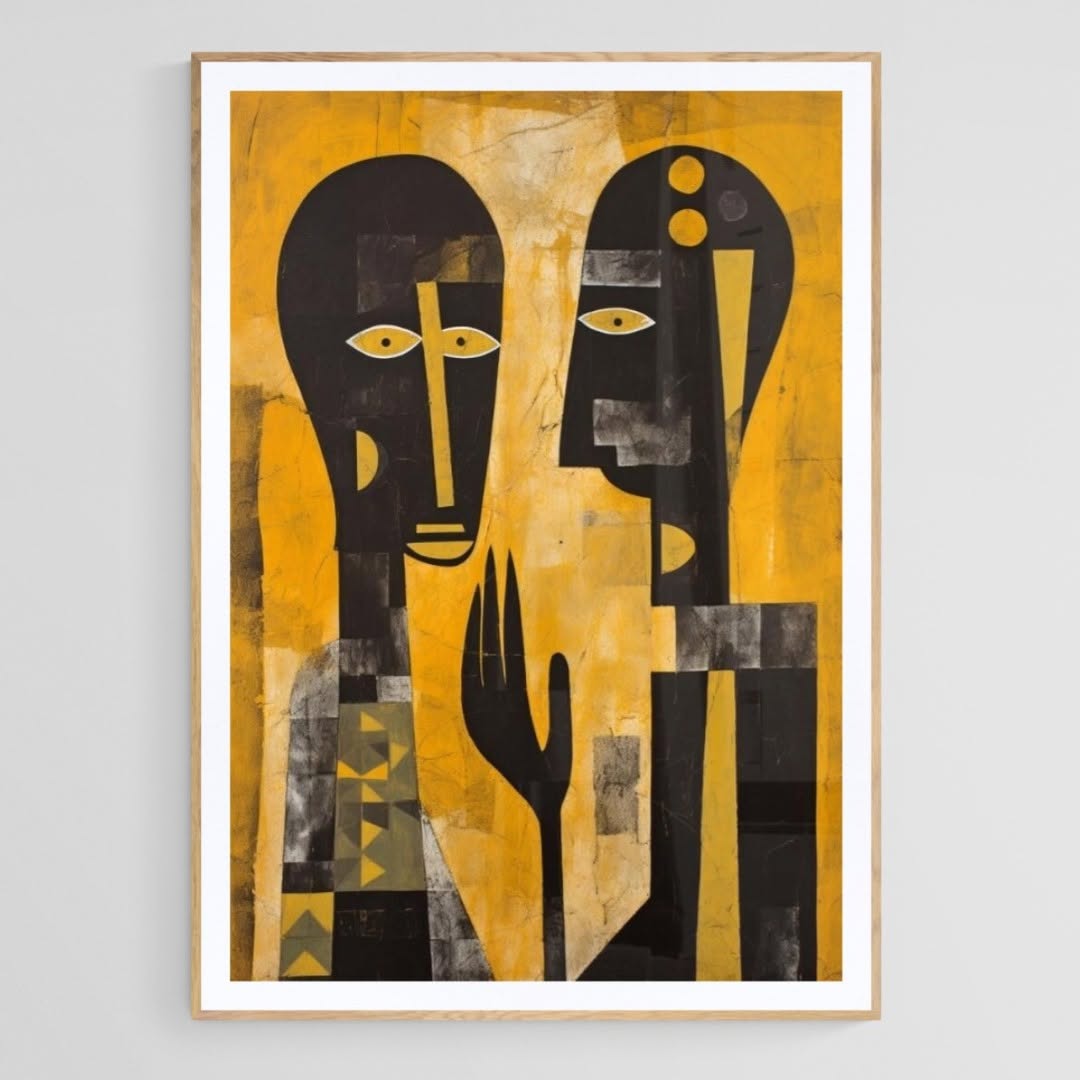 African and Mexican inspired style art, black silhouettes against a yellow background.