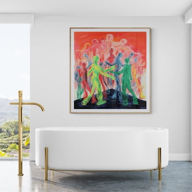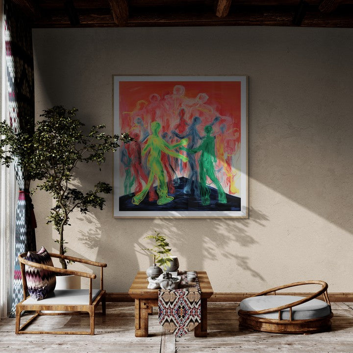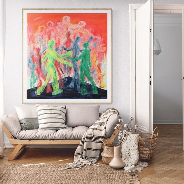 For framed artworks, we recommend carefully removing the protective packaging and hanging it with the help of two people using strong nails. For larger artworks, if possible, use screws and wall anchors.