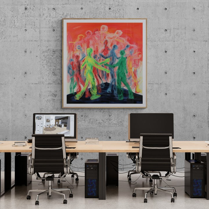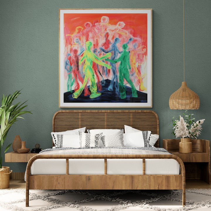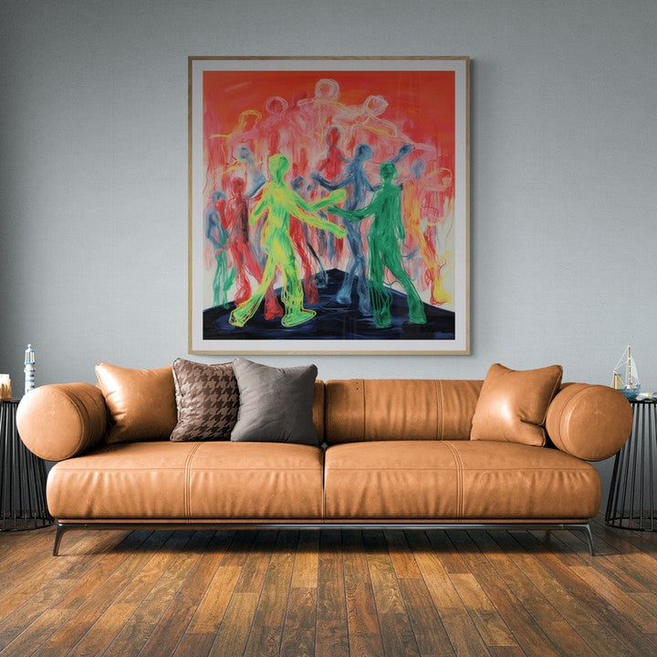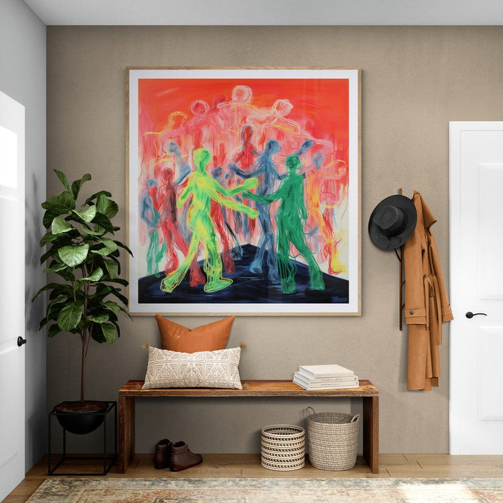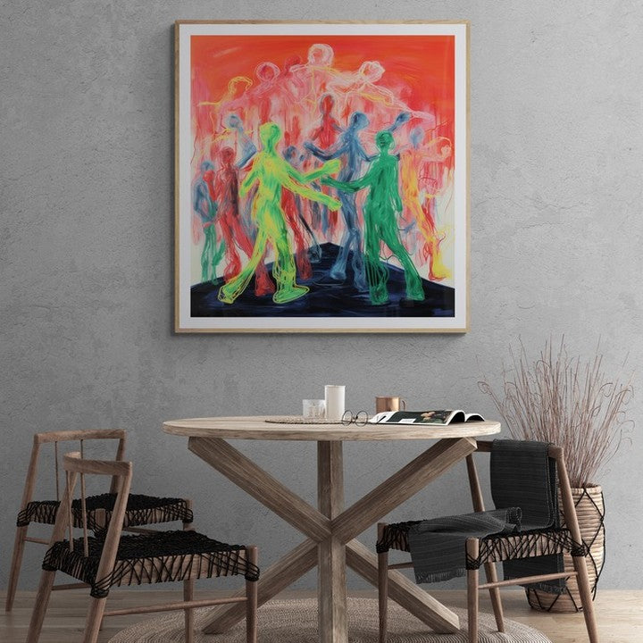 Colorful, electric, color pencil art piece of people dancing in a childish manner.