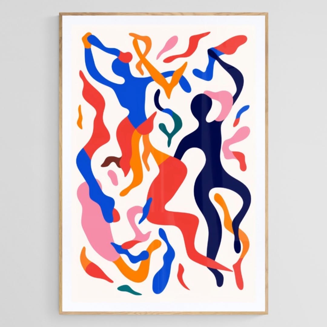Matisse style colorful painting of people dancing.