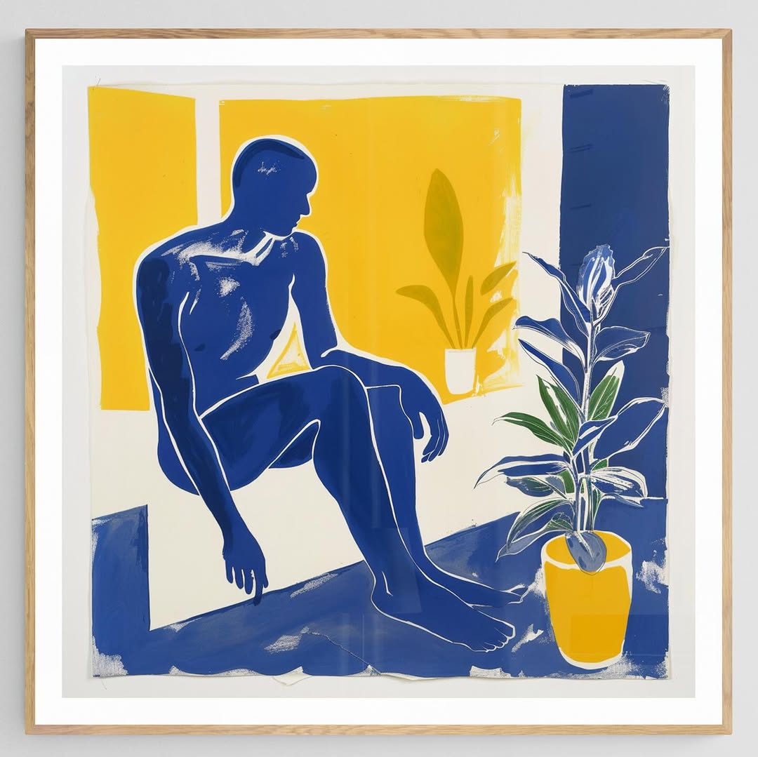 A man sitting down in blue and yellow.