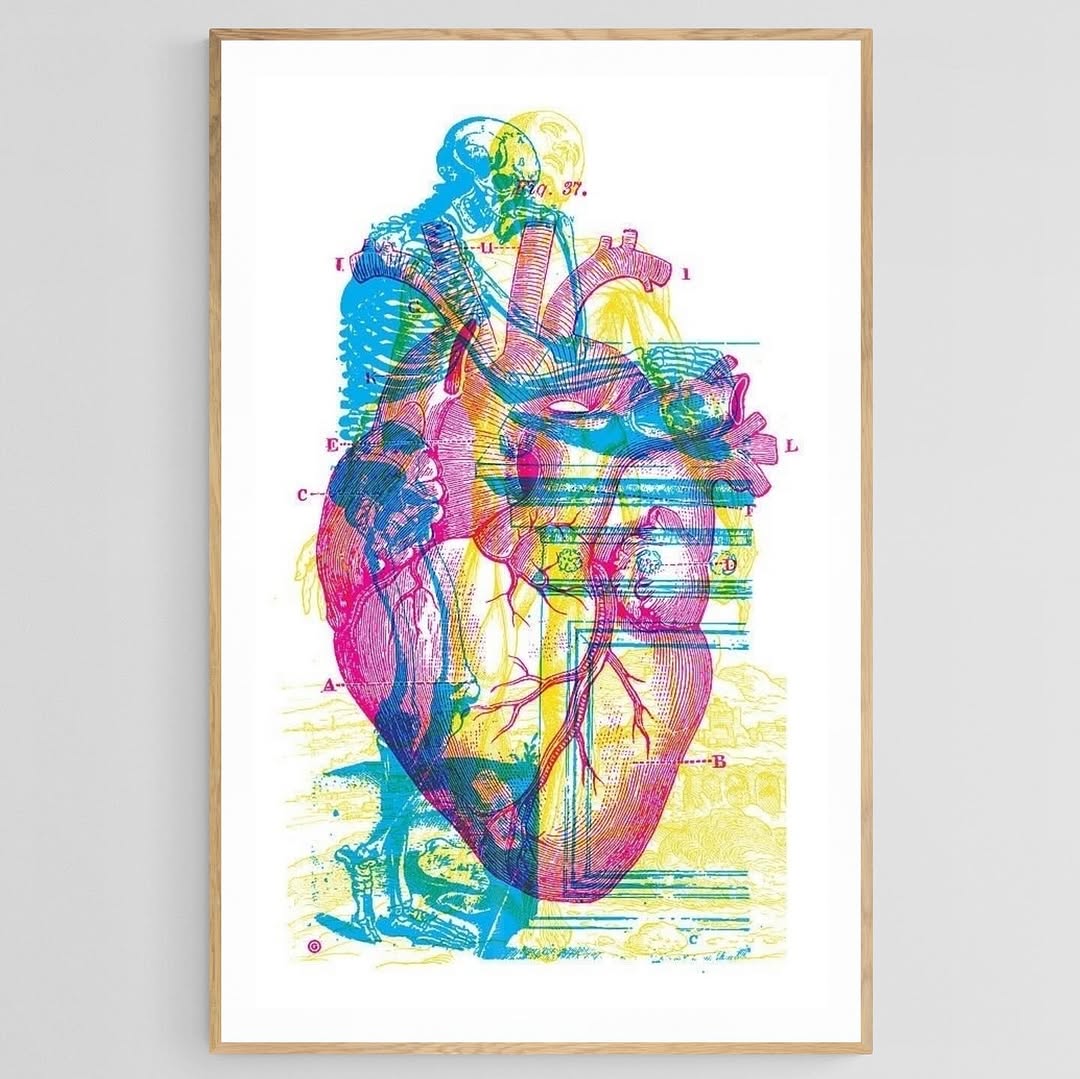 Overprint of anatomy of a heart and a skeleton.