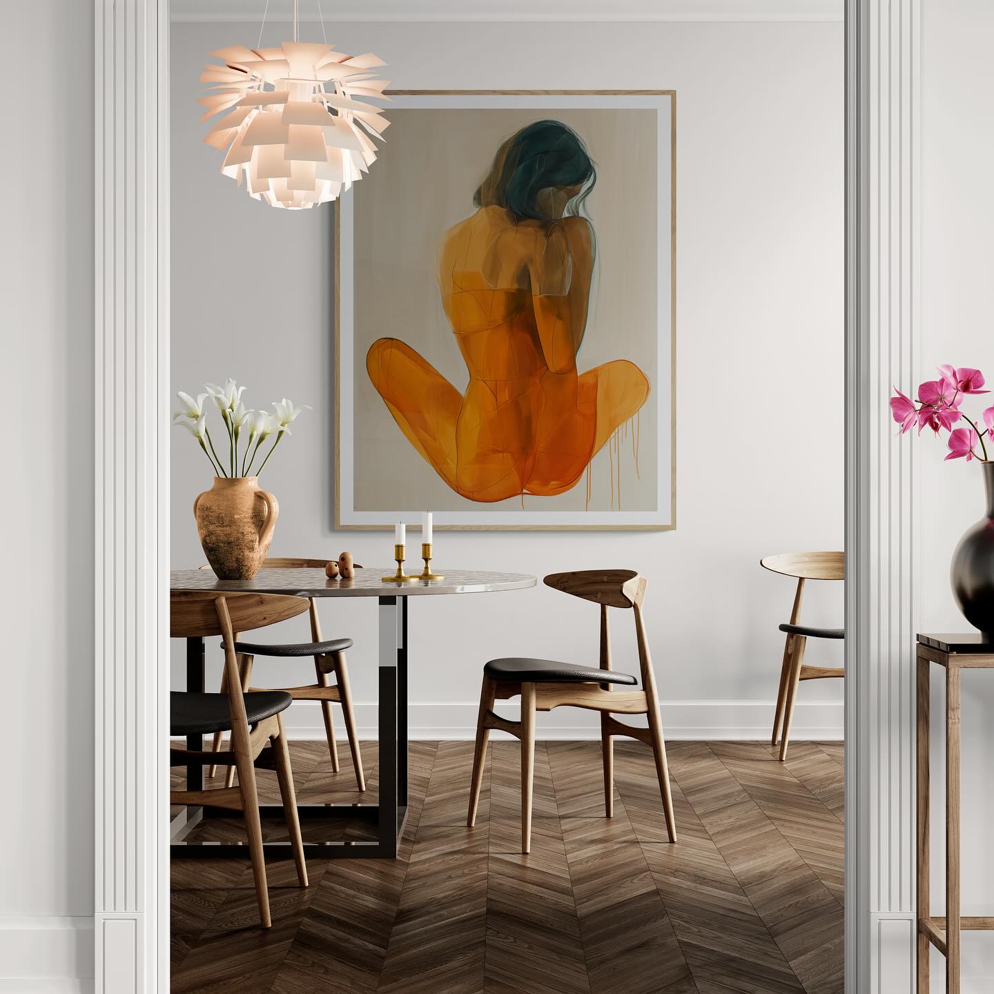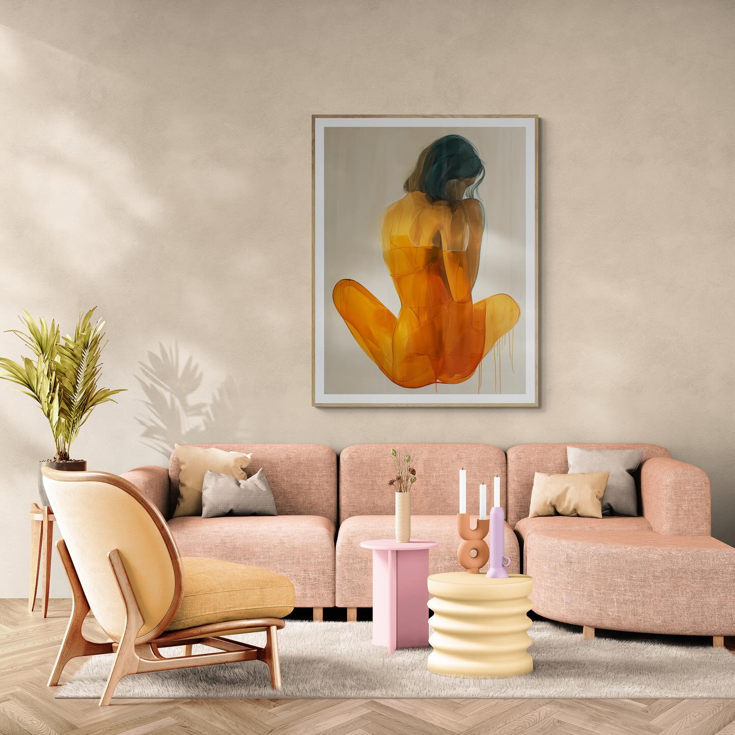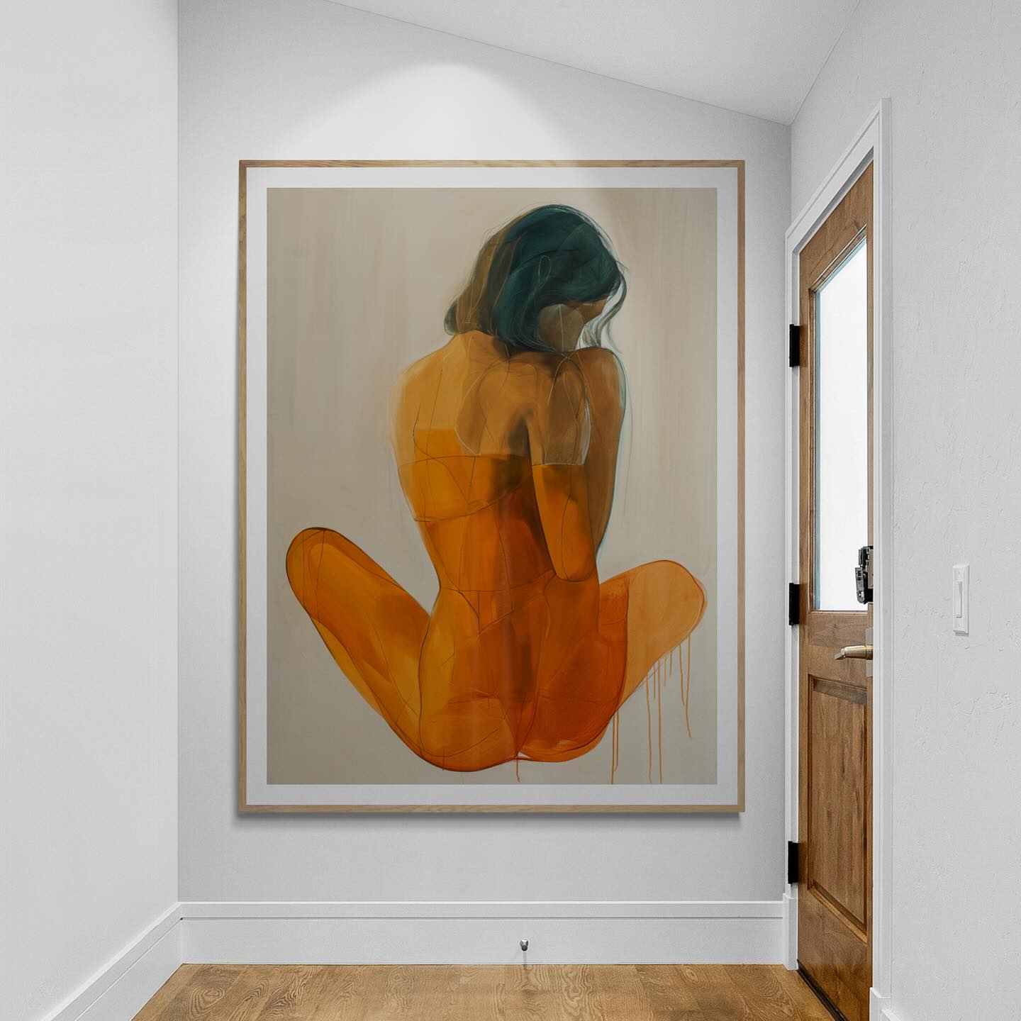 Orange painting of a woman from the back.
