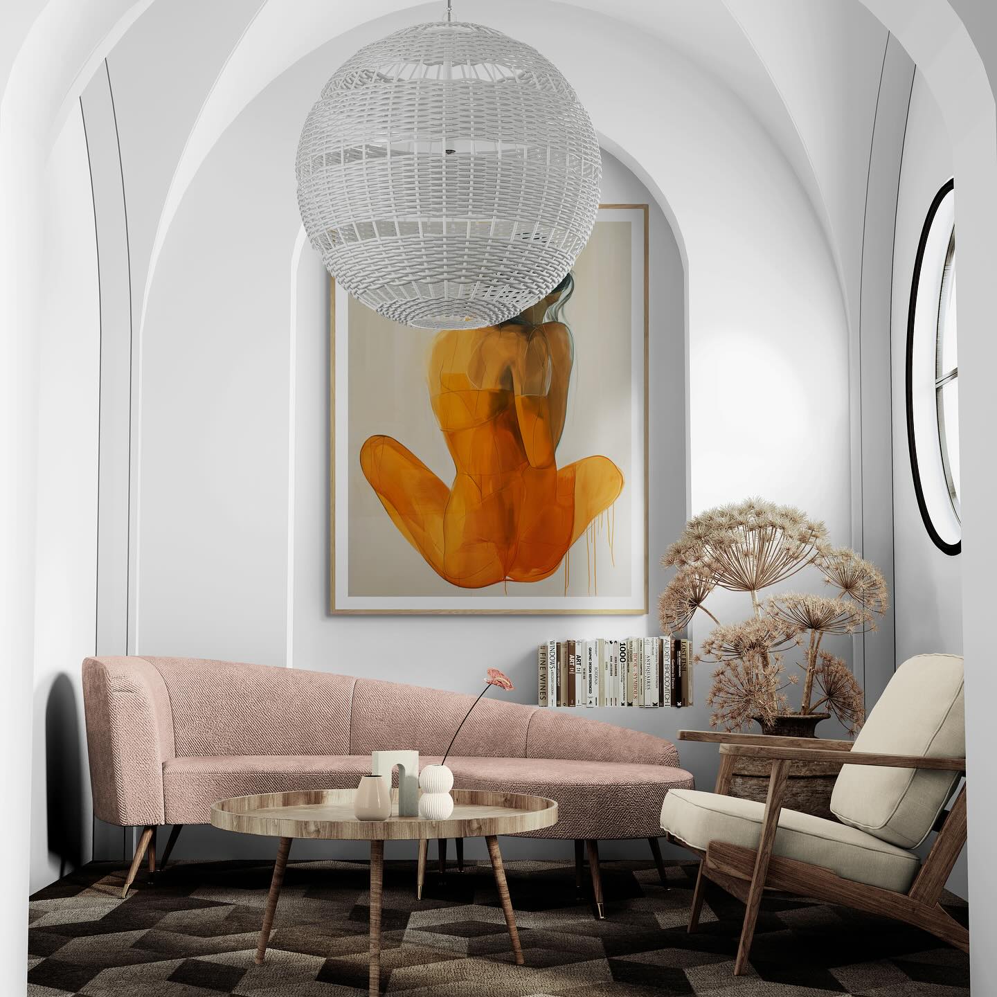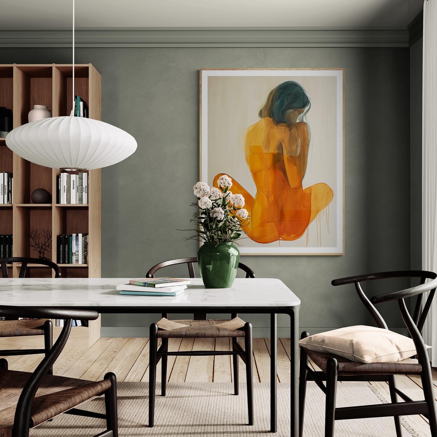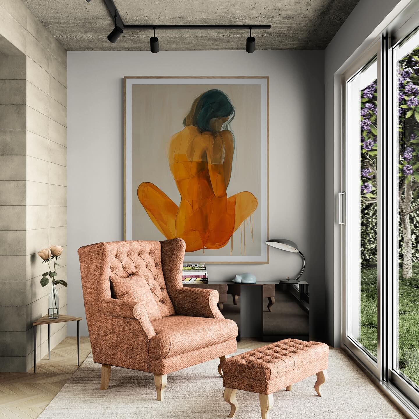 Orange painting of a woman from the back.