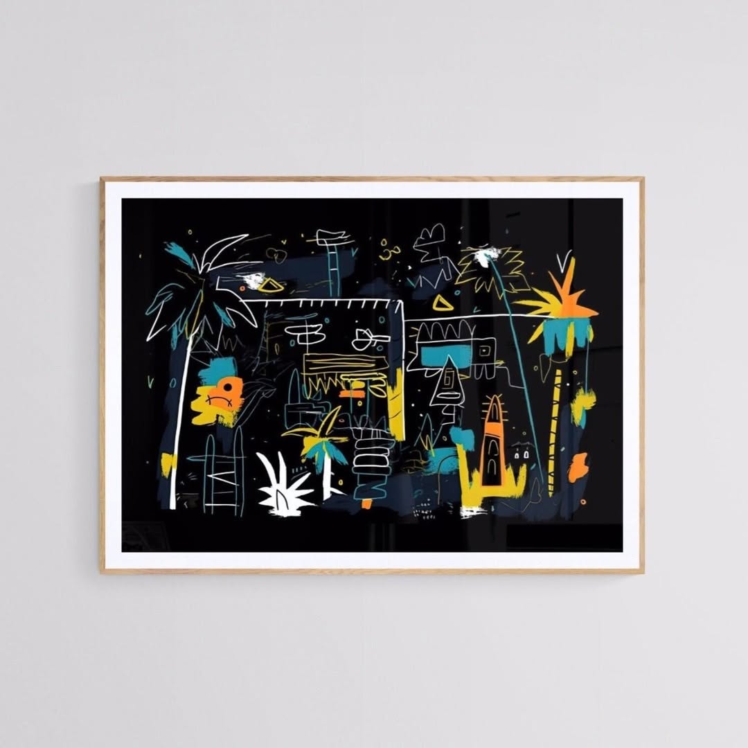 Jean Michel Basquiat crayon color pencil style drawing. Tulum beach, abstract, colorful wall extra Large wall art print - Palm trees and dark background.