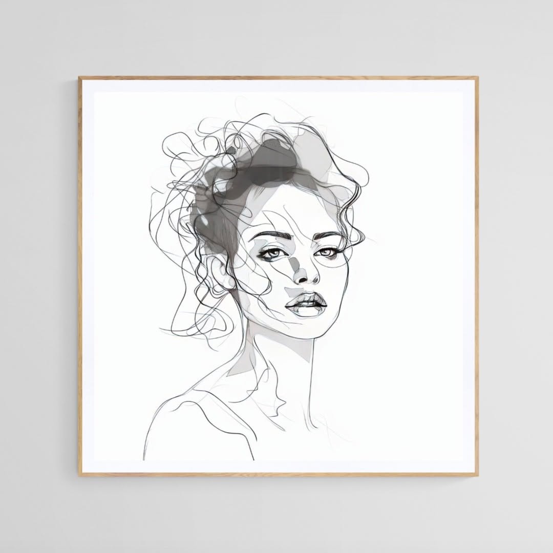 Woman pencil extra large continuous linear carbon minimalist drawing. African american young girl in White Background, square format, Black & White.