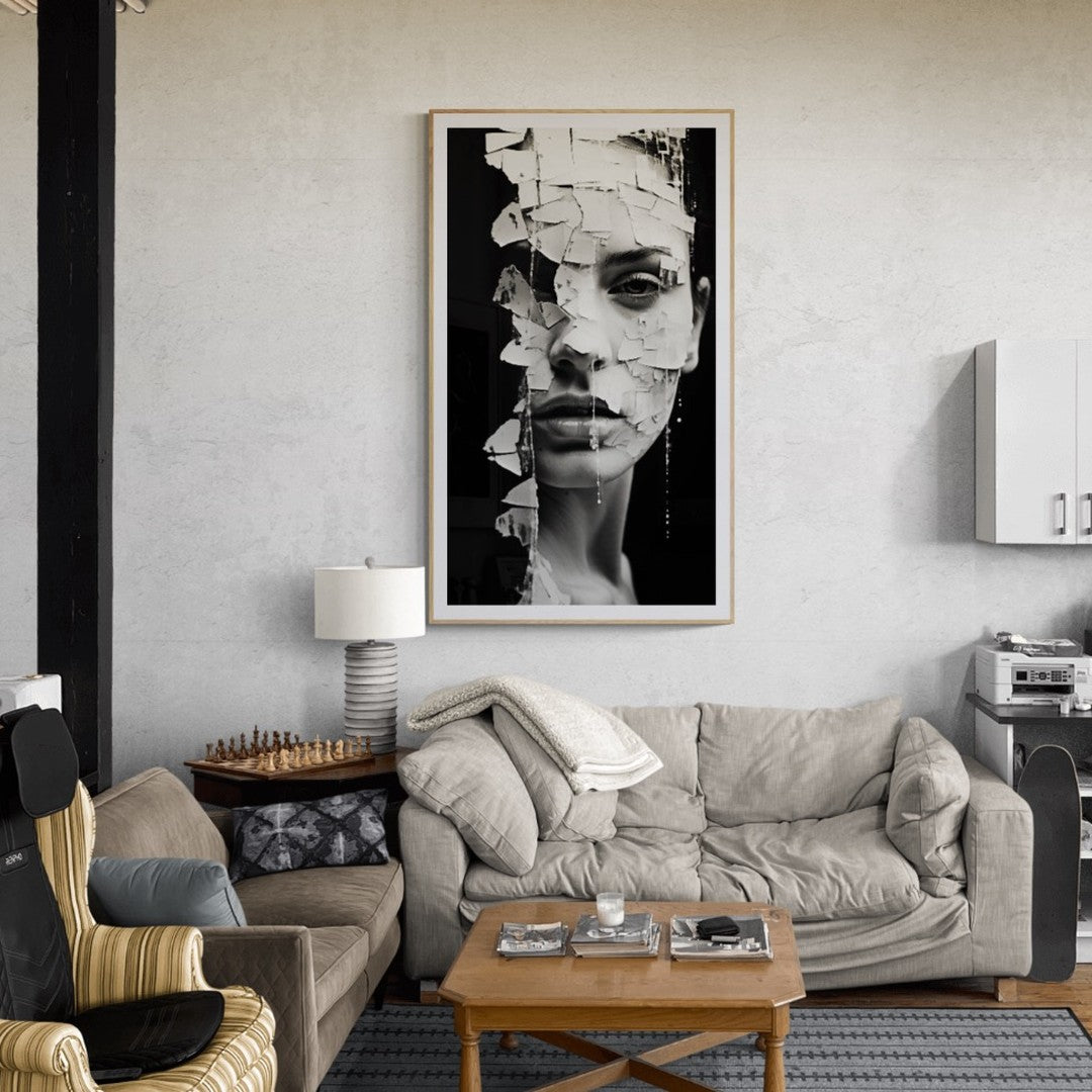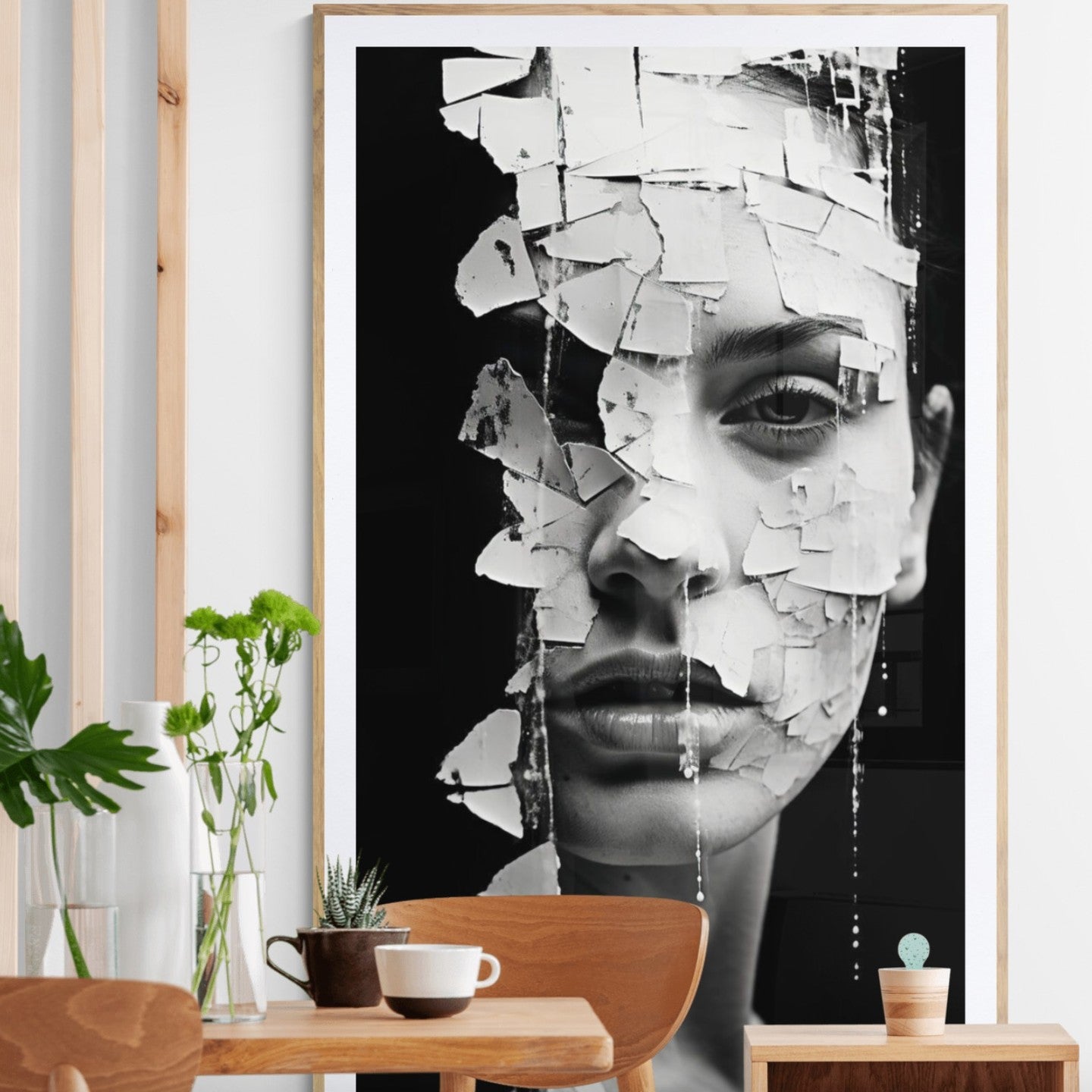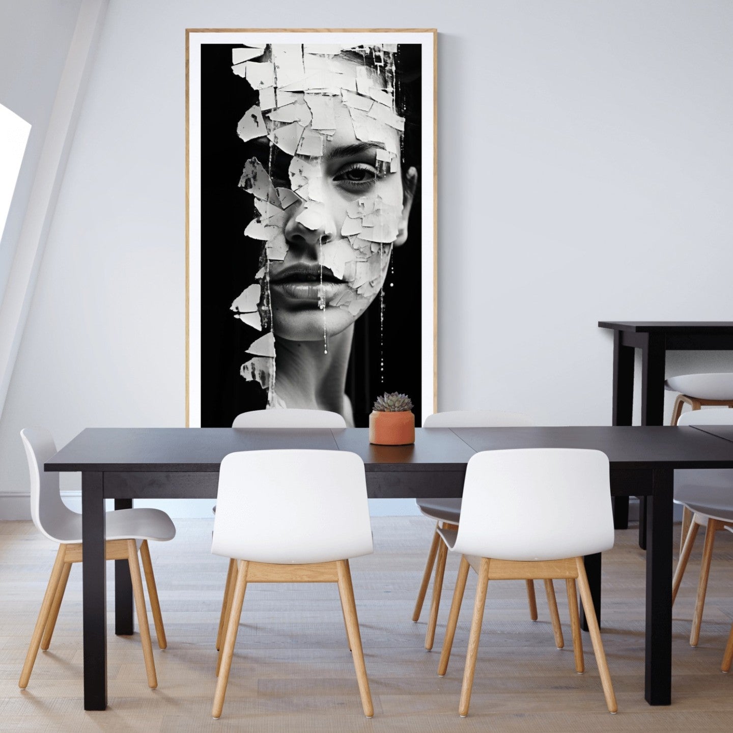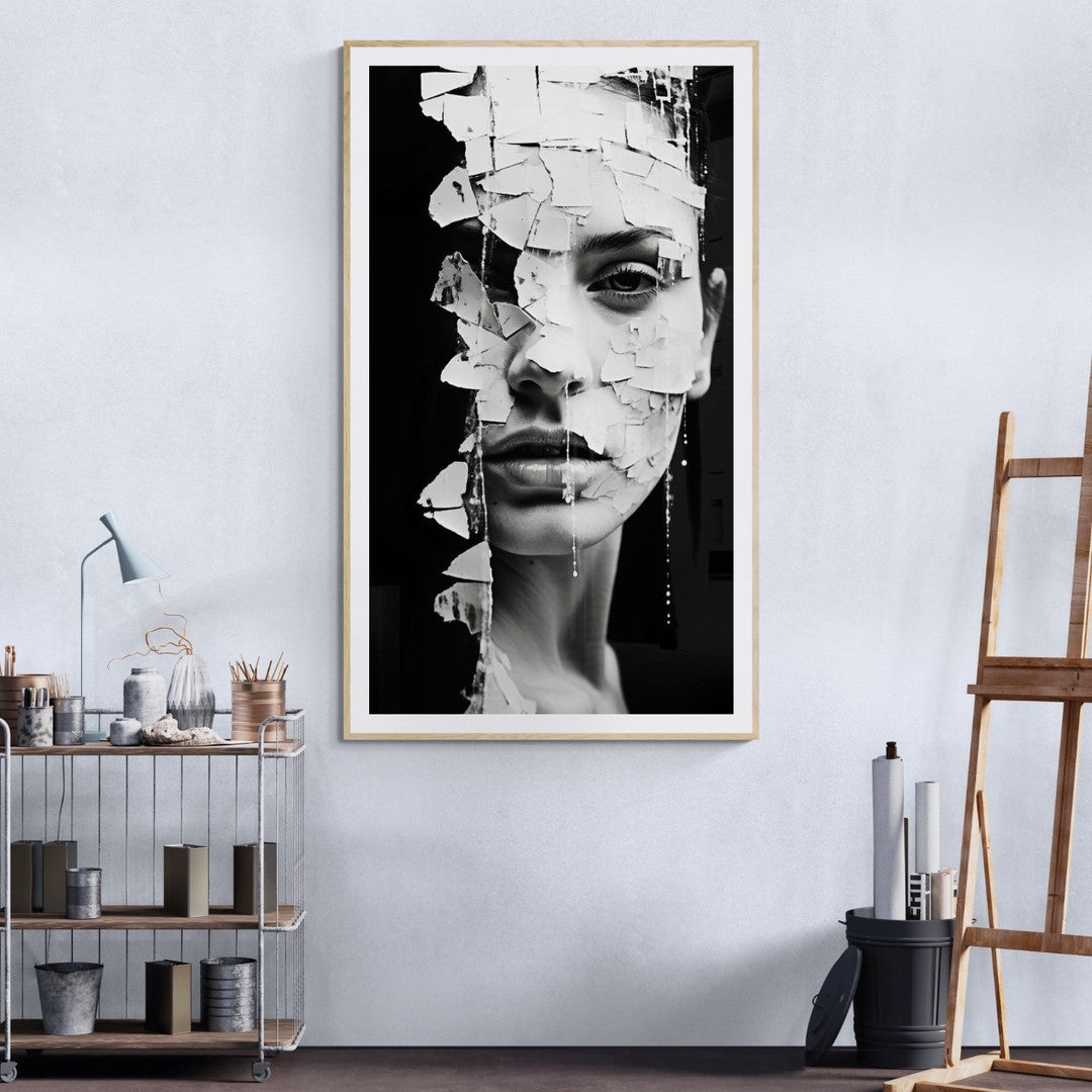 Black and white photograph of woman and eggshells. Ultra high resolution print in premium photographic paper.