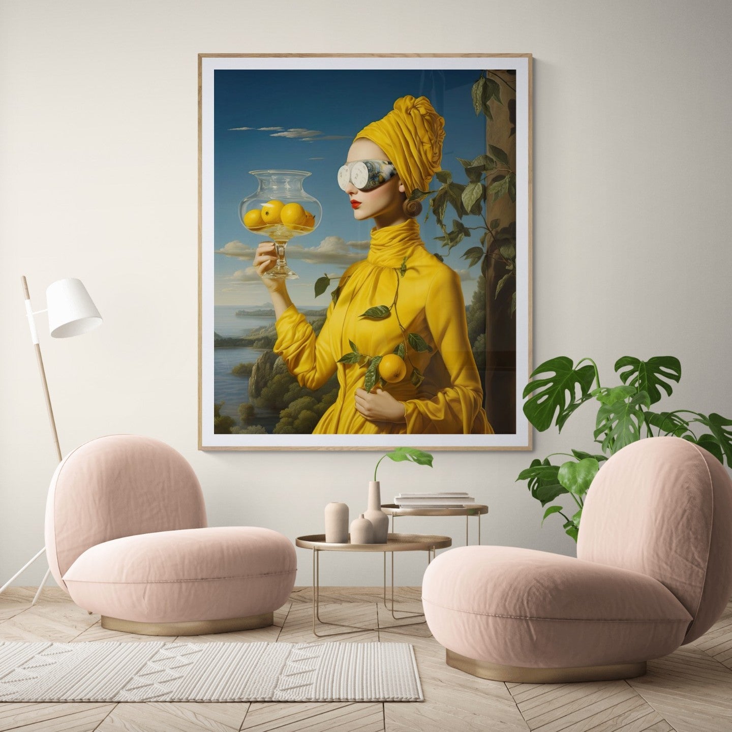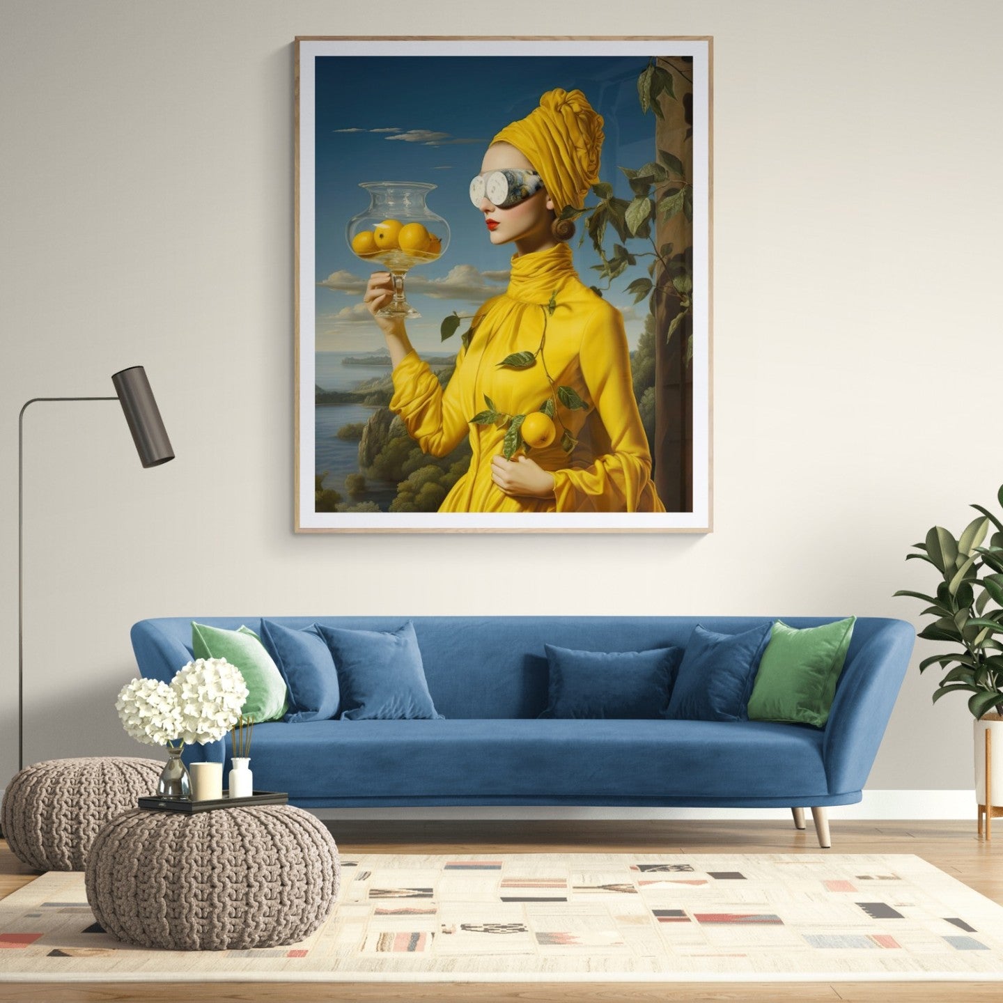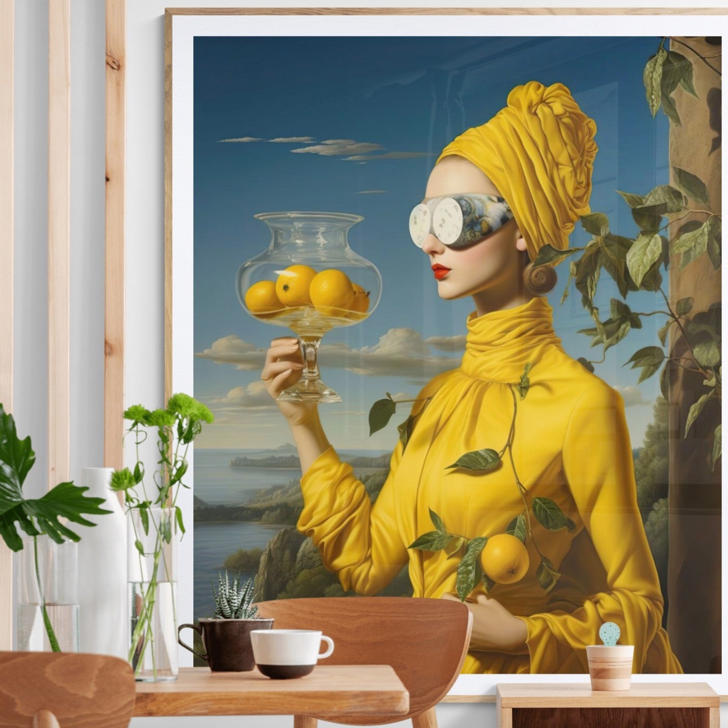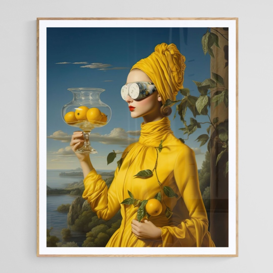 Futuristic woman with goggles, lemons in a vase and dressed in yellow agains a dream landscape.