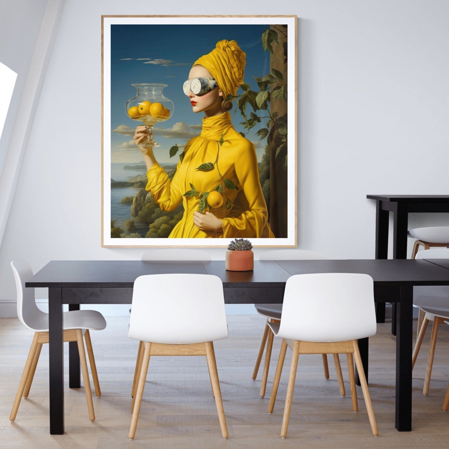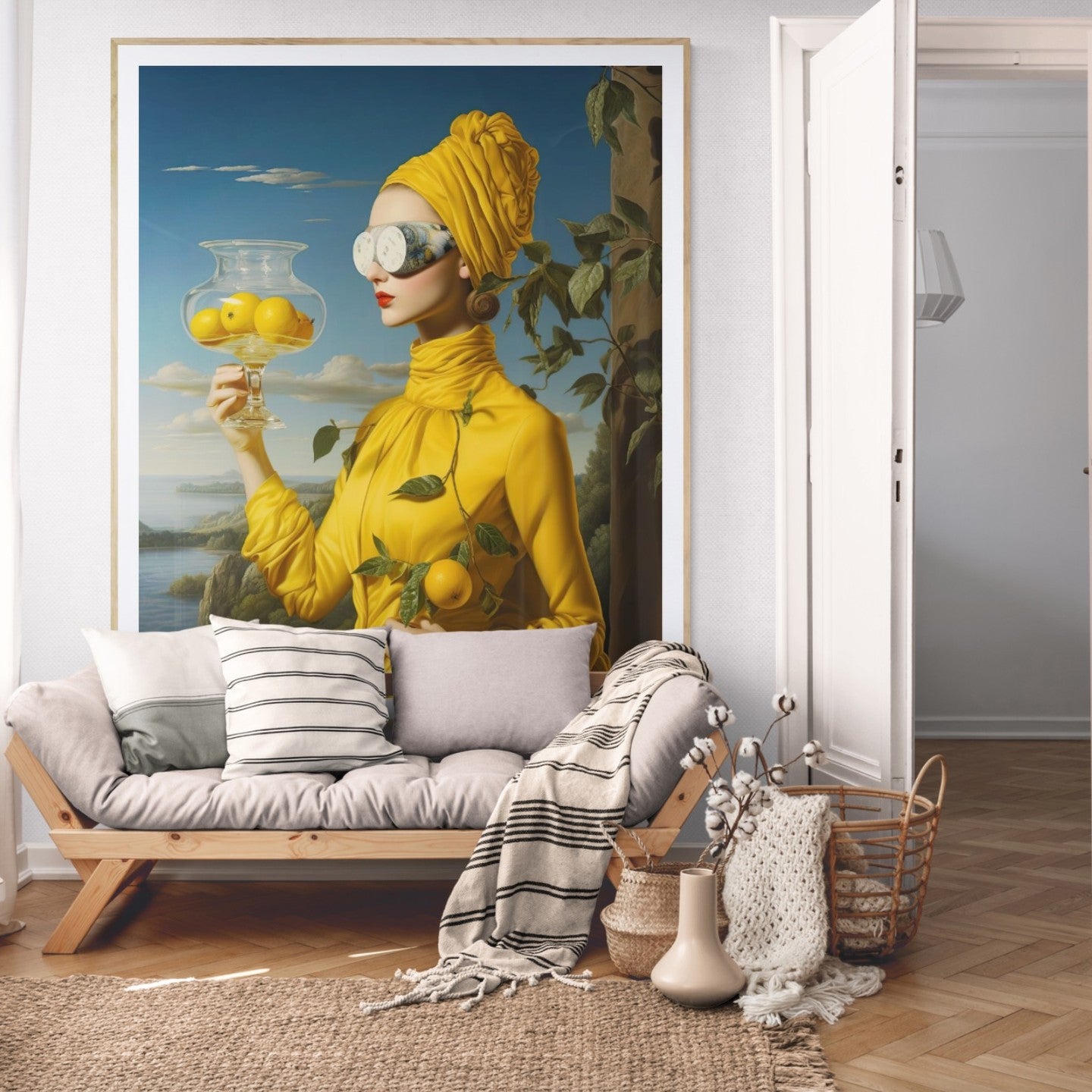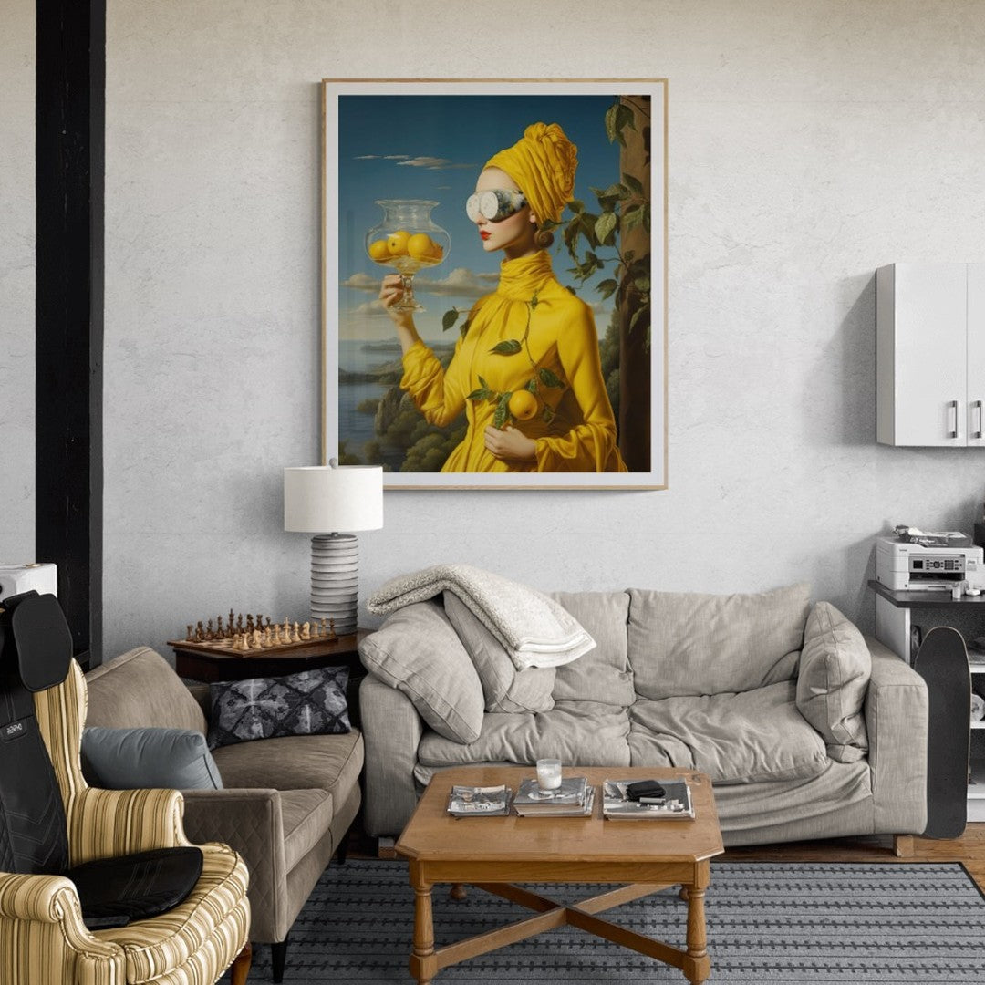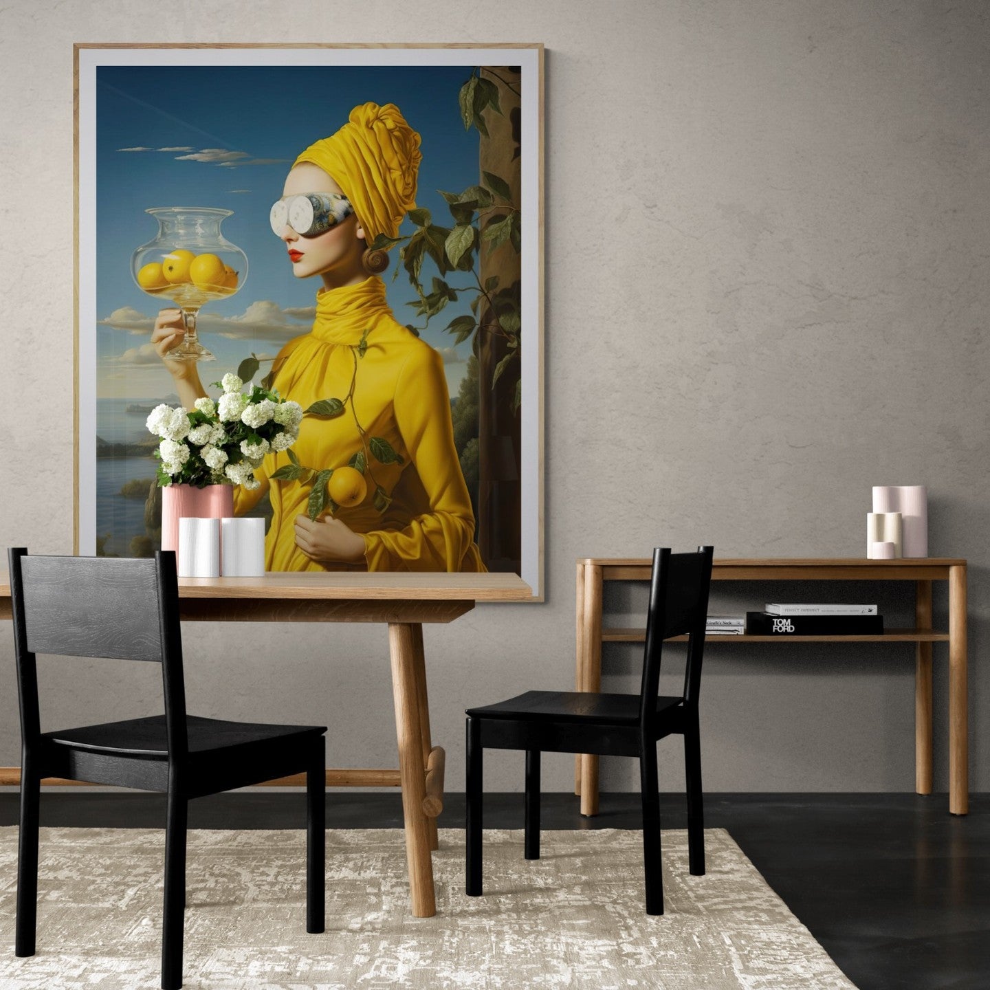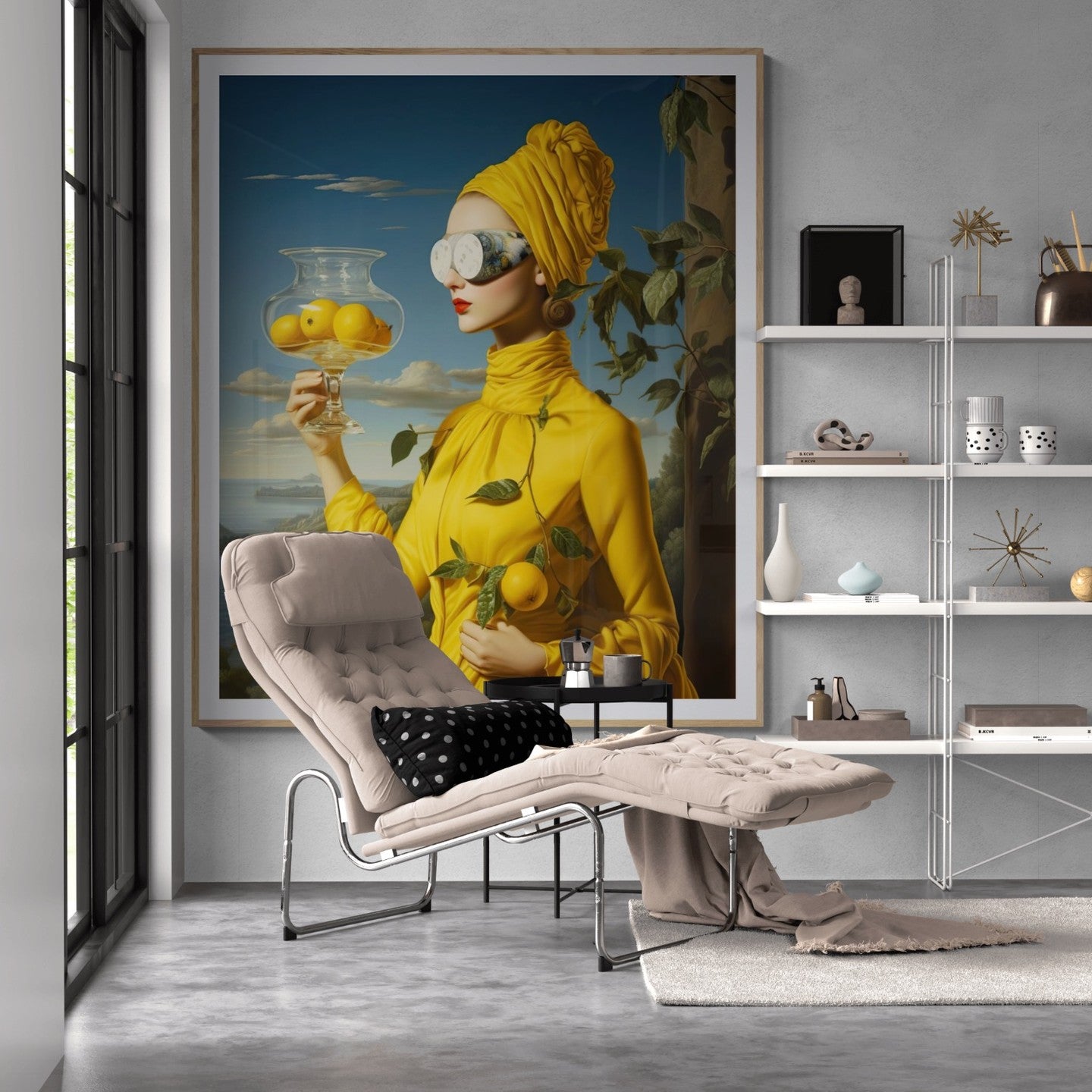 Futuristic woman with goggles, lemons in a vase and dressed in yellow agains a dream landscape.
