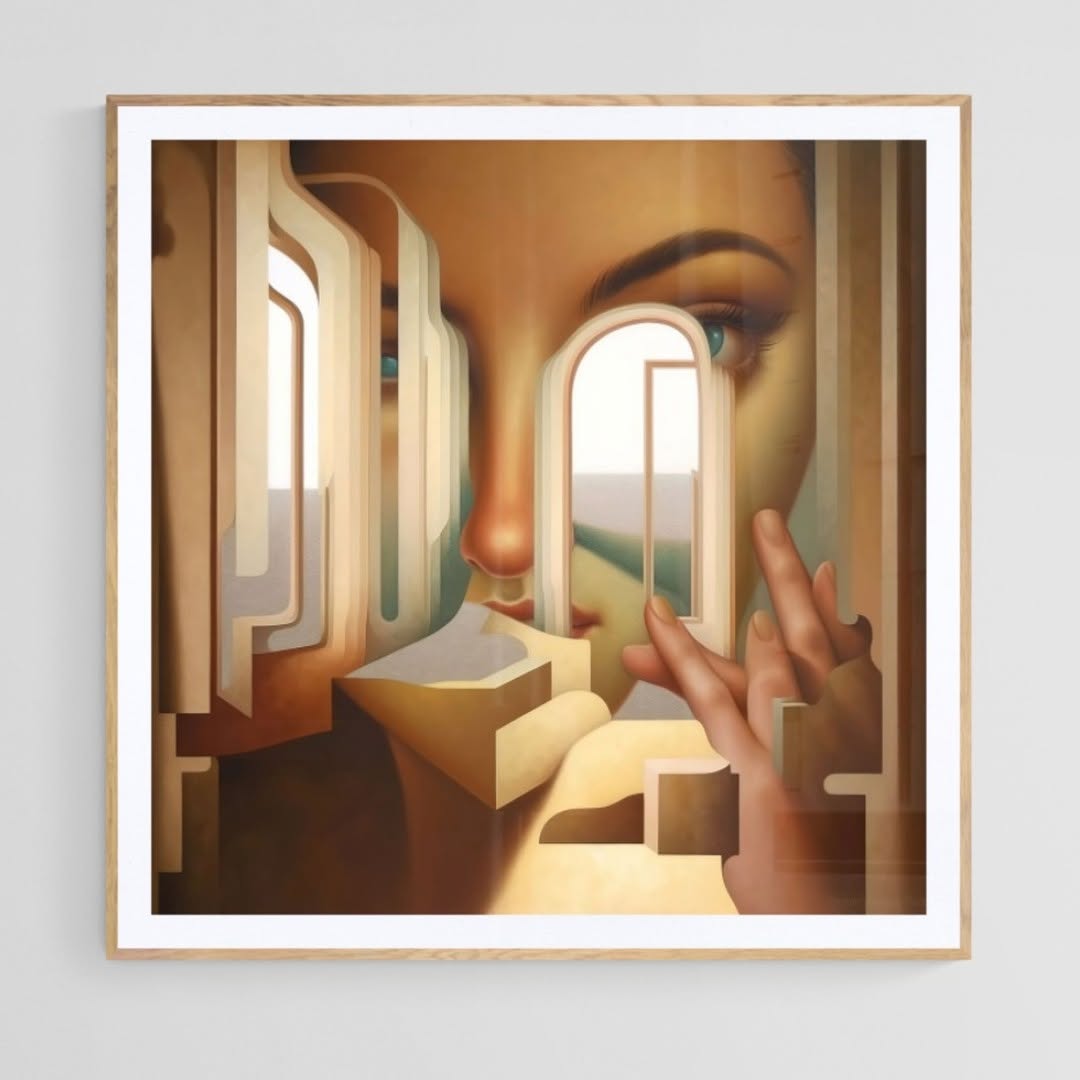 Woman and windows in square art print, in Salvador Dali surrealism style art. Pareidolia.