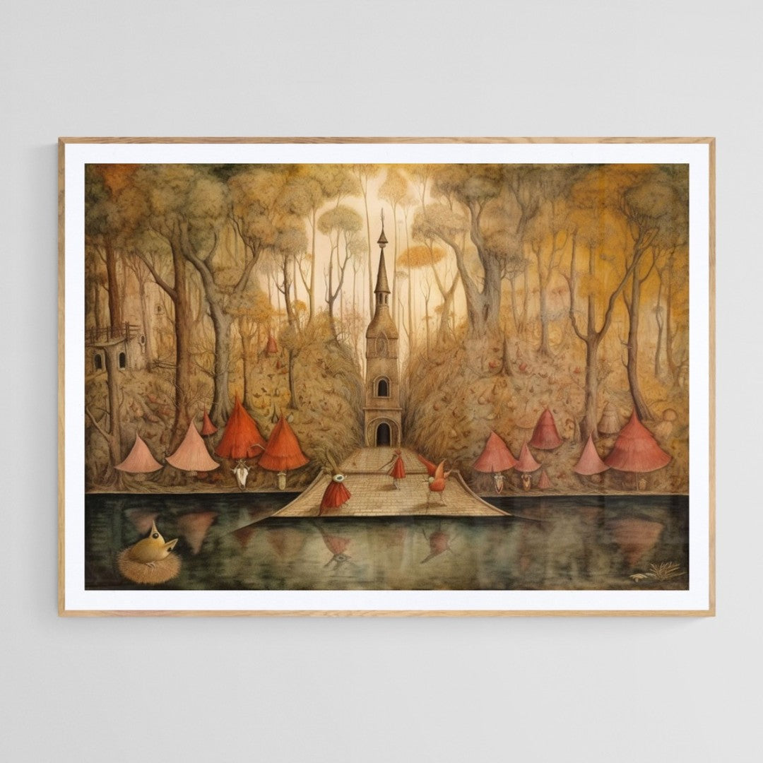 A lake in a dream in Remedios Varo style art.