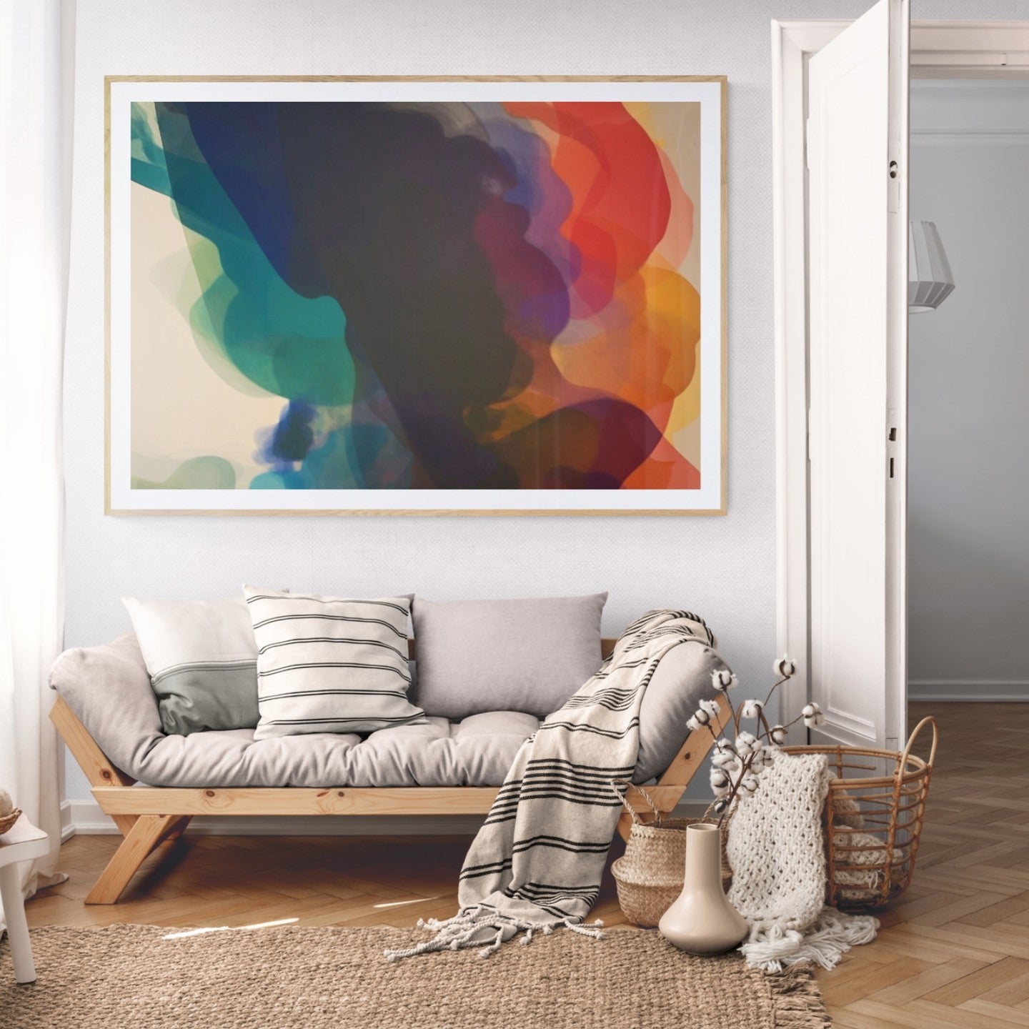 Para obras enmarcadas, sugerimos quitar con cuidado el embalaje protector y colgarla con la ayuda de dos personas, usando clavos resistentes. En el caso de obras de gran tamaño, si es posible, utiliza tornillos y tacos de pared.