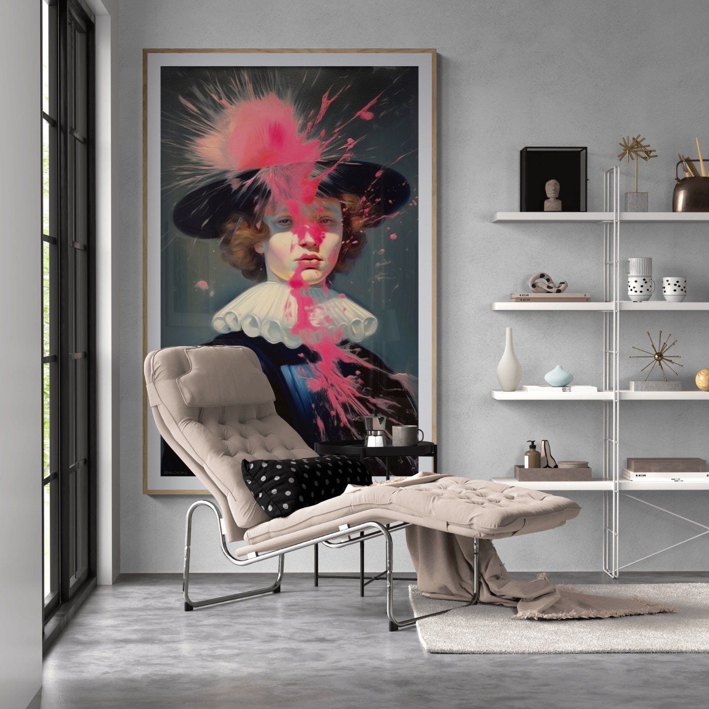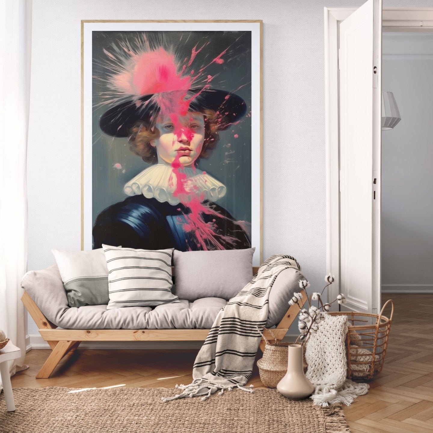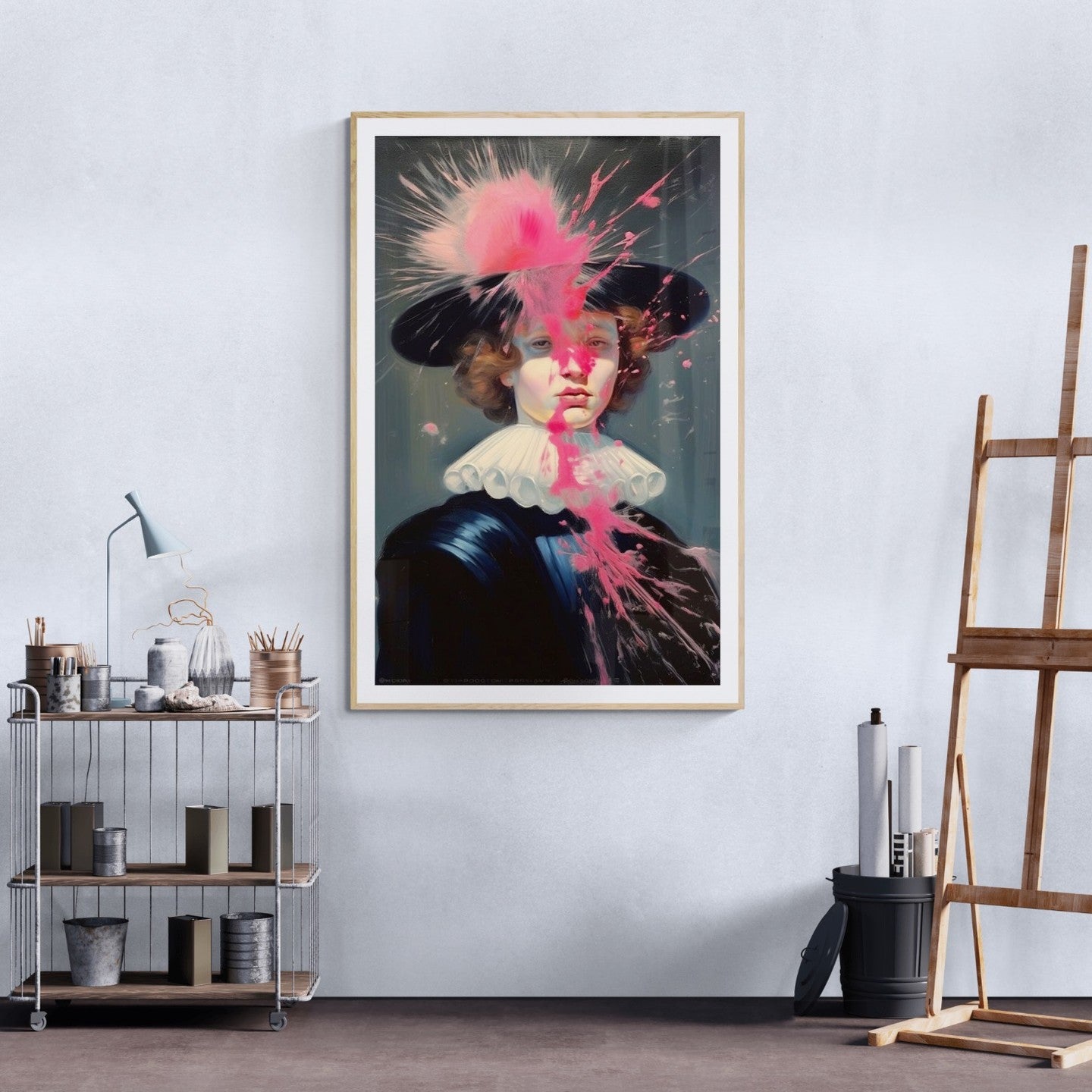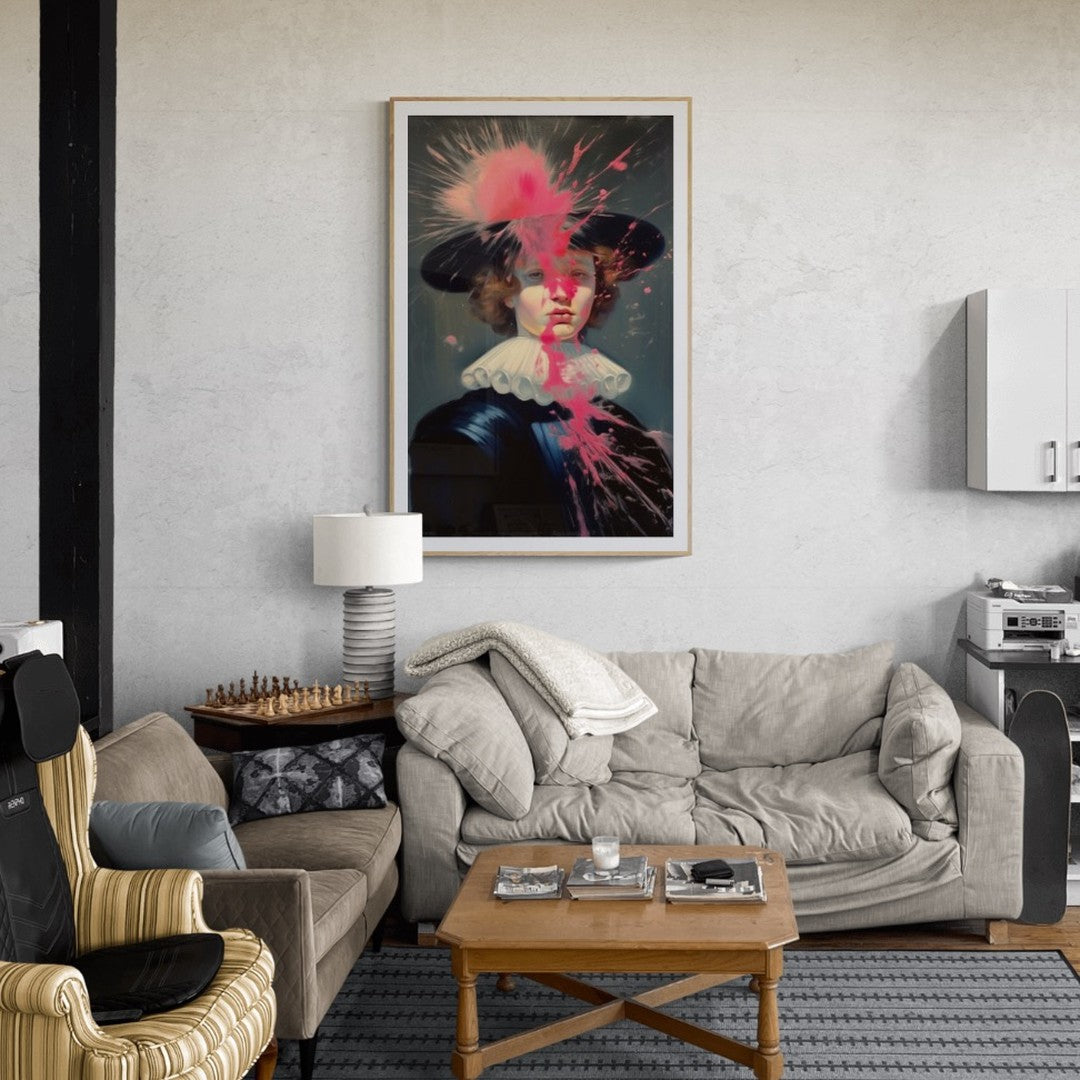 Baroque painting of a man dress in french eighteen century attire intervened with pink paint splatter.