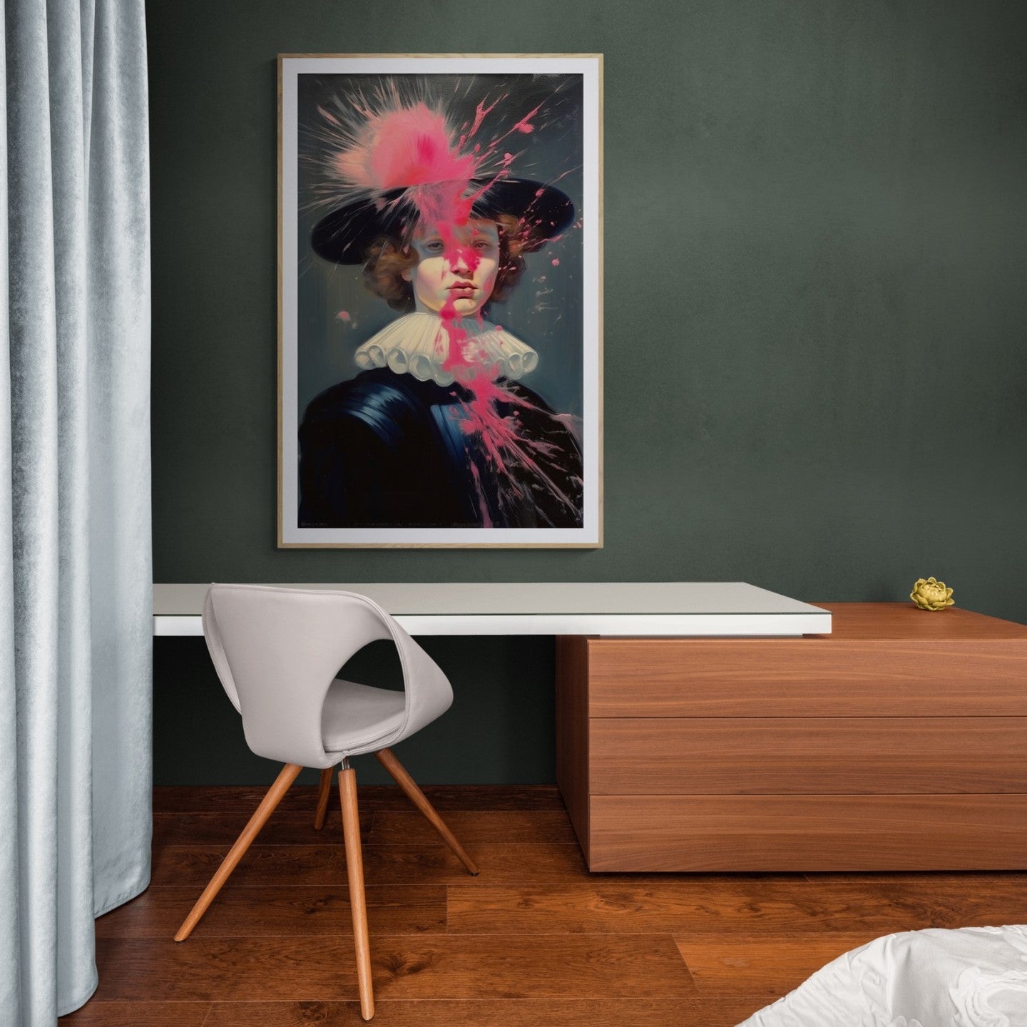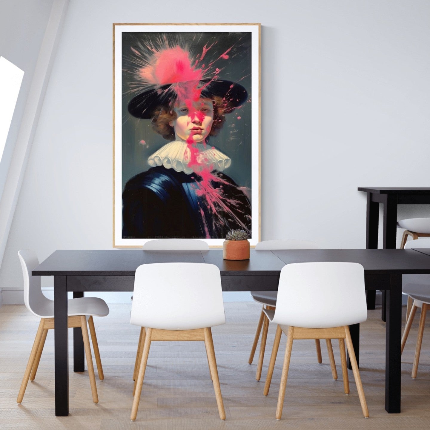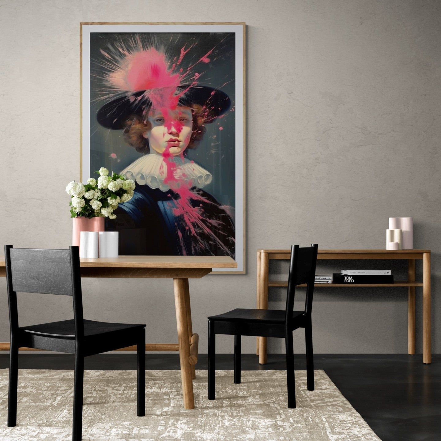 Baroque painting of a man dress in french eighteen century attire intervened with pink paint splatter.