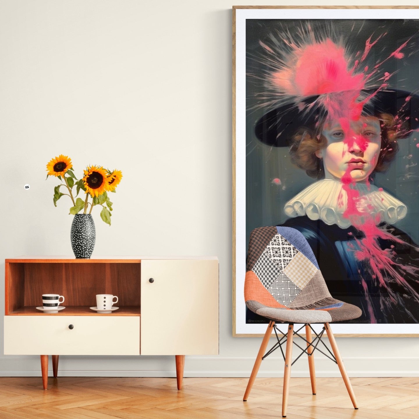 Para obras enmarcadas, sugerimos quitar con cuidado el embalaje protector y colgarla con la ayuda de dos personas, usando clavos resistentes. En el caso de obras de gran tamaño, si es posible, utiliza tornillos y tacos de pared.