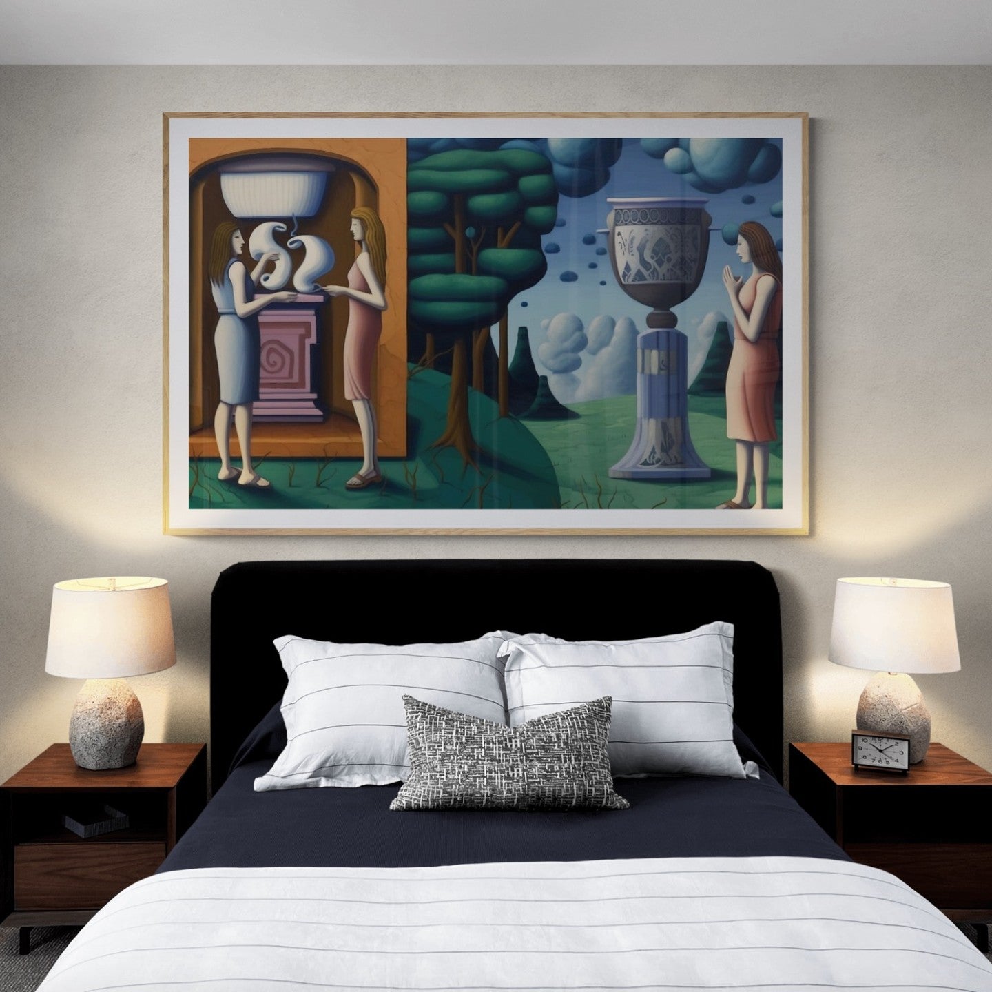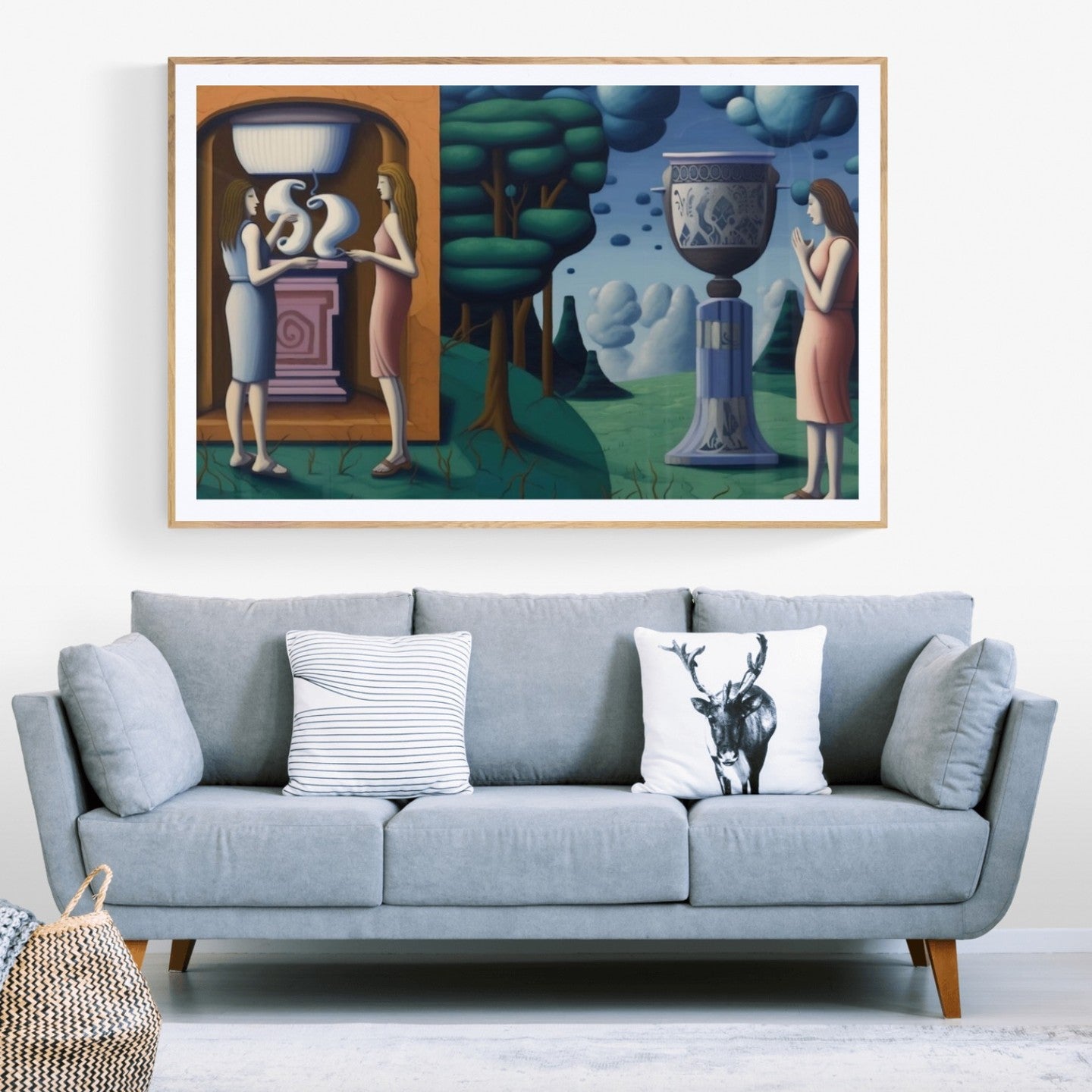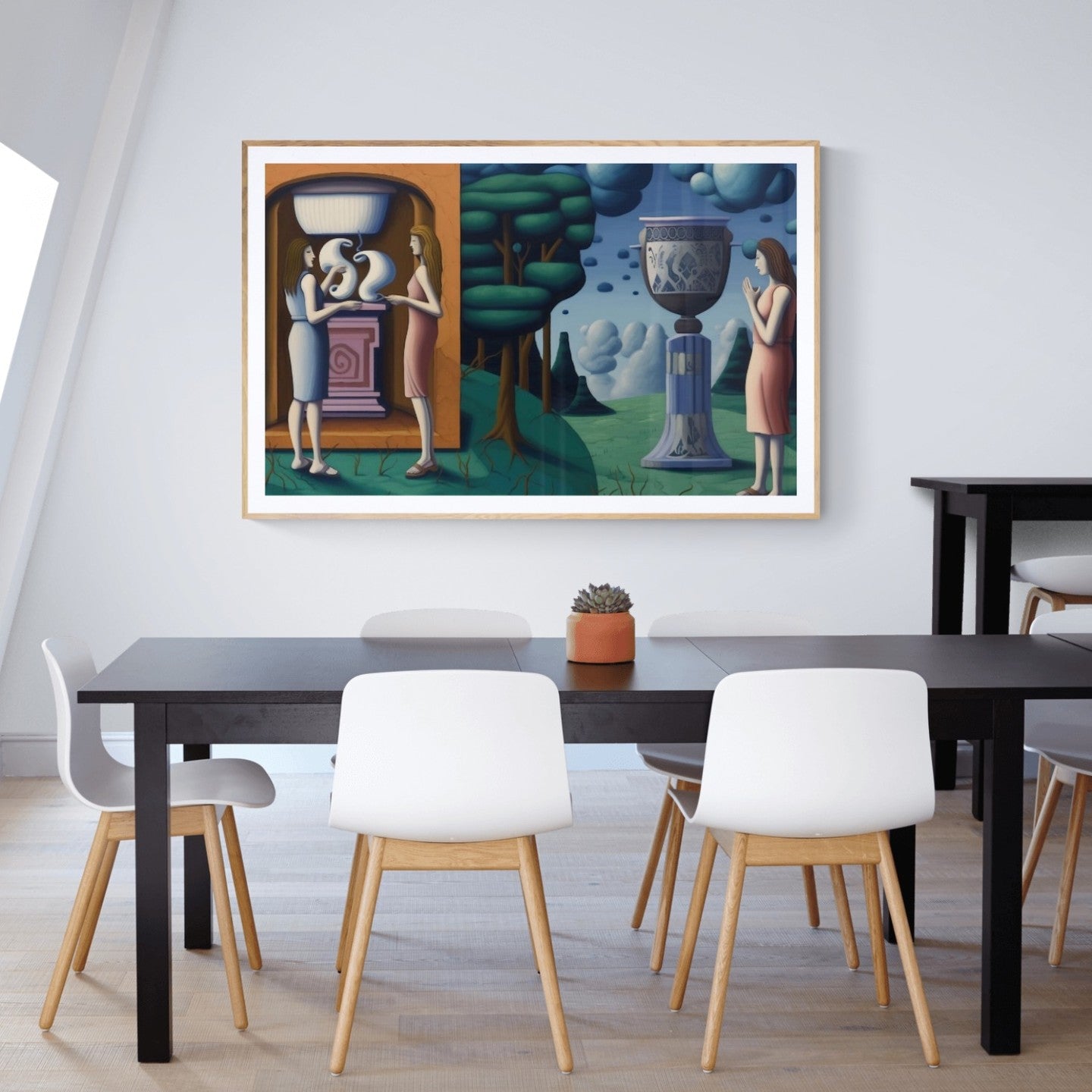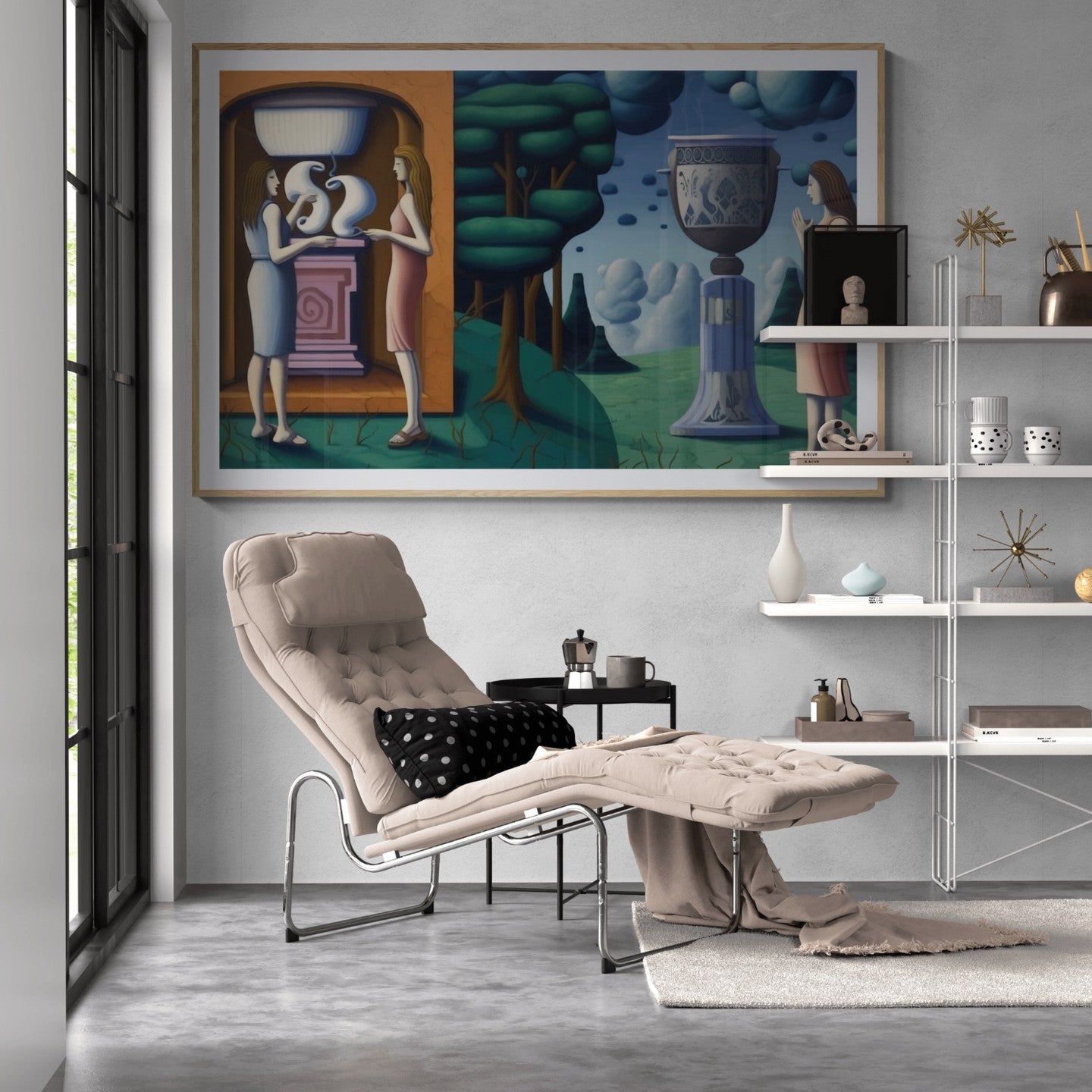 Para obras enmarcadas, sugerimos quitar con cuidado el embalaje protector y colgarla con la ayuda de dos personas, usando clavos resistentes. En el caso de obras de gran tamaño, si es posible, utiliza tornillos y tacos de pared.