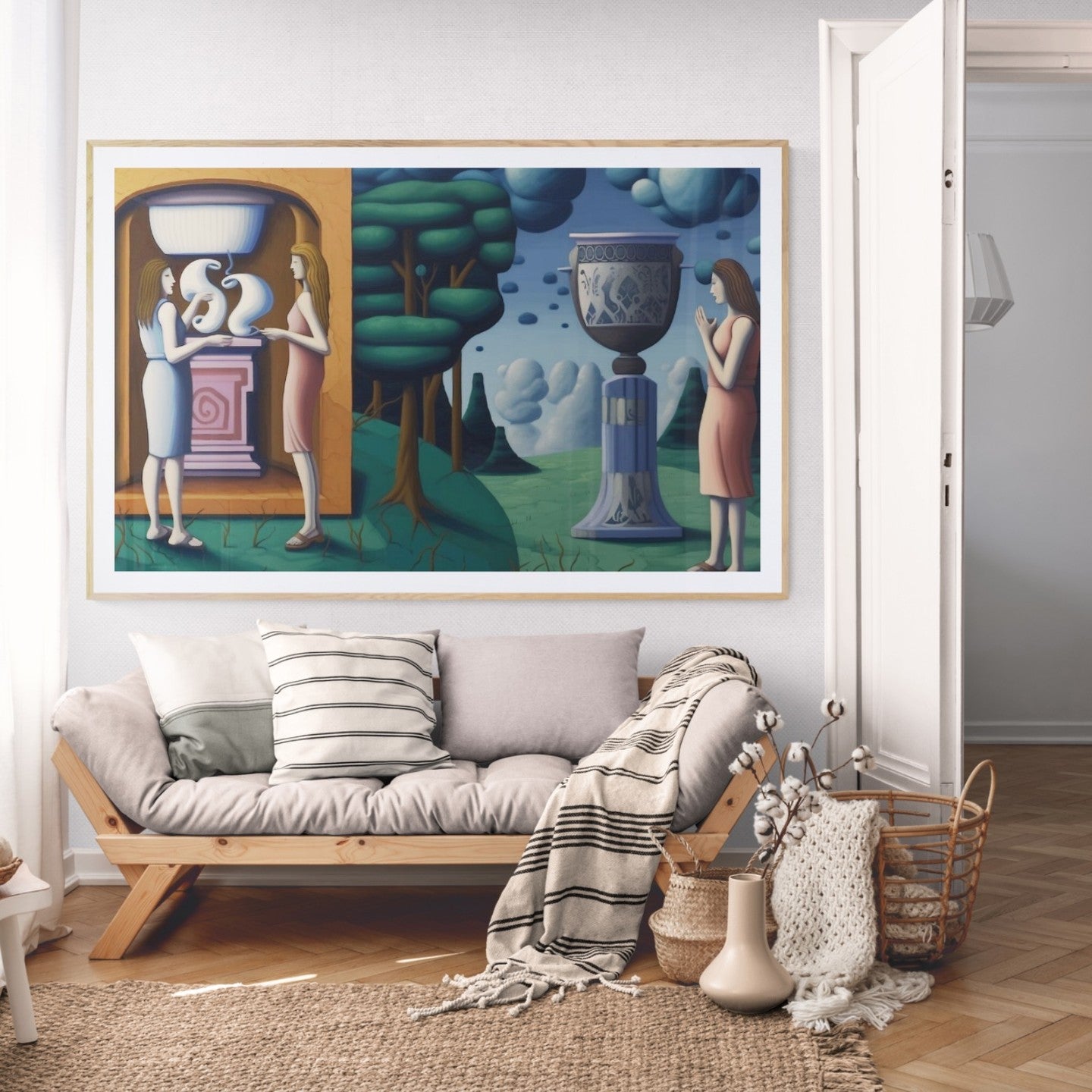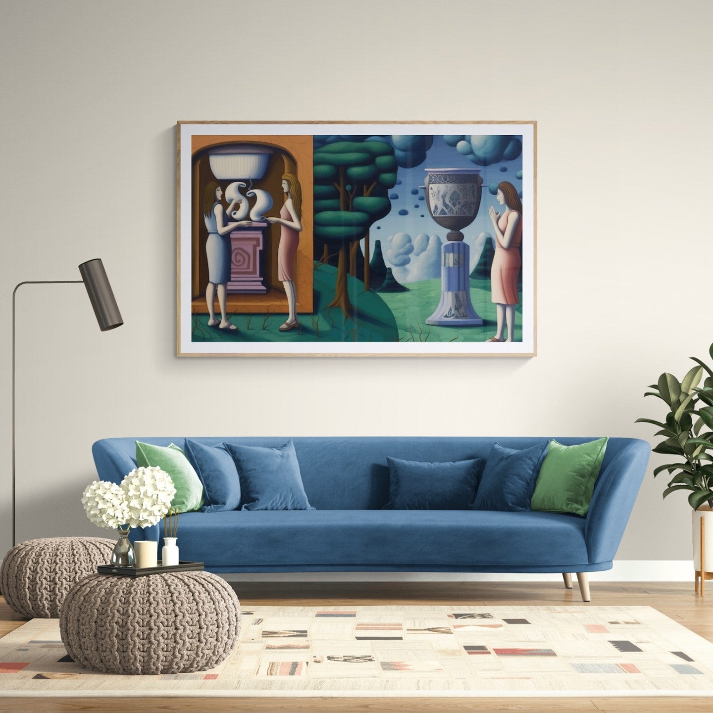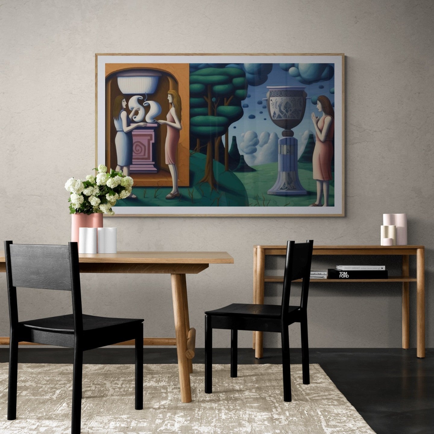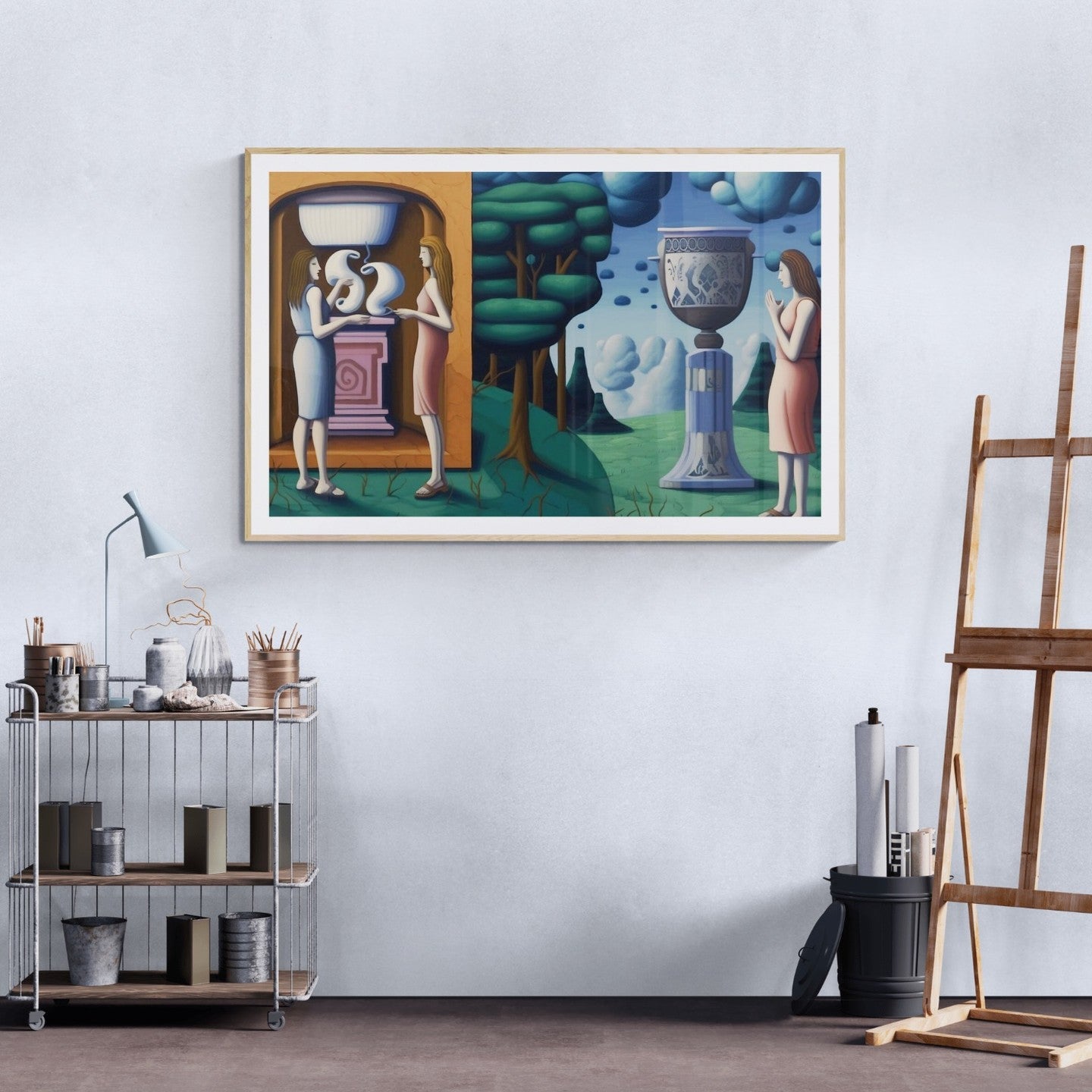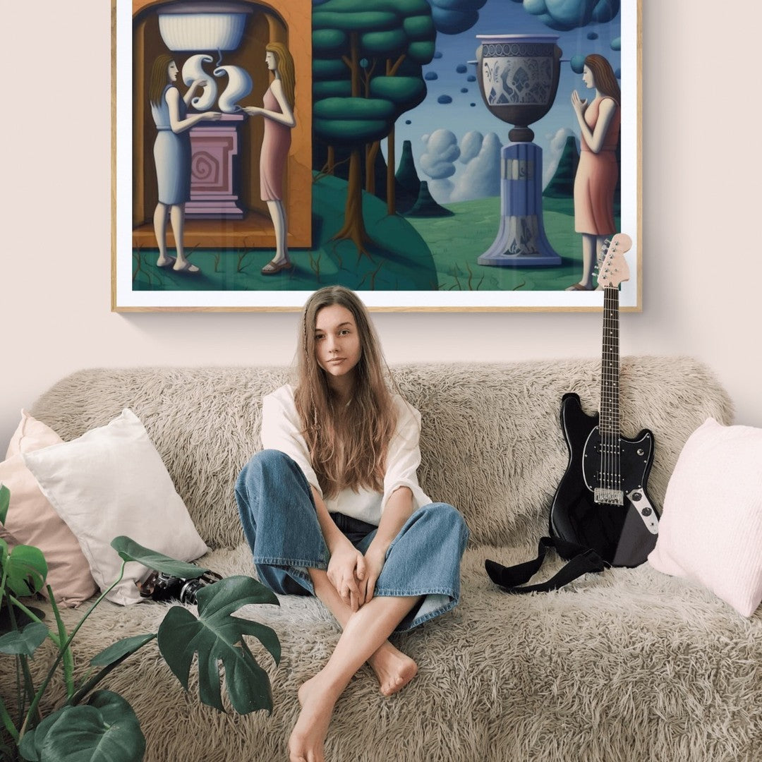 Para obras enmarcadas, sugerimos quitar con cuidado el embalaje protector y colgarla con la ayuda de dos personas, usando clavos resistentes. En el caso de obras de gran tamaño, si es posible, utiliza tornillos y tacos de pared.