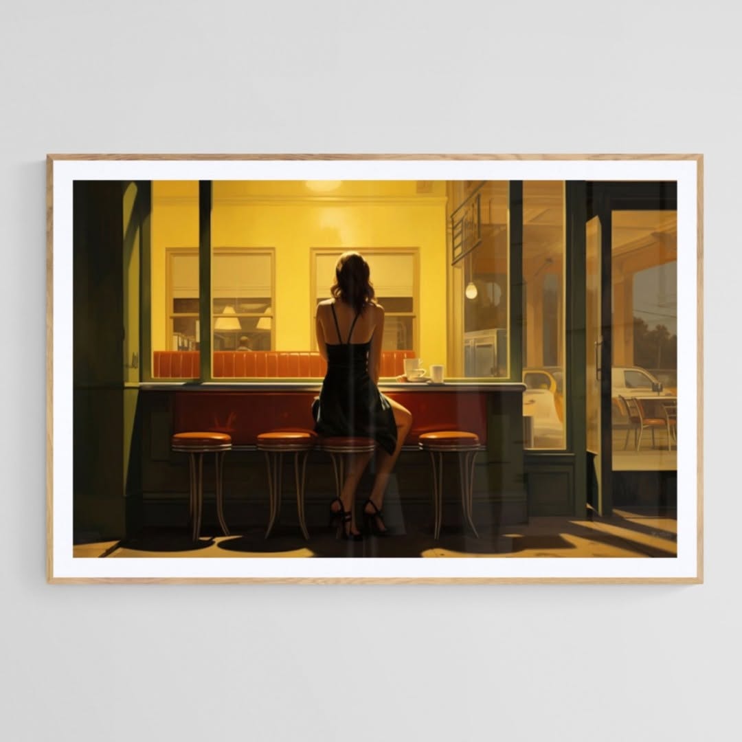 Edward Hopper style art painting - woman alone at a bar at night.