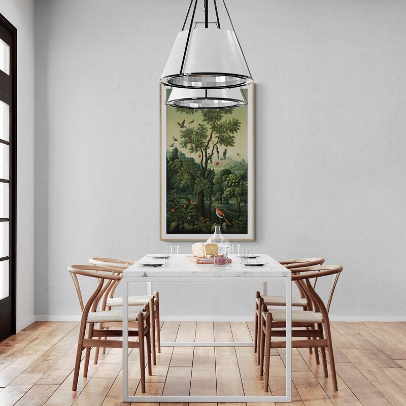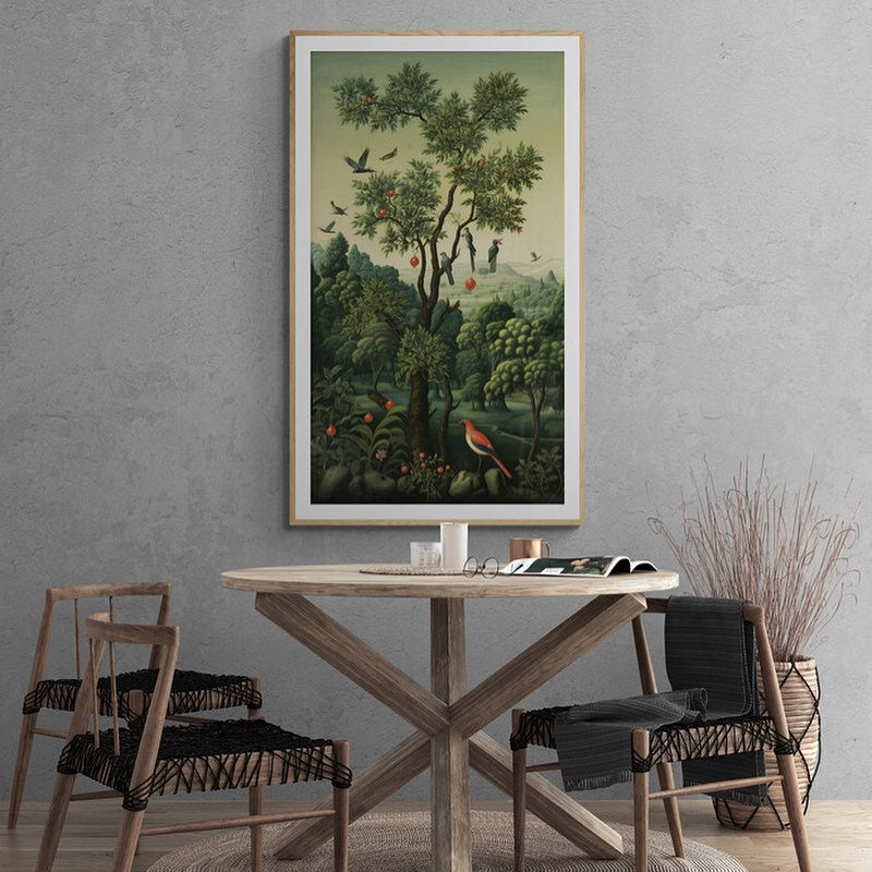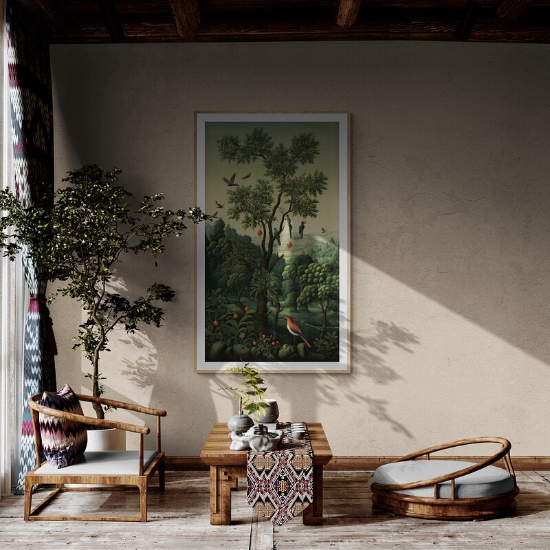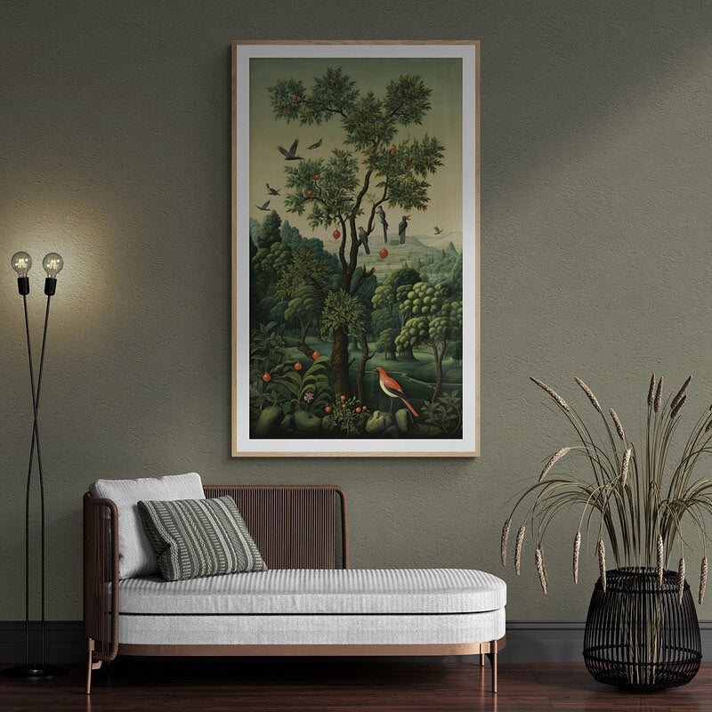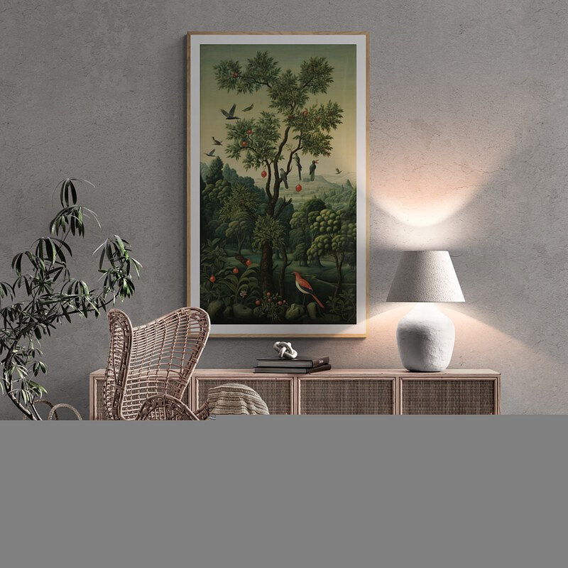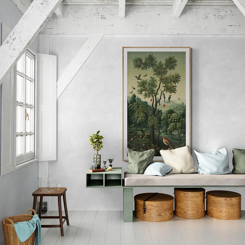 Para obras enmarcadas, sugerimos quitar con cuidado el embalaje protector y colgarla con la ayuda de dos personas, usando clavos resistentes. En el caso de obras de gran tamaño, si es posible, utiliza tornillos y tacos de pared.