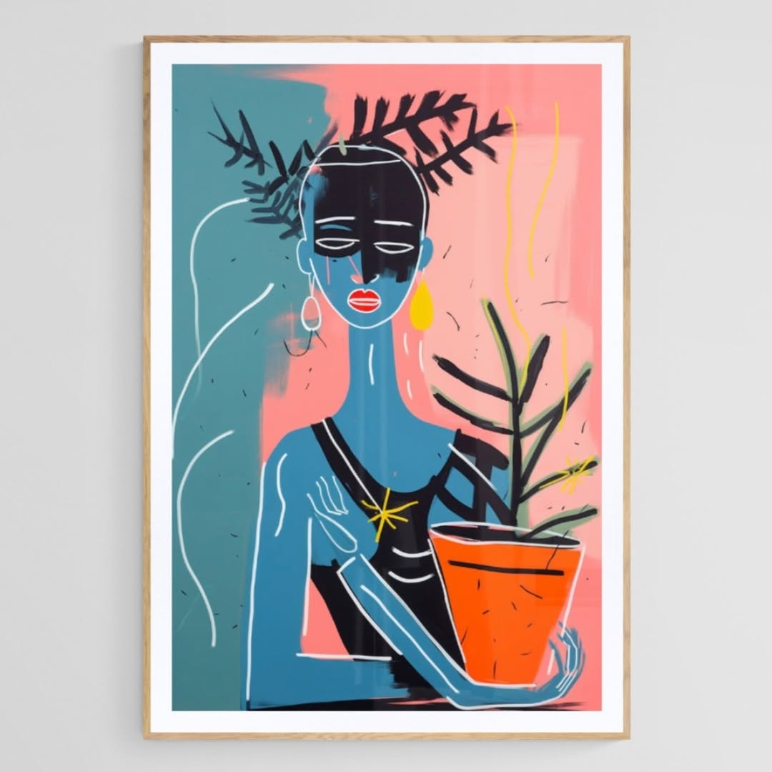African style tropical rectangular painting with blue person and plant in pink background.