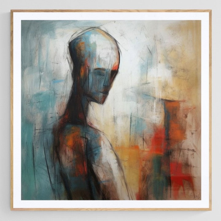 Abstract painting and sketch of a person in cold tones.
