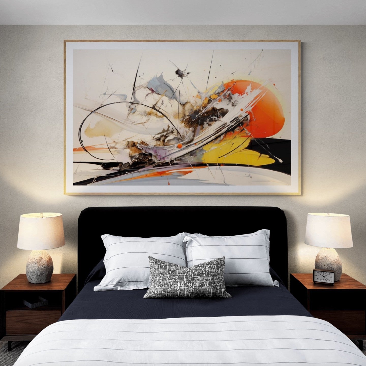 Abstract colorful painting with splashes of color in red, yellow, gray and black in Julie Mehretu style art.