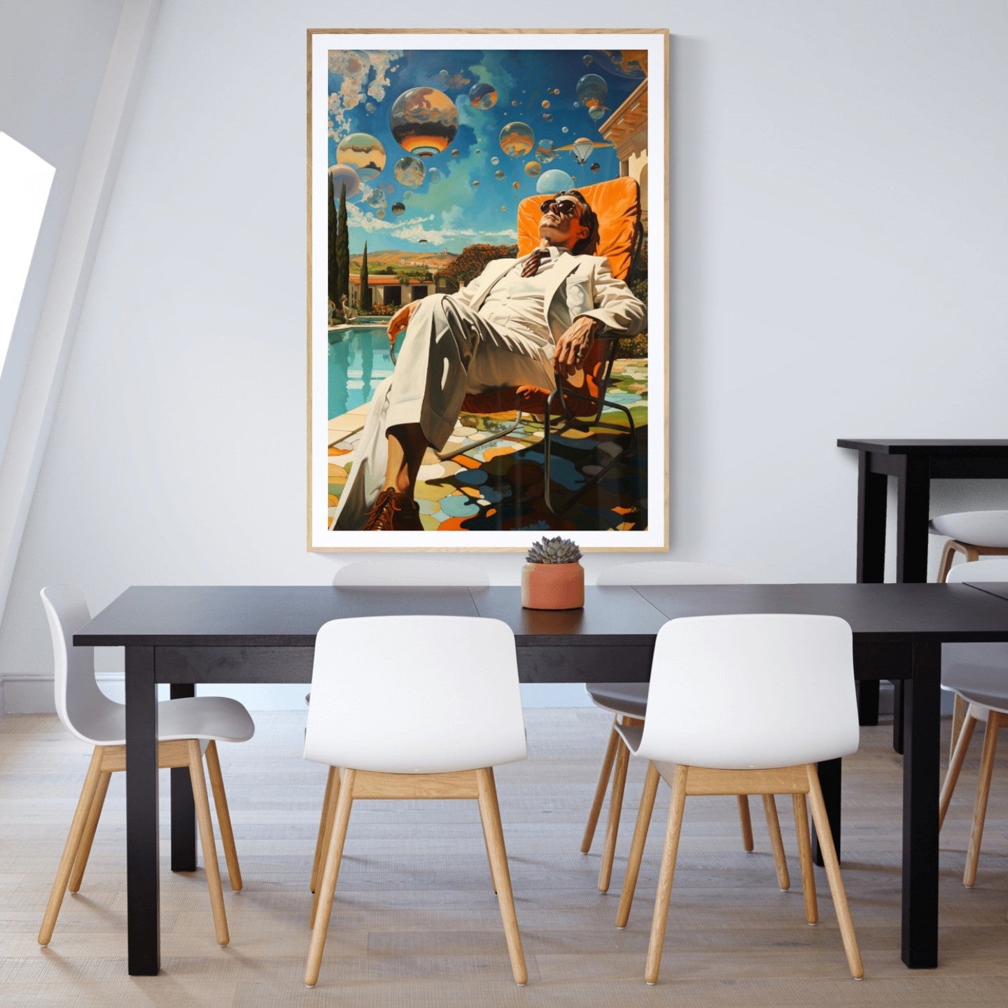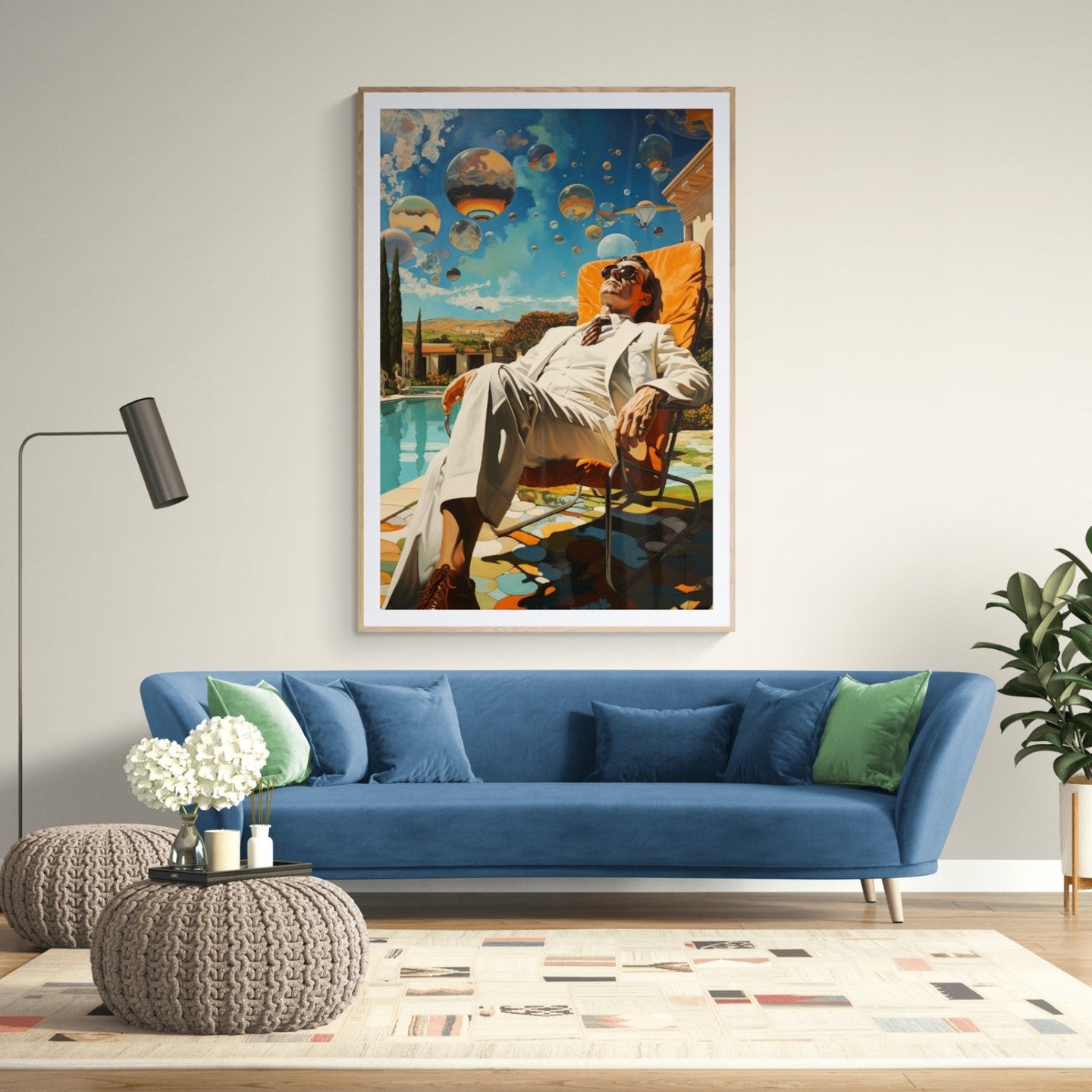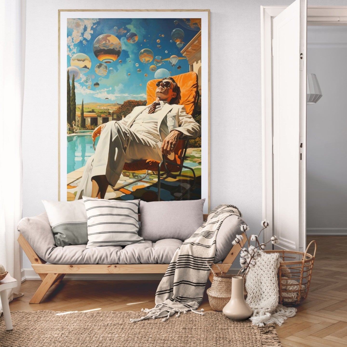 Abstract painting of a man in the 1980s next to a swimming pool with surrealist bubbles in the air.