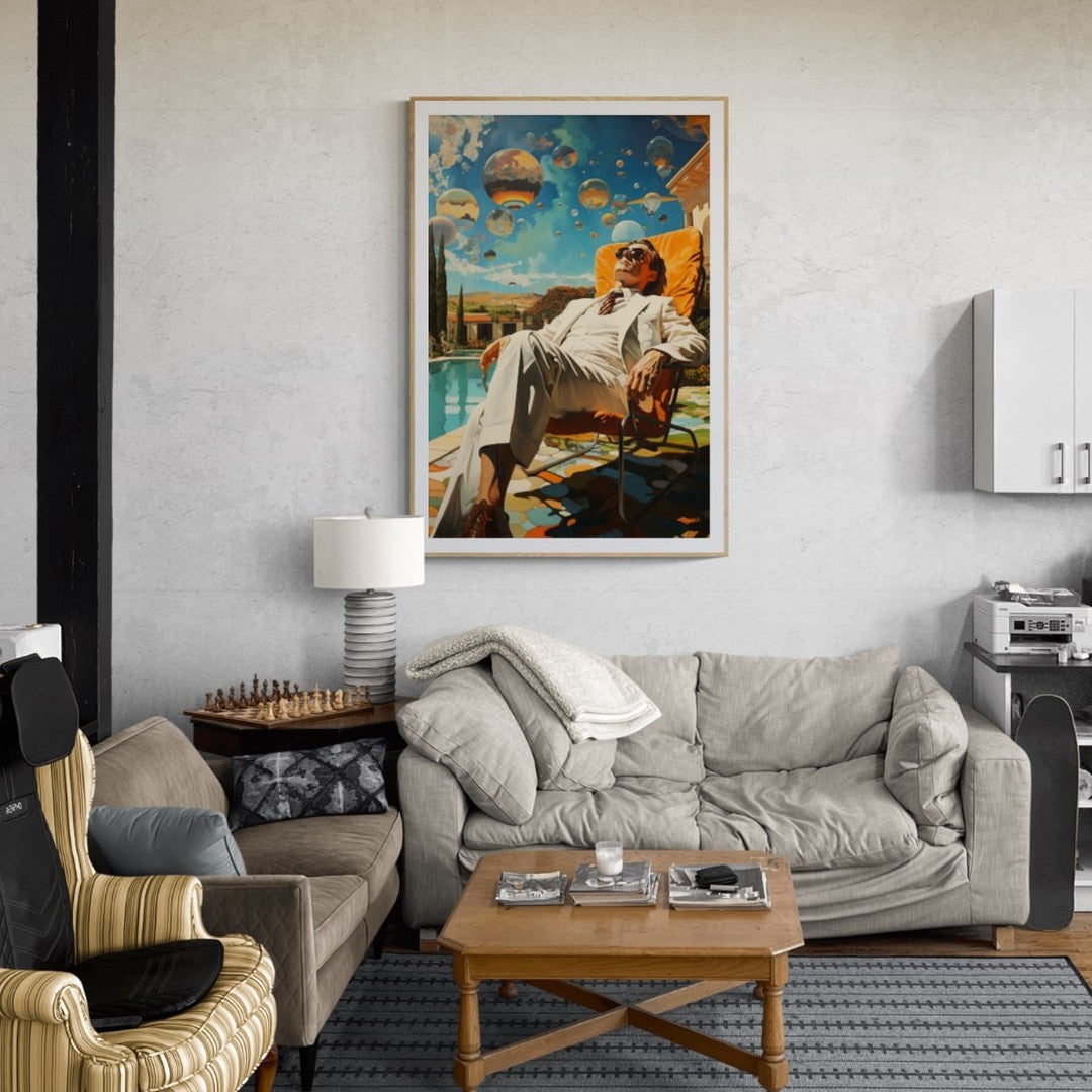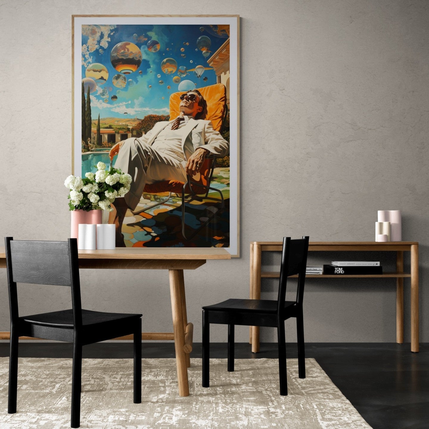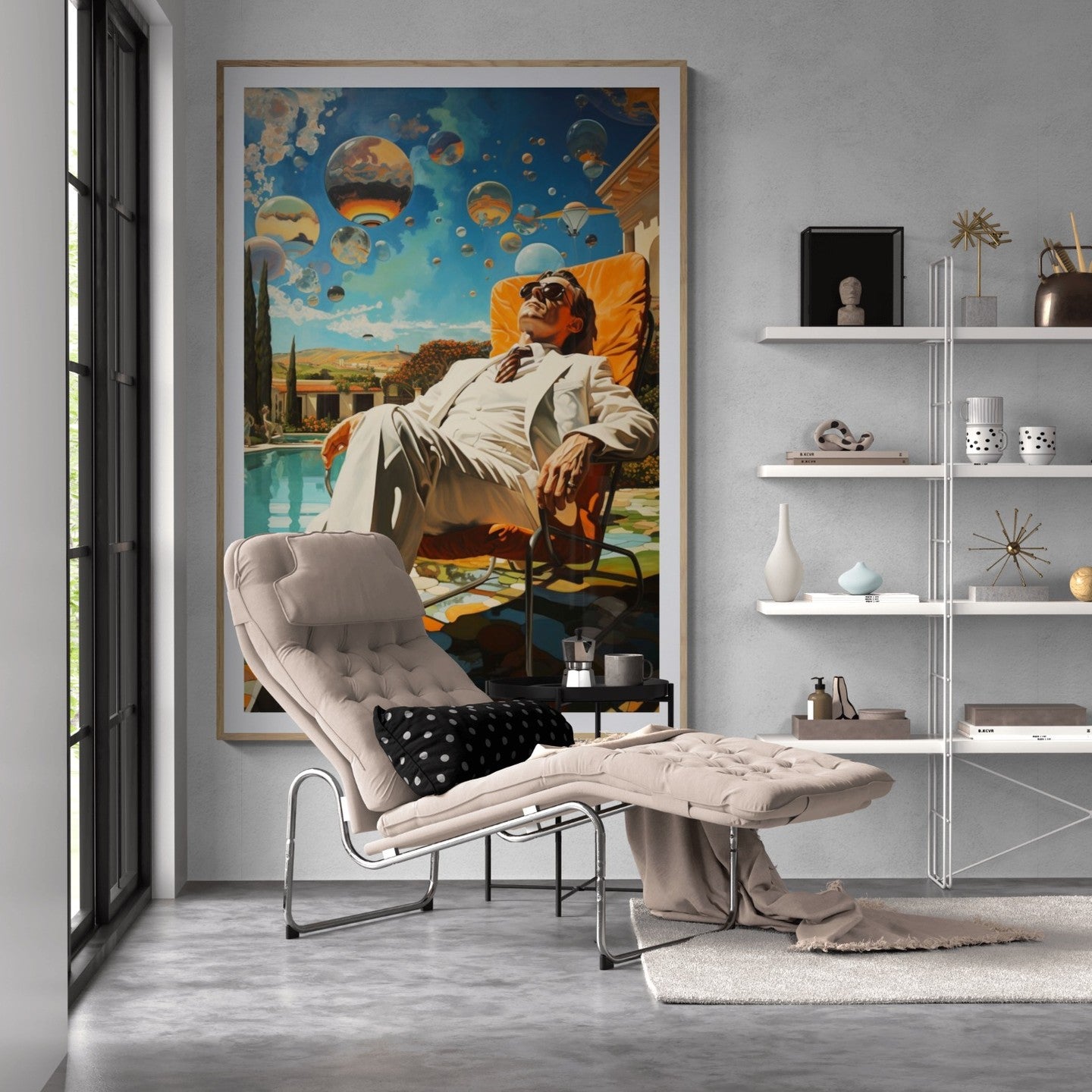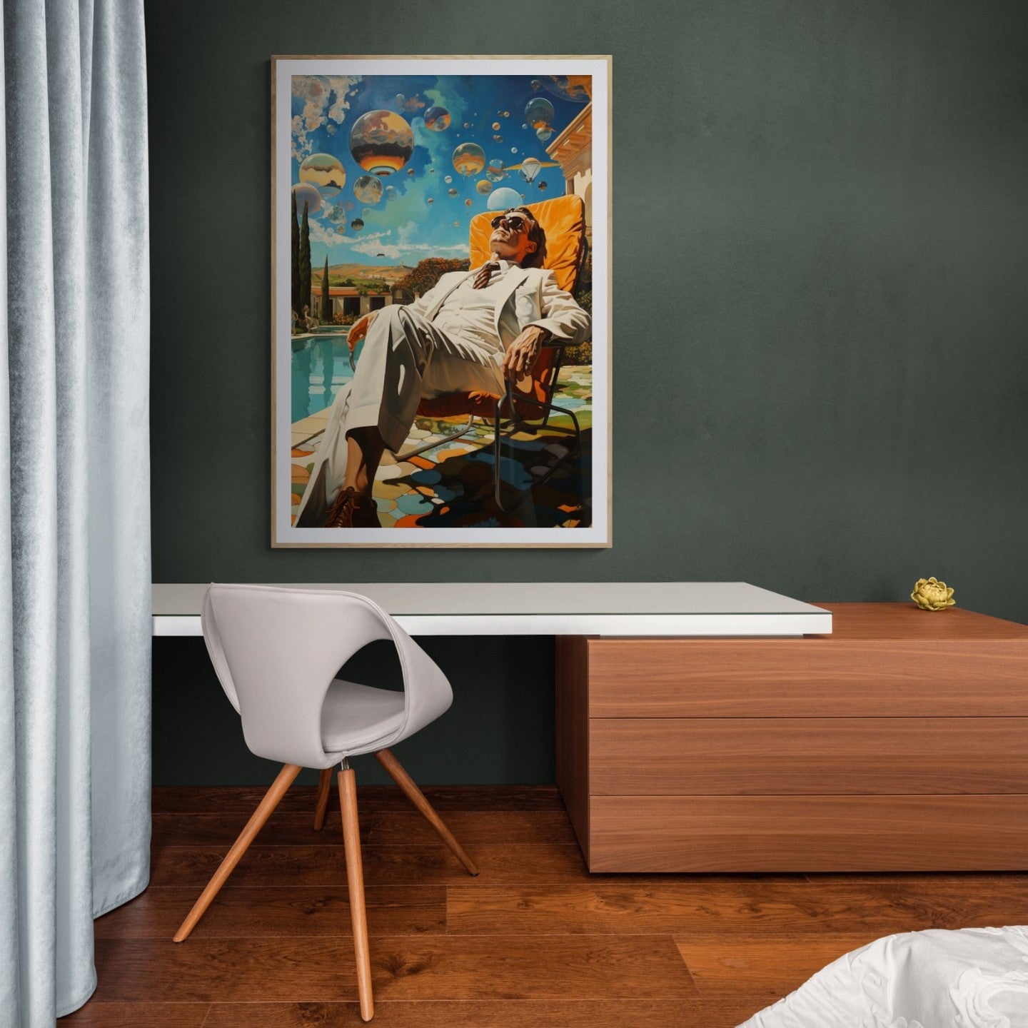 Abstract painting of a man in the 1980s next to a swimming pool with surrealist bubbles in the air.