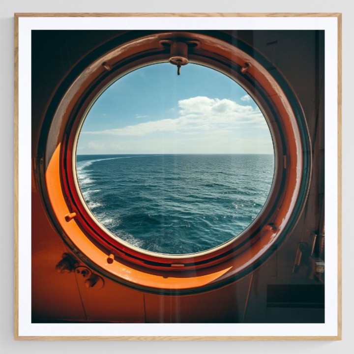 A photograph overlooking the open sea through an orange boat porthole.