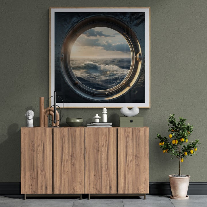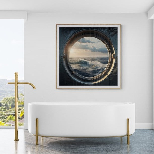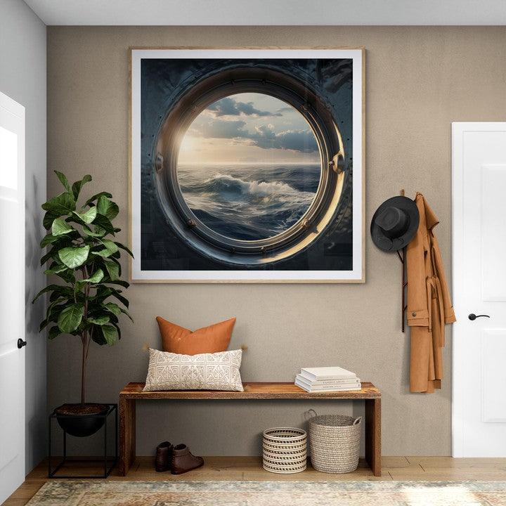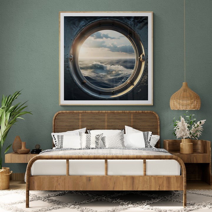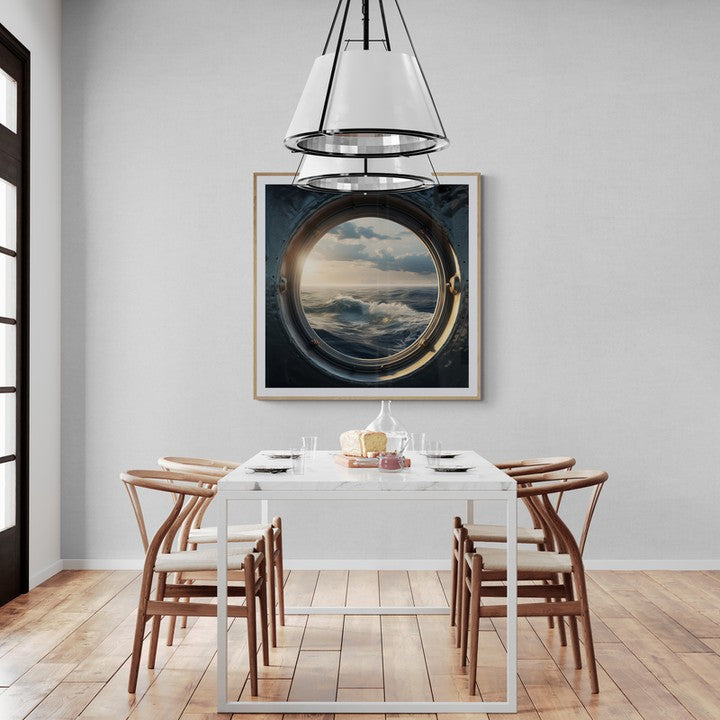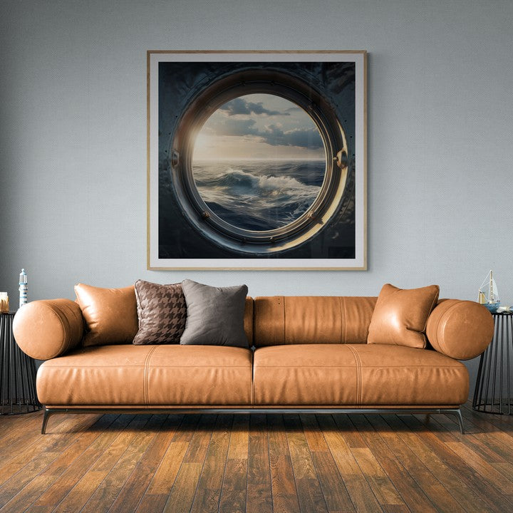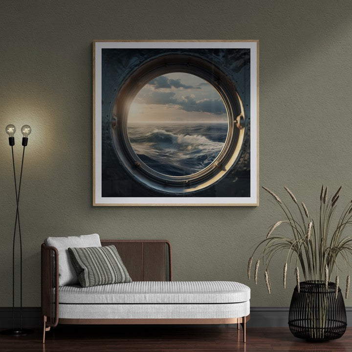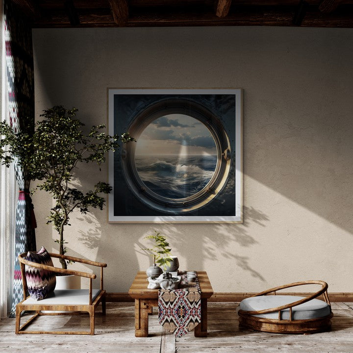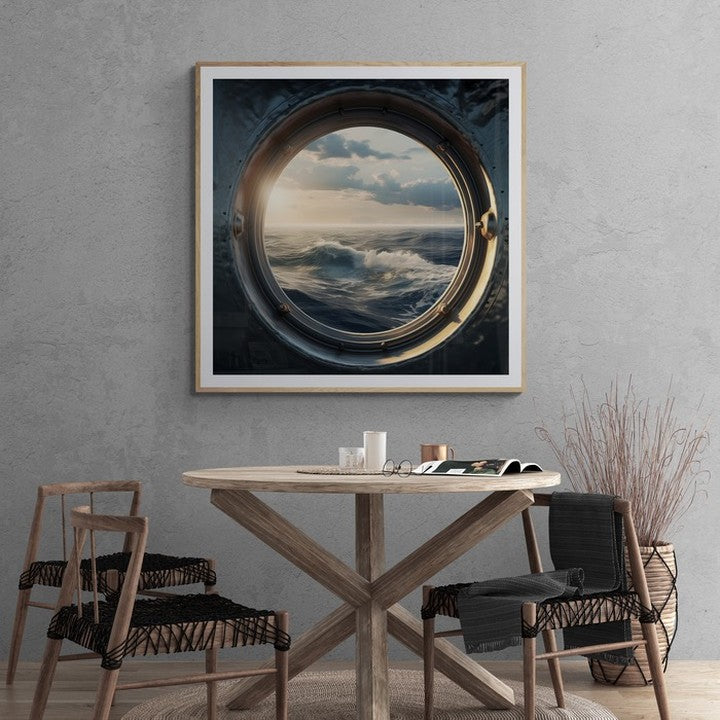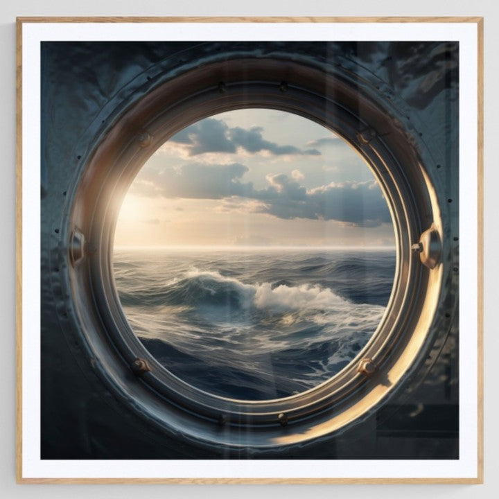 A photograph overlooking the open sea through a boat porthole reminiscent of Interstellar.