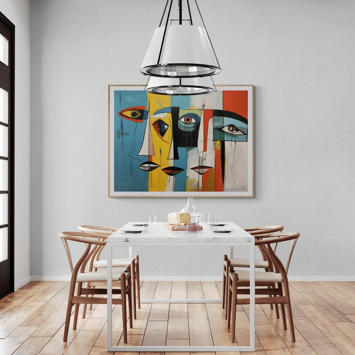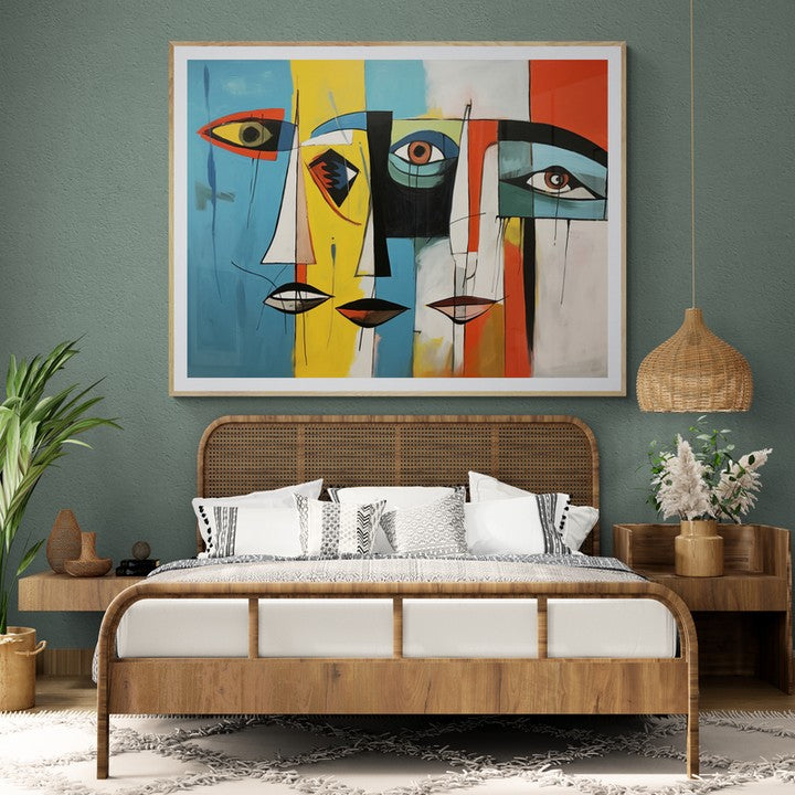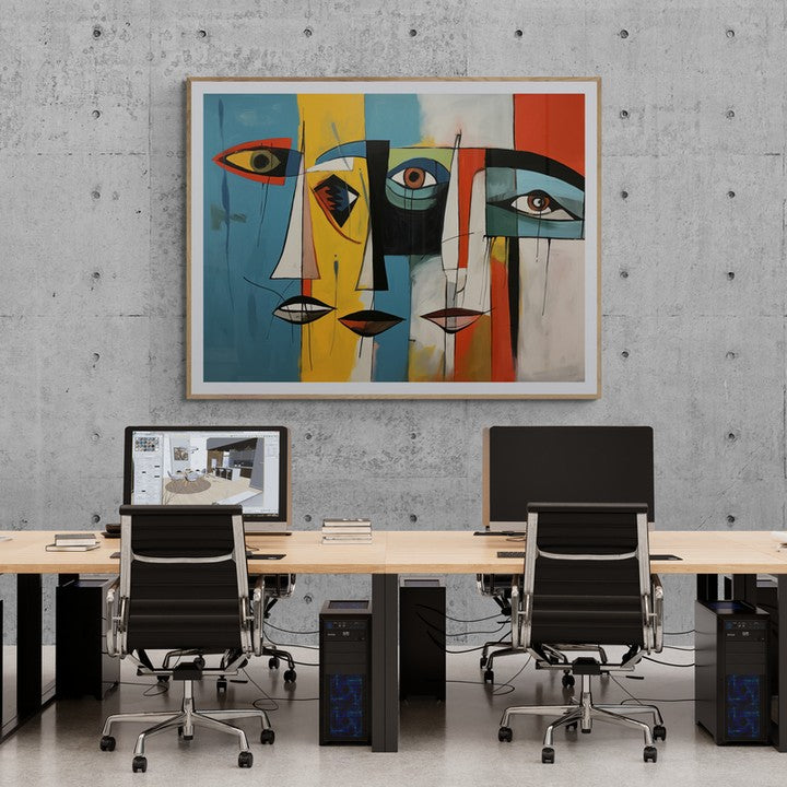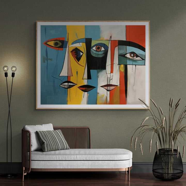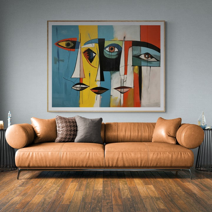 Three abstract flat sketch of faces in cubist colorful mood century style.
