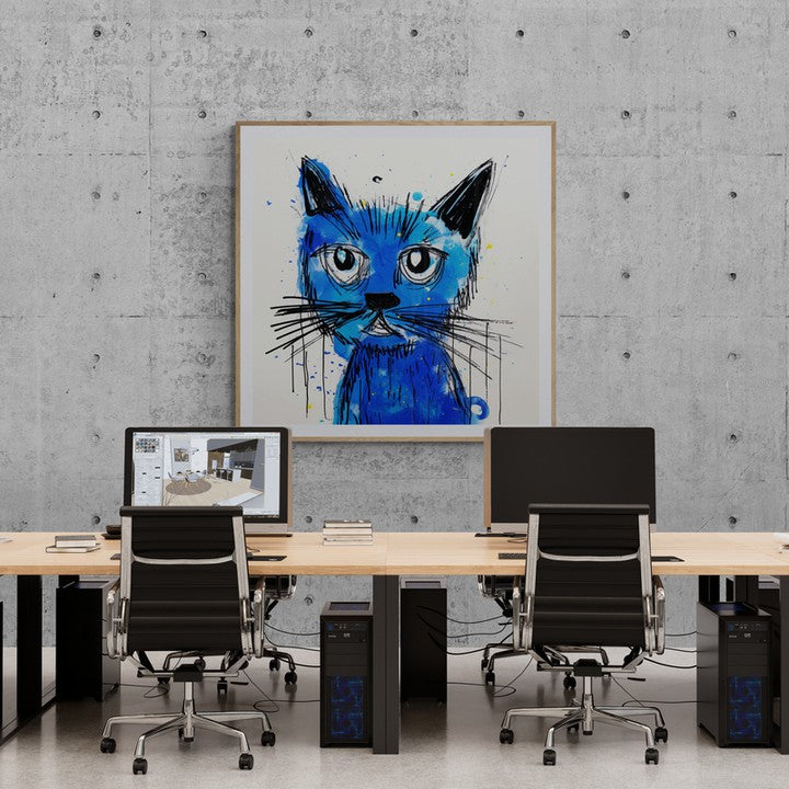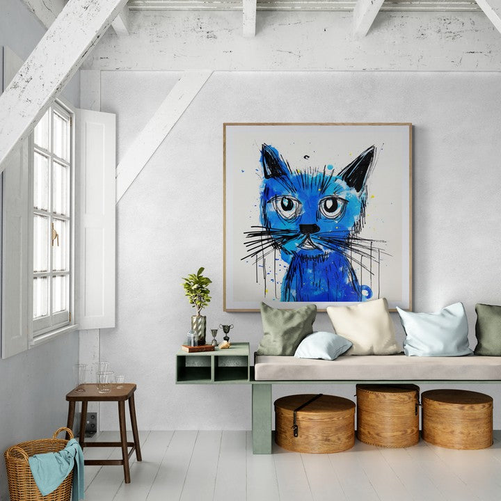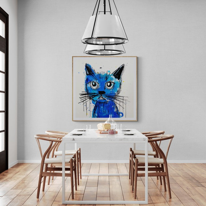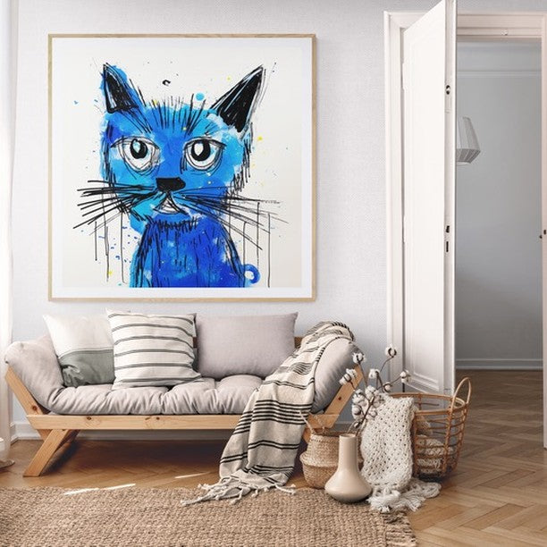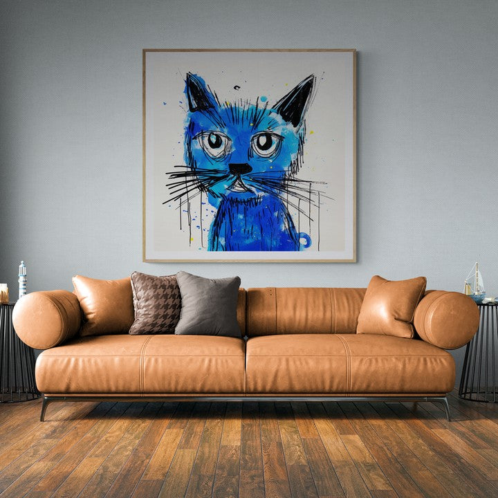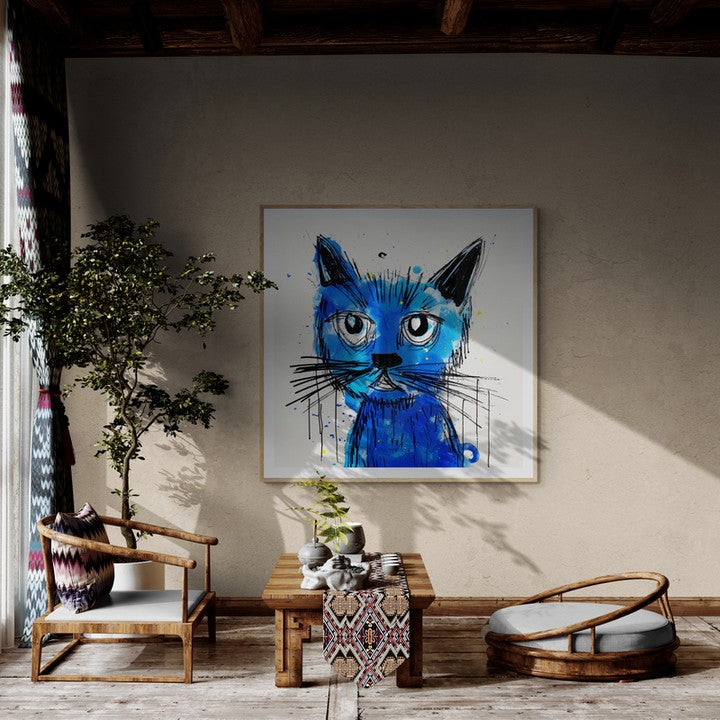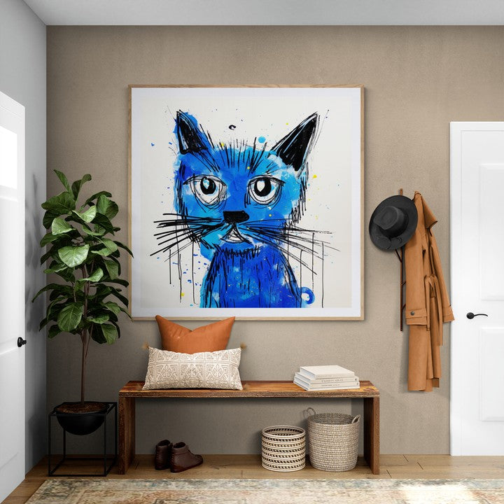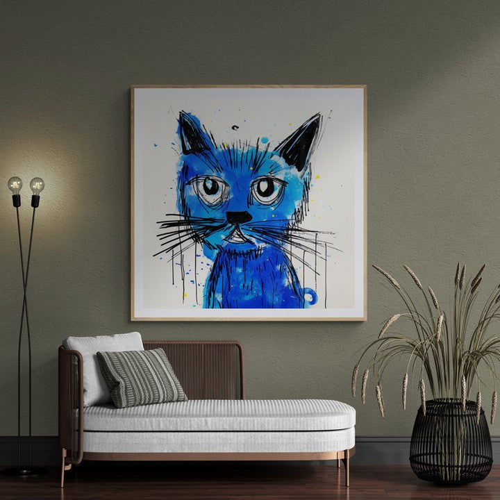 Blue watercolor and black pen simple cartoon sketch of a cat.