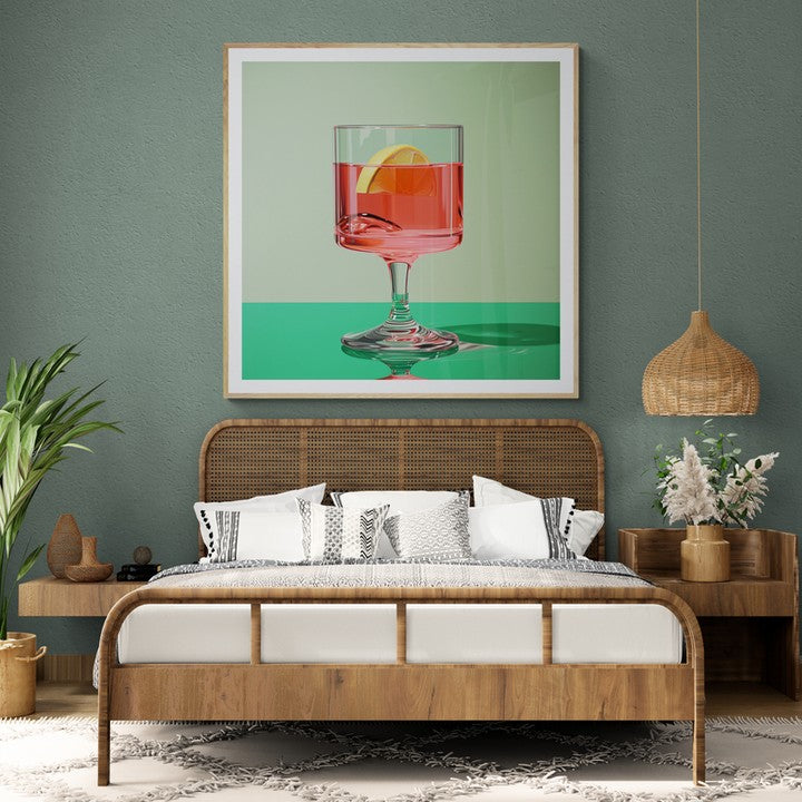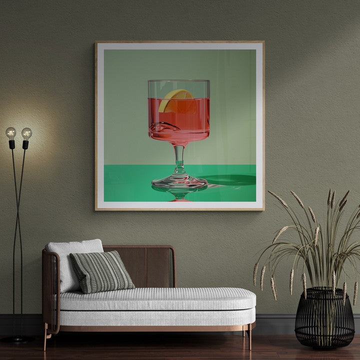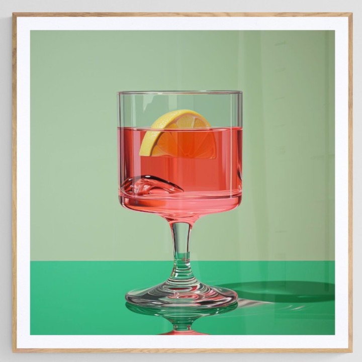 A pink drink with lemon wedge sitting on a green countertop and background.