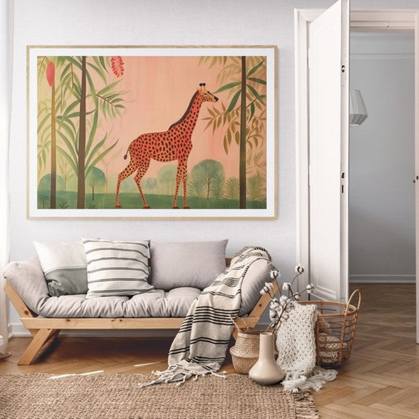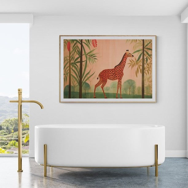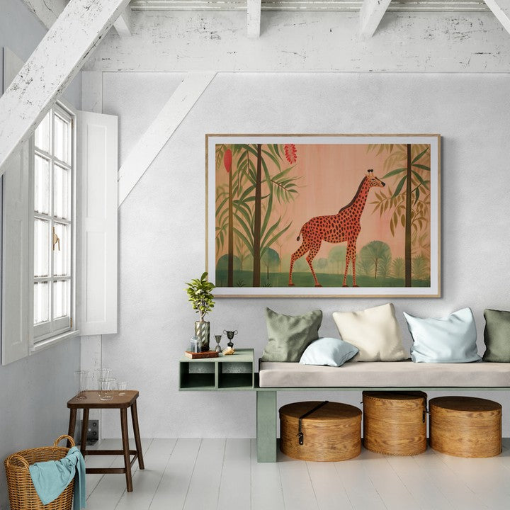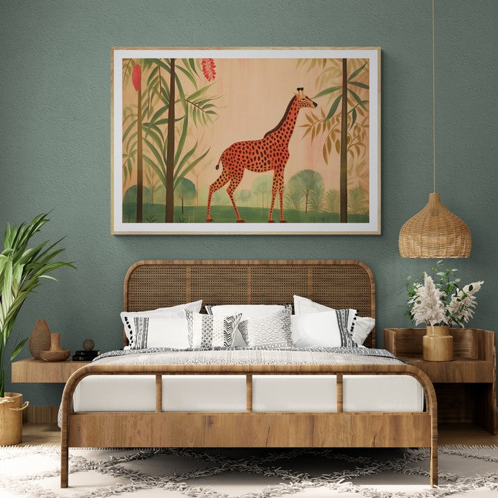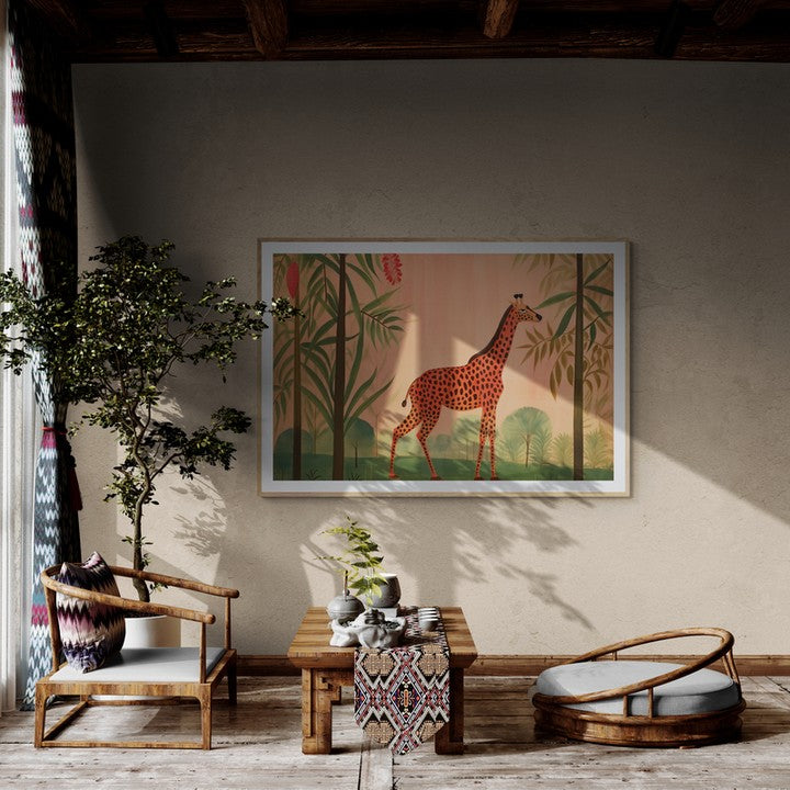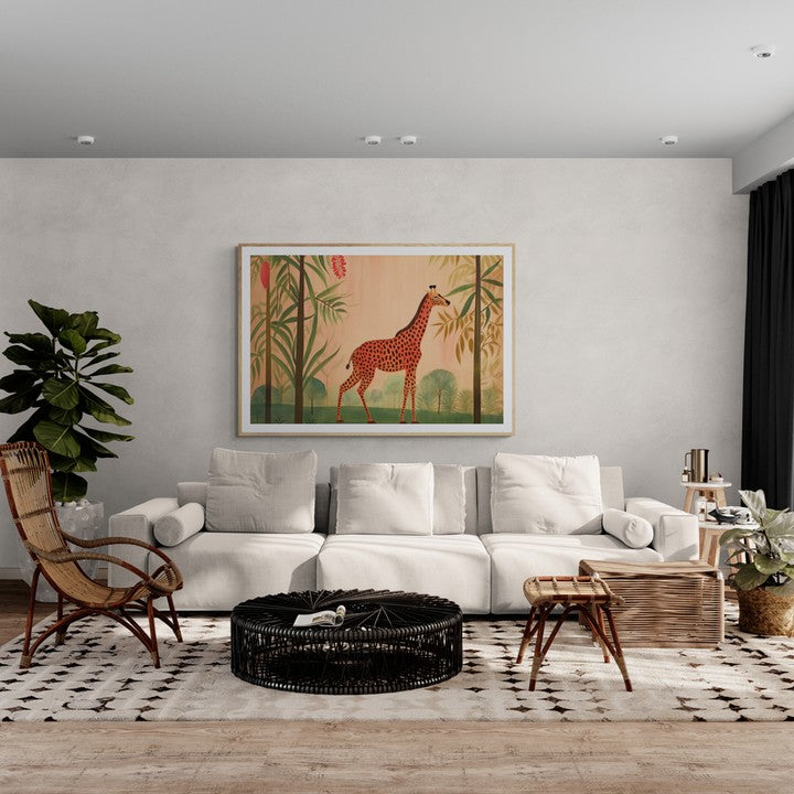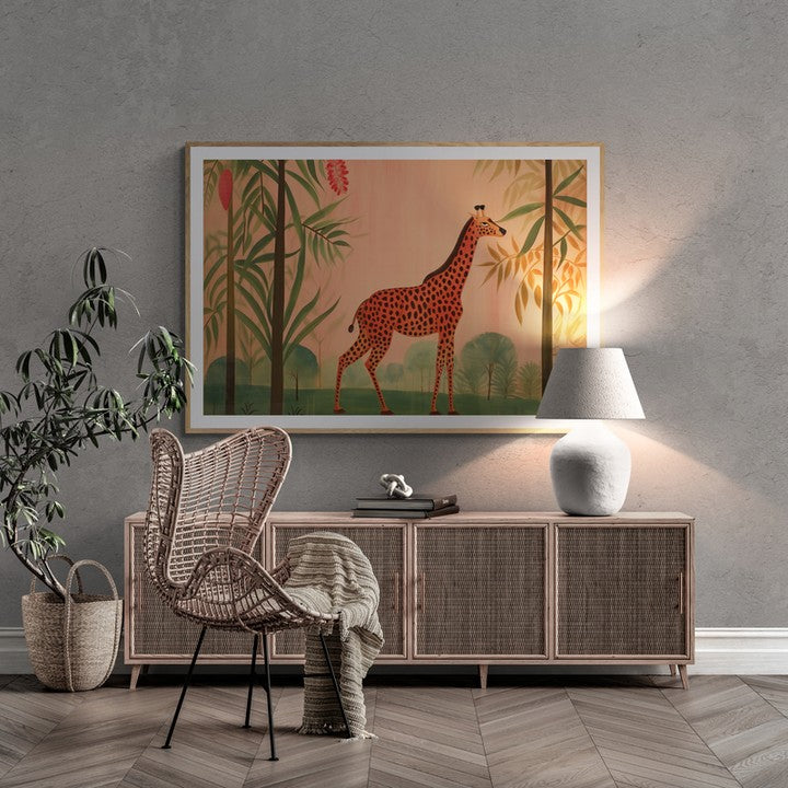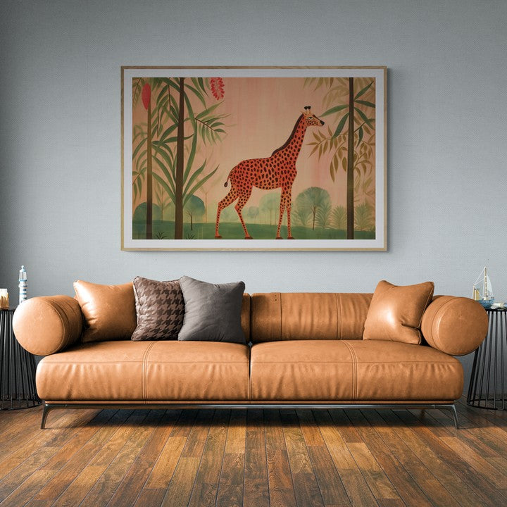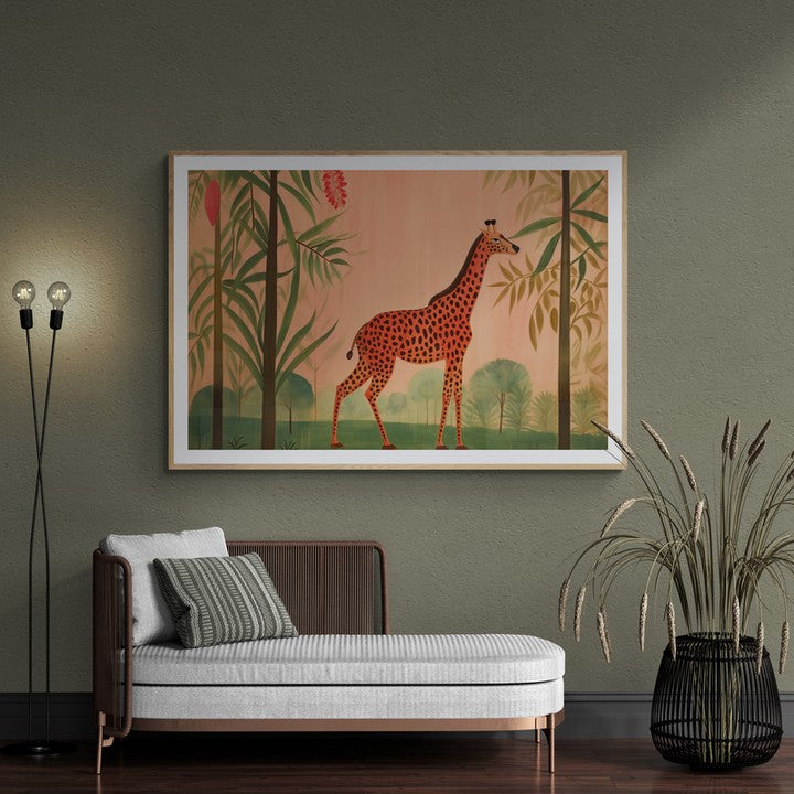 A picture of a Giraffe walking in the rainforest in Indian colonial vintage art style.