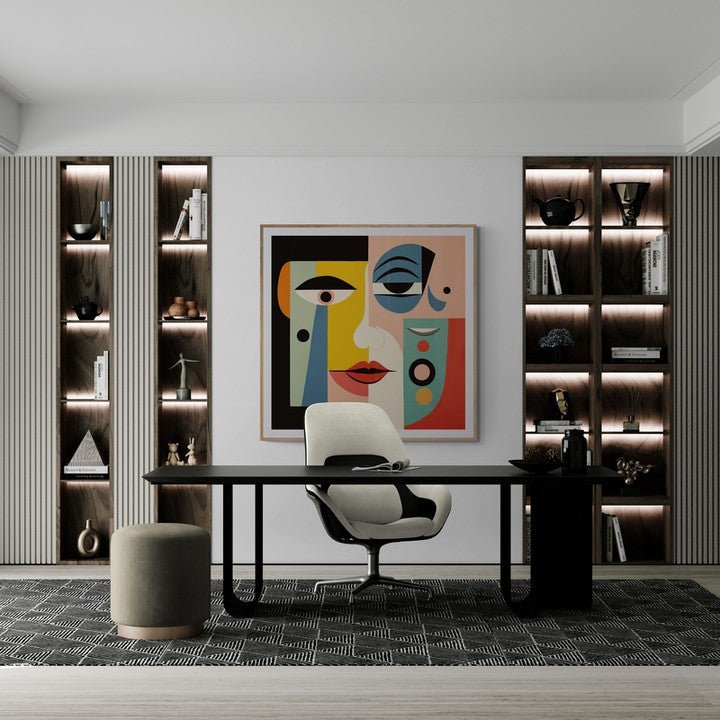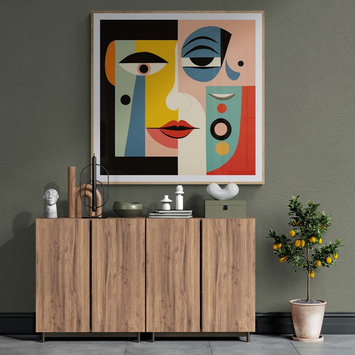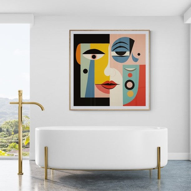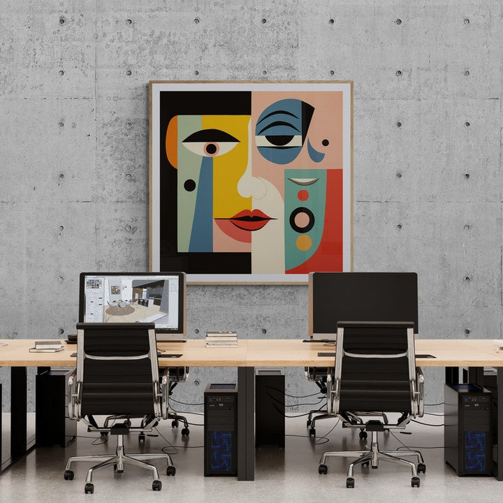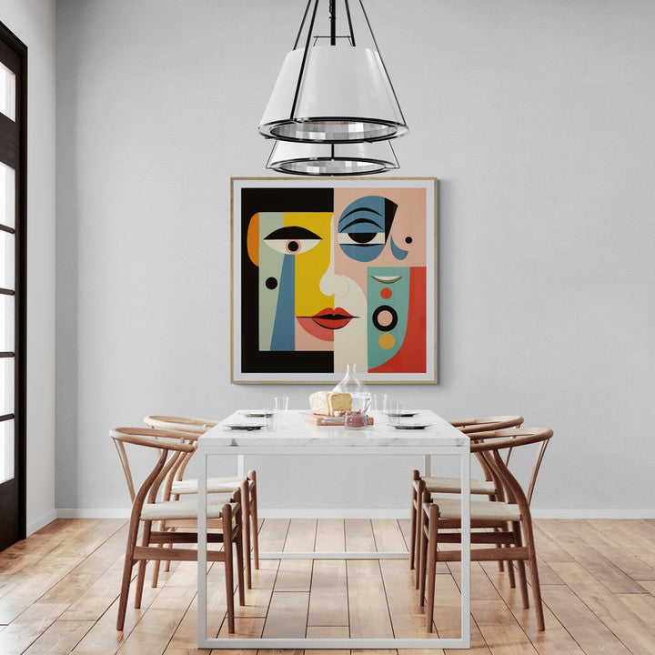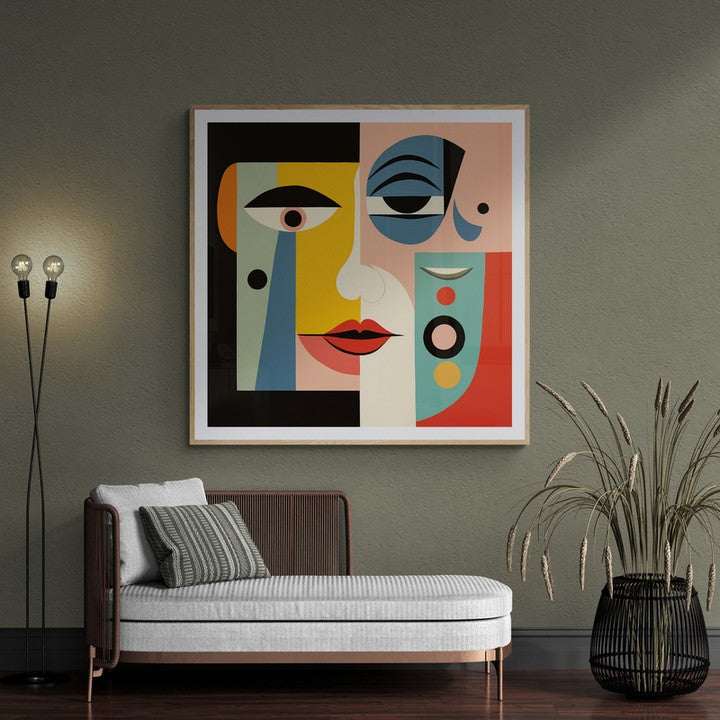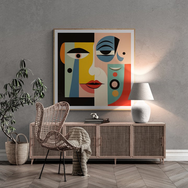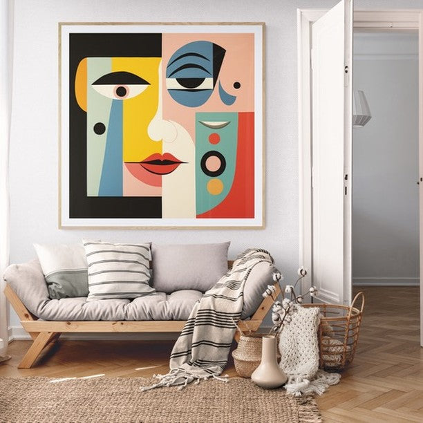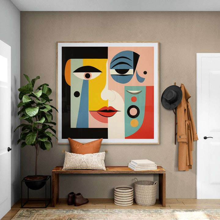 Cubist, colorful, minimalist square face, a modern take on Picasso style art.