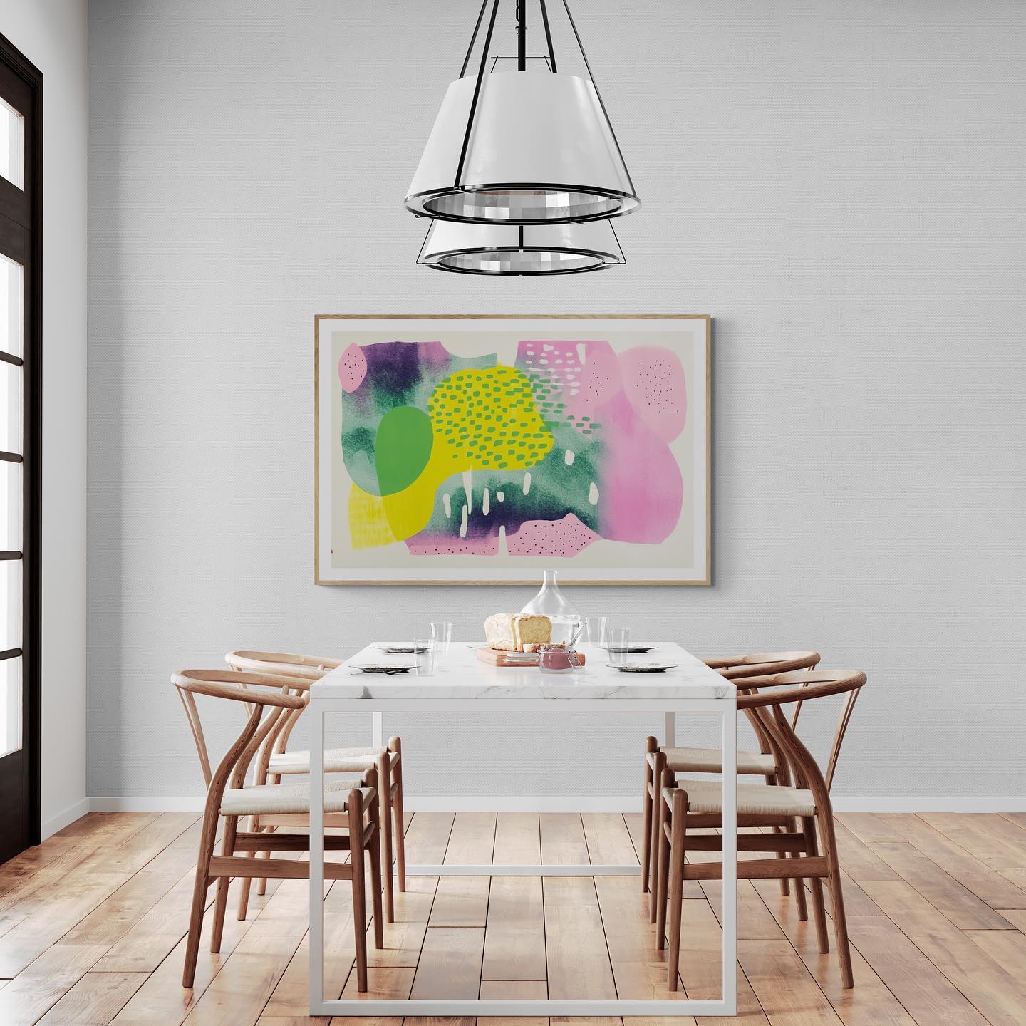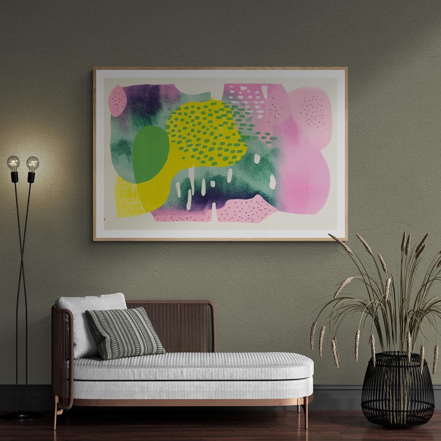 Abstract and colorful blobs of watercolors in green, pink and yellow.