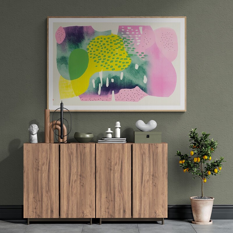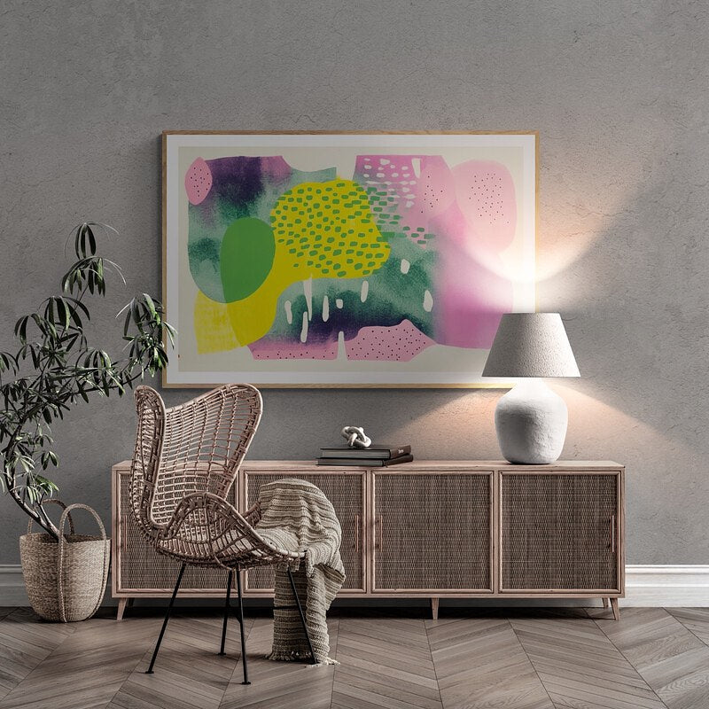 Para obras enmarcadas, sugerimos quitar con cuidado el embalaje protector y colgarla con la ayuda de dos personas, usando clavos resistentes. En el caso de obras de gran tamaño, si es posible, utiliza tornillos y tacos de pared.