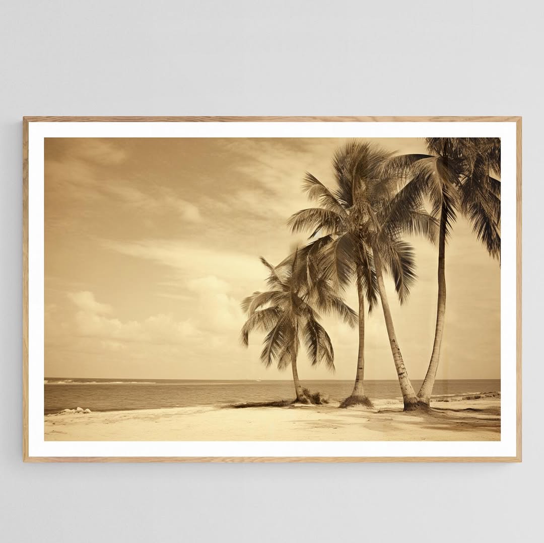Sepia toned vintage colored photograph of a beach with palm trees.