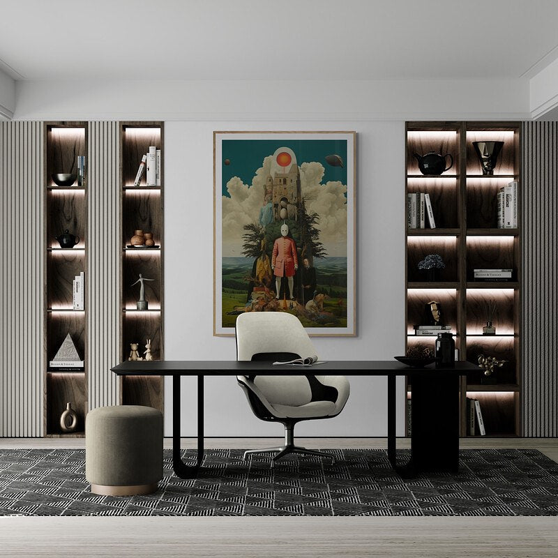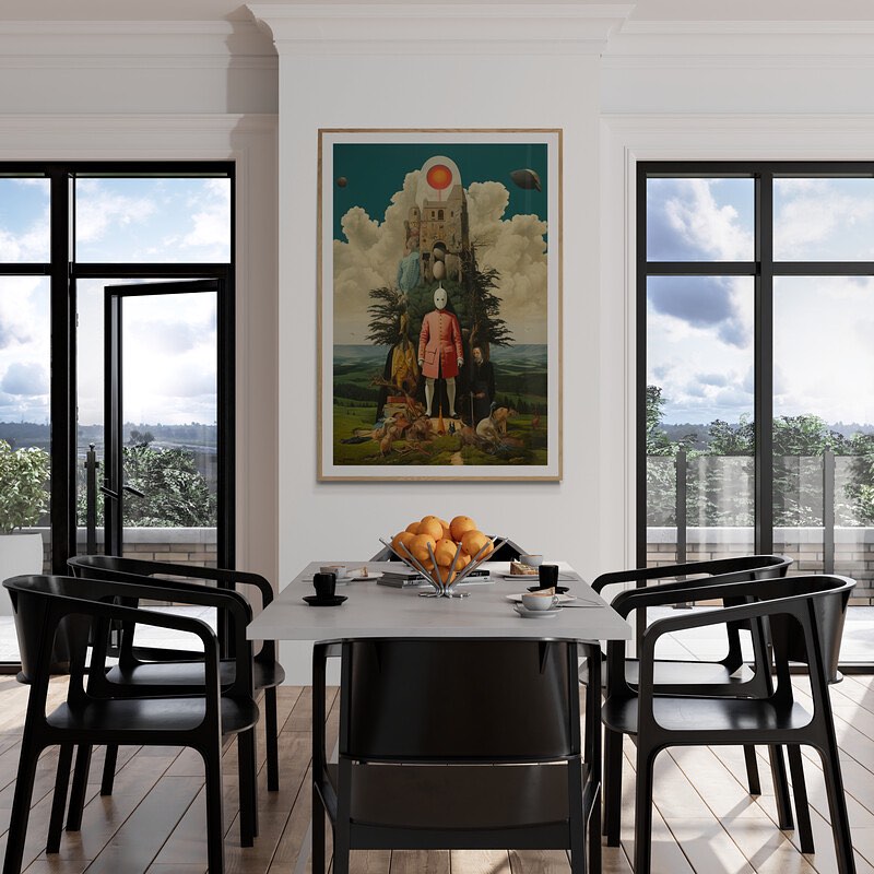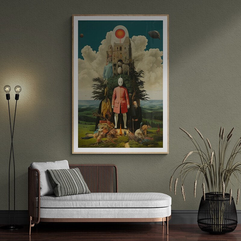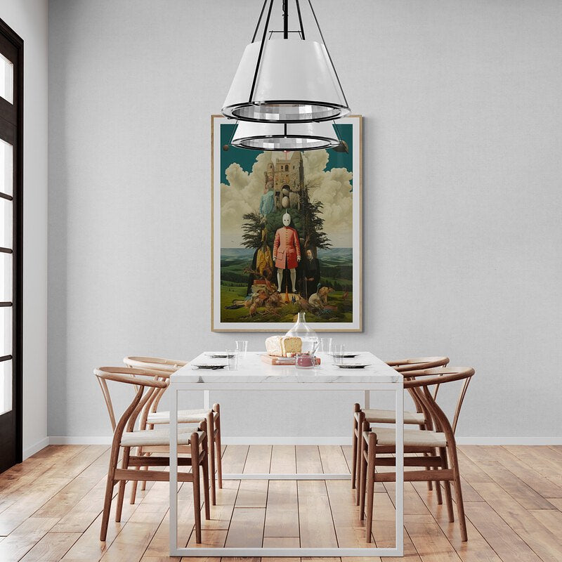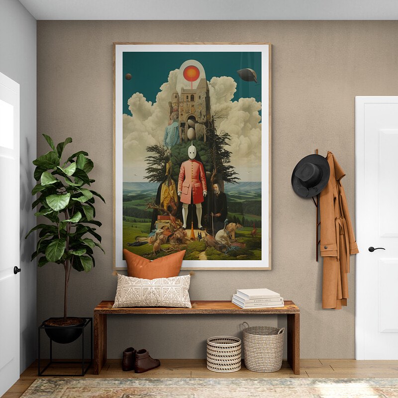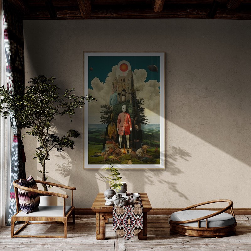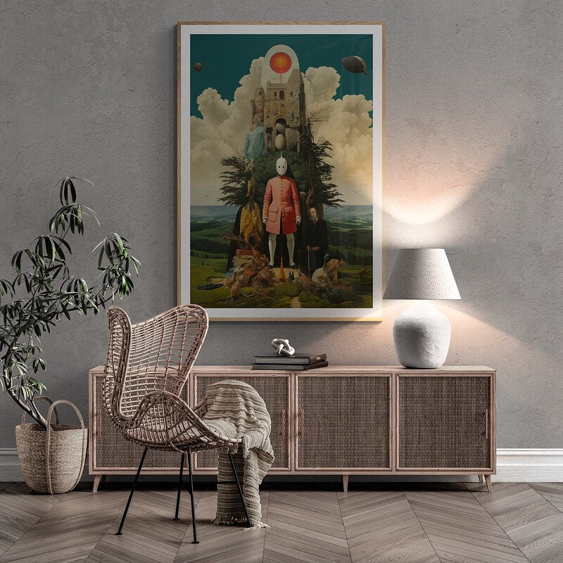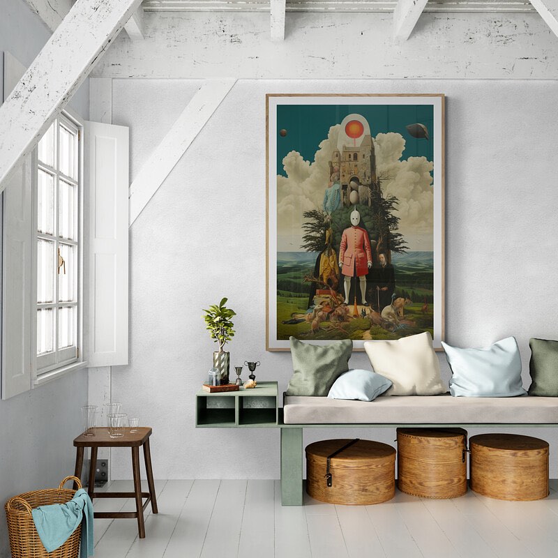 Para obras enmarcadas, sugerimos quitar con cuidado el embalaje protector y colgarla con la ayuda de dos personas, usando clavos resistentes. En el caso de obras de gran tamaño, si es posible, utiliza tornillos y tacos de pared.