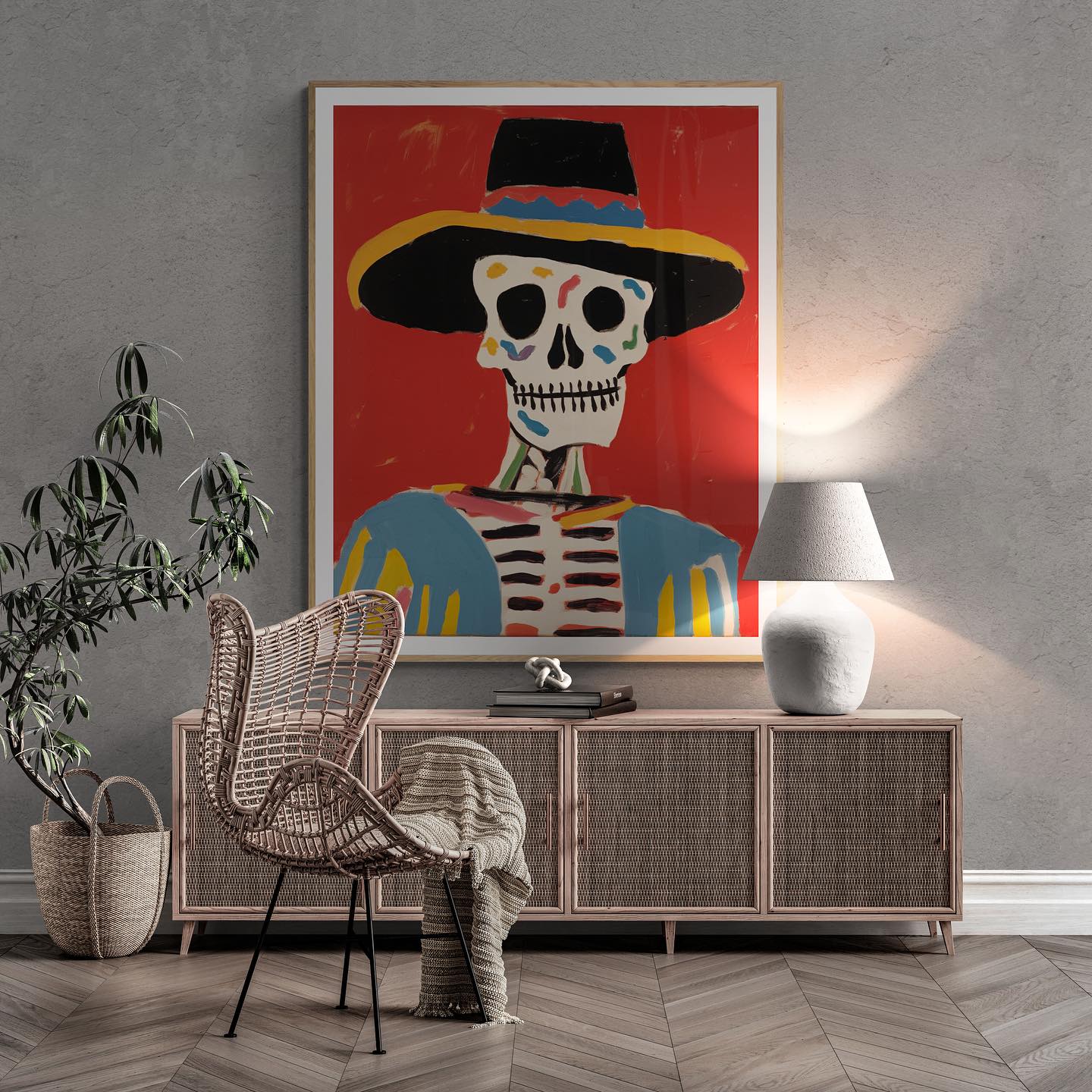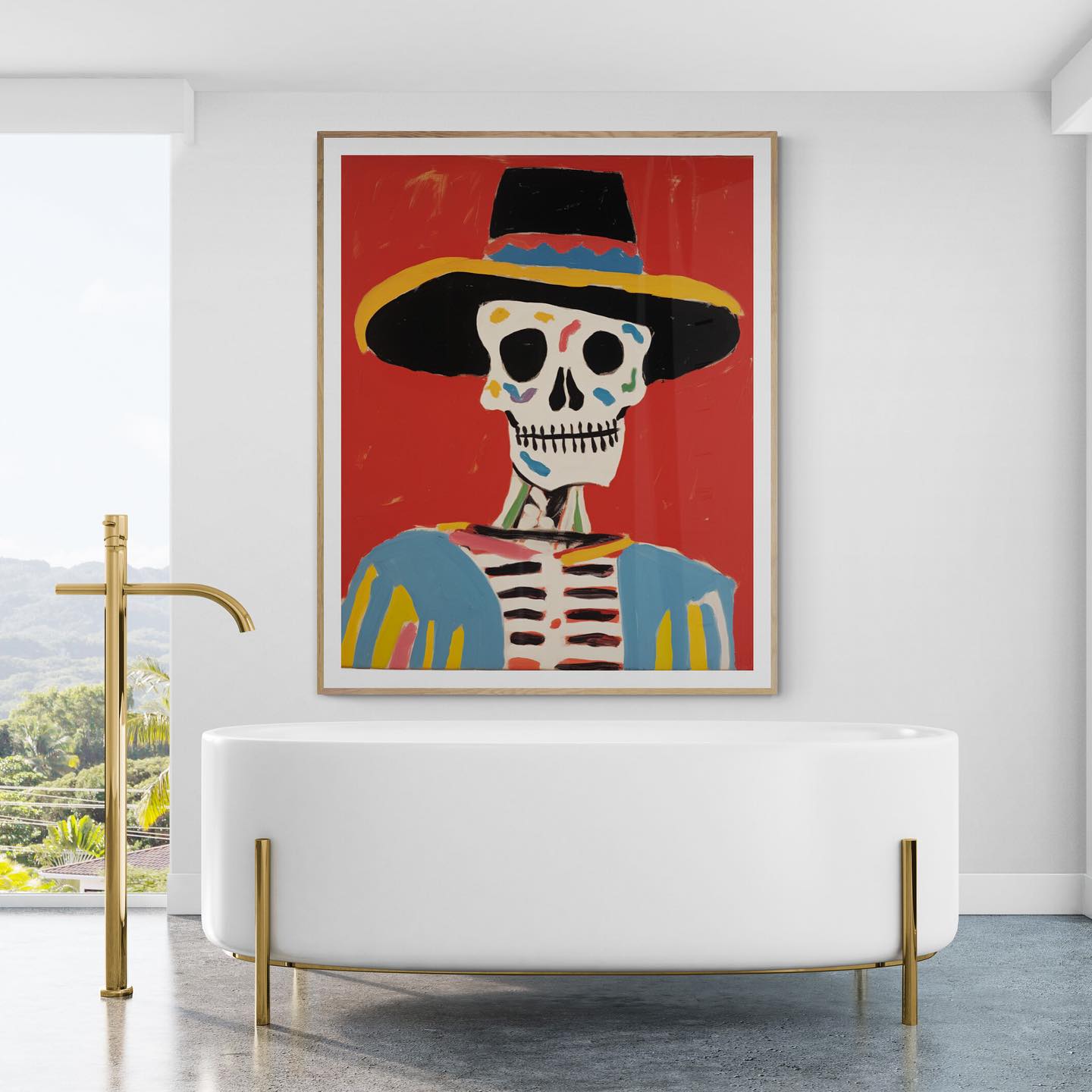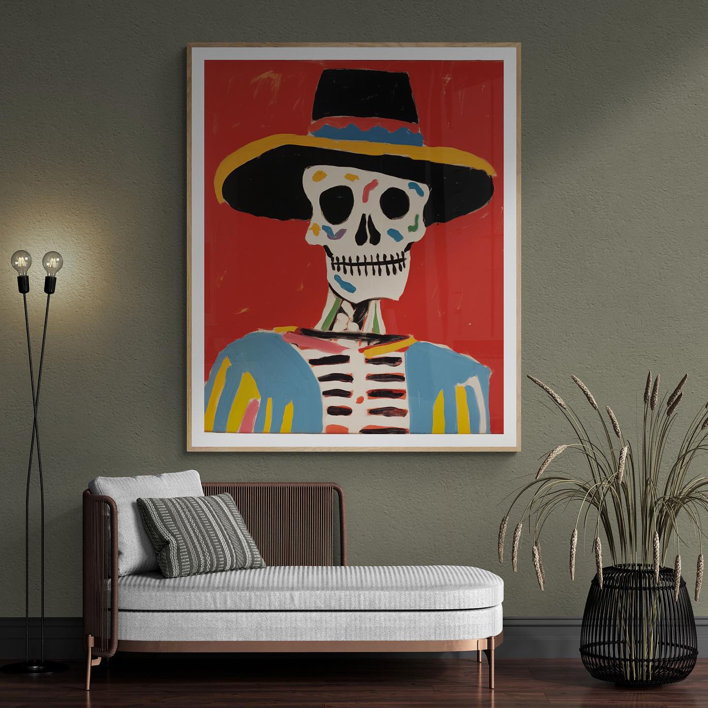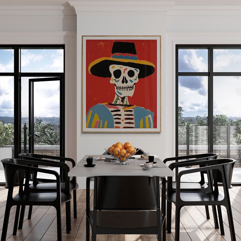 Mexican skeleton calaca with a hat in vibrant colors.