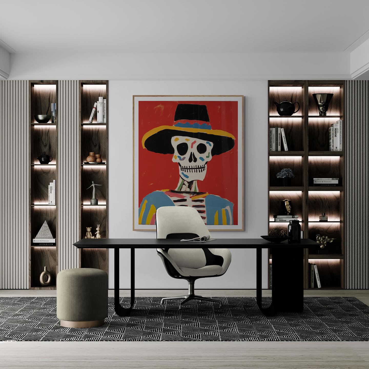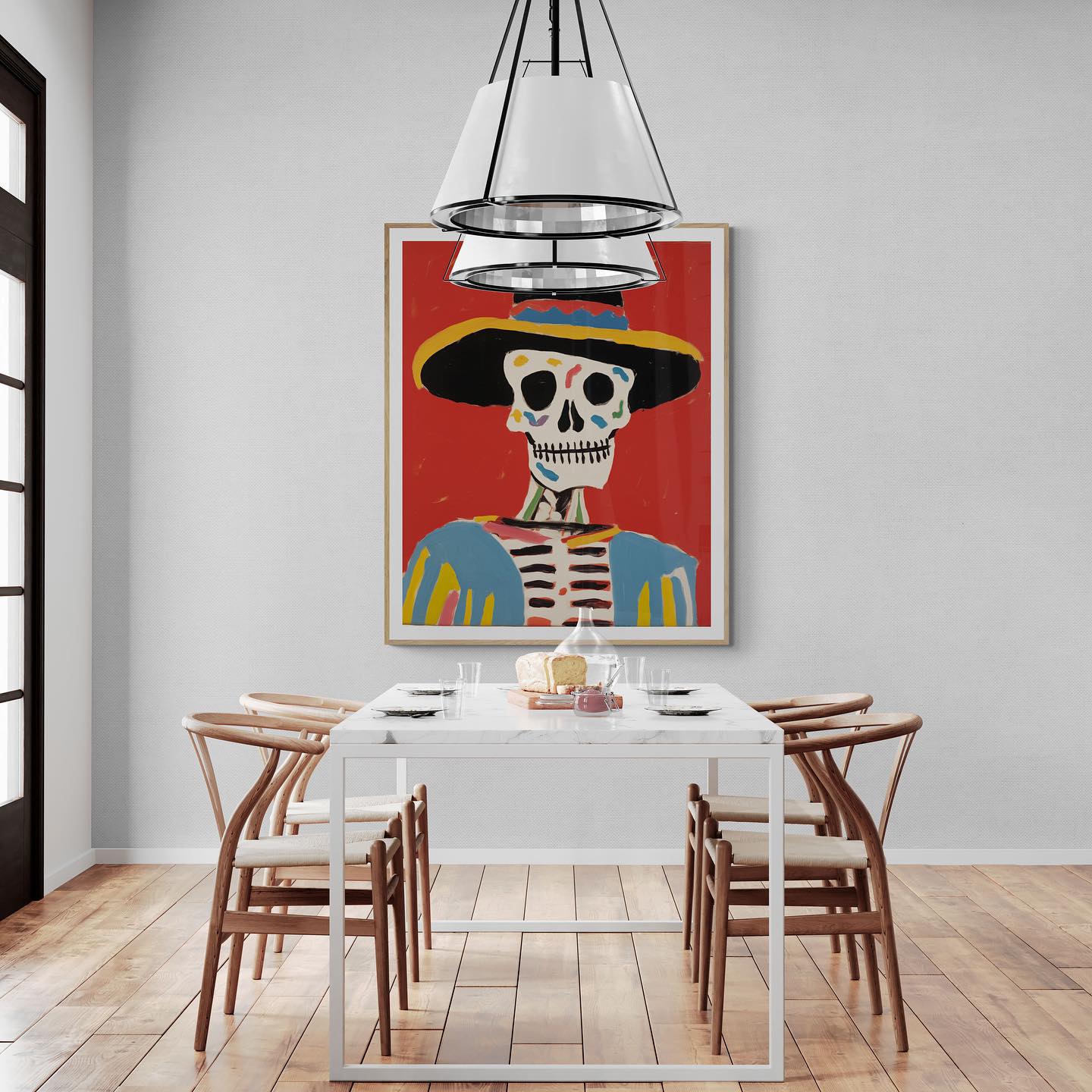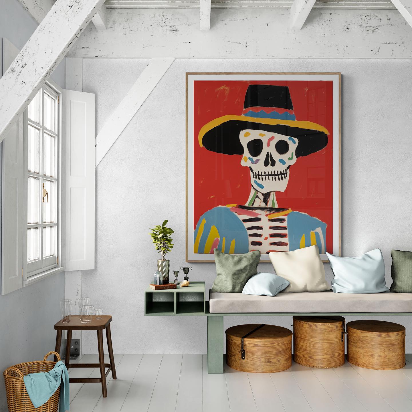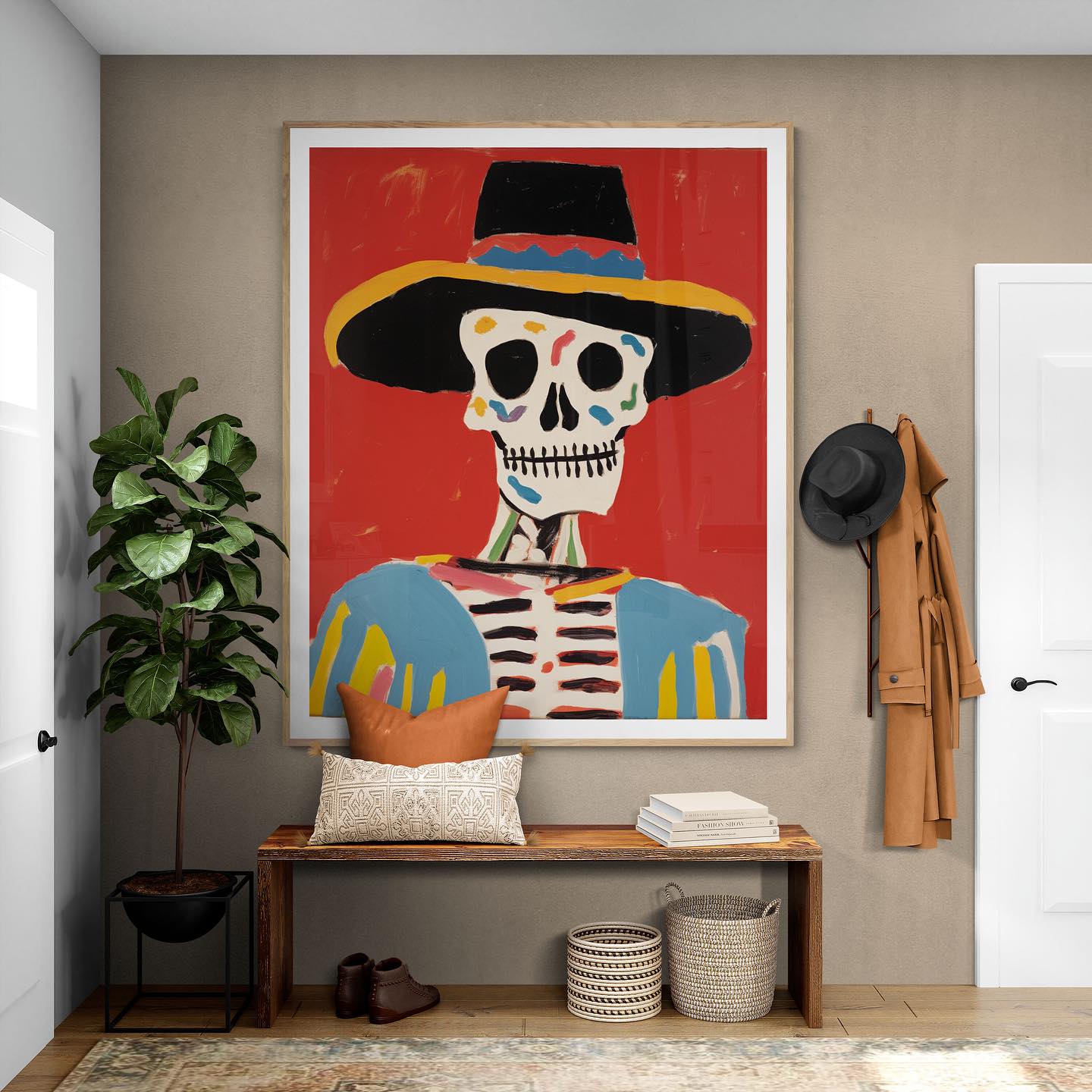 Mexican skeleton calaca with a hat in vibrant colors.