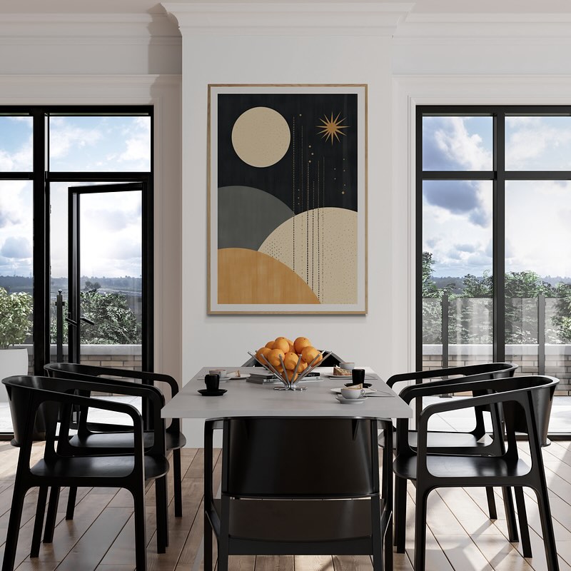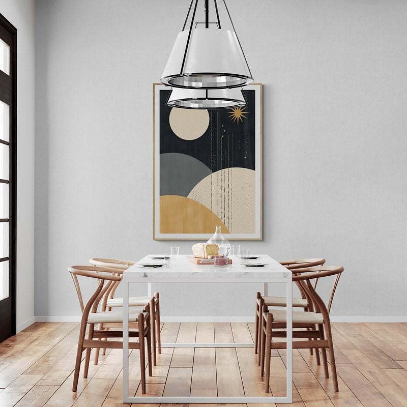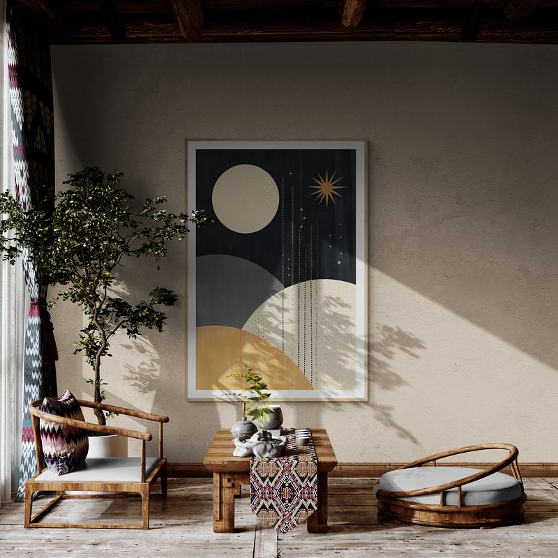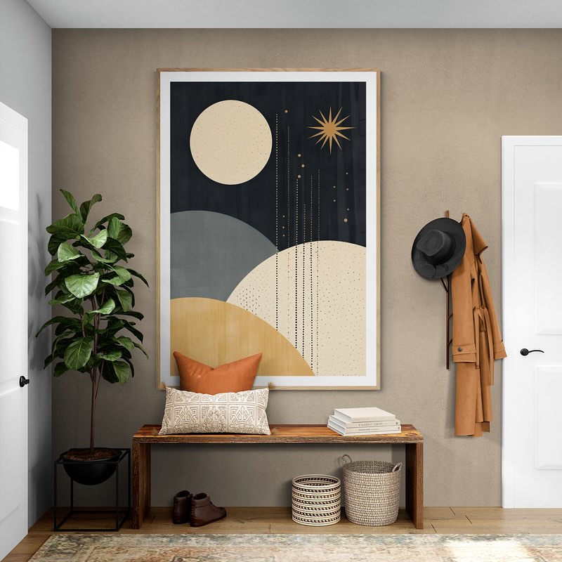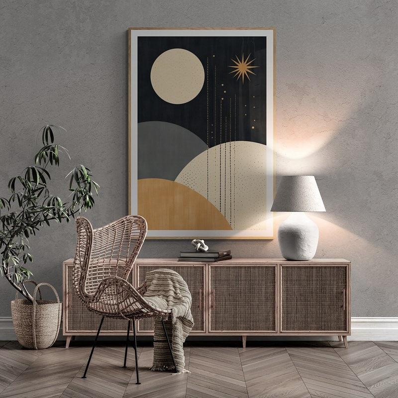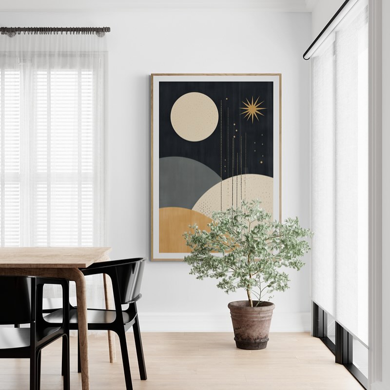 Abstract minimalist art work with earthly colors of the moon sun and hills.