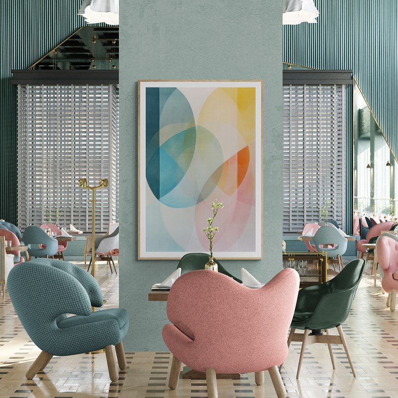 Abstract painting with soft and delicate vibrant juxtaposed vibrant colors