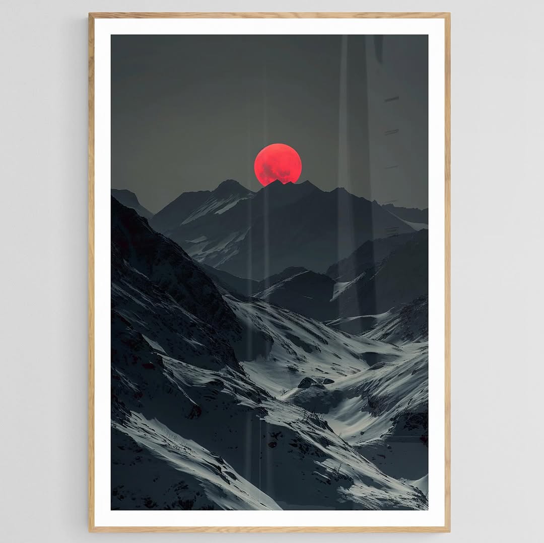 Eerie blood moonset over snowy mini rains at night.