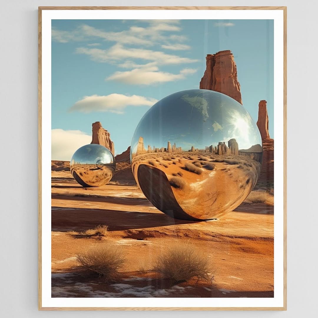 Photograph of two mirror spheres in the desert.