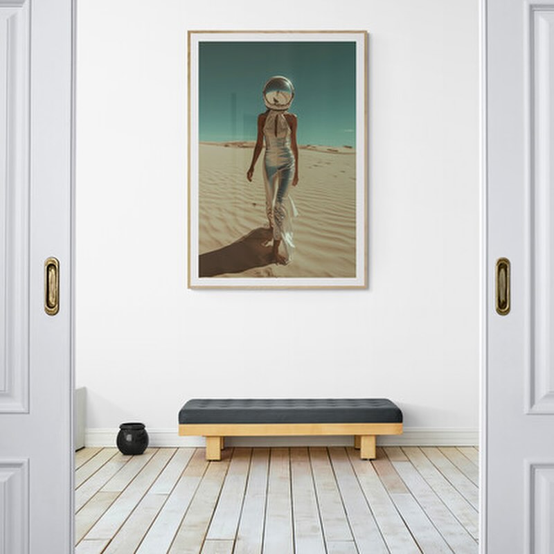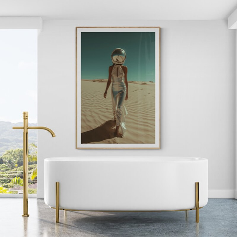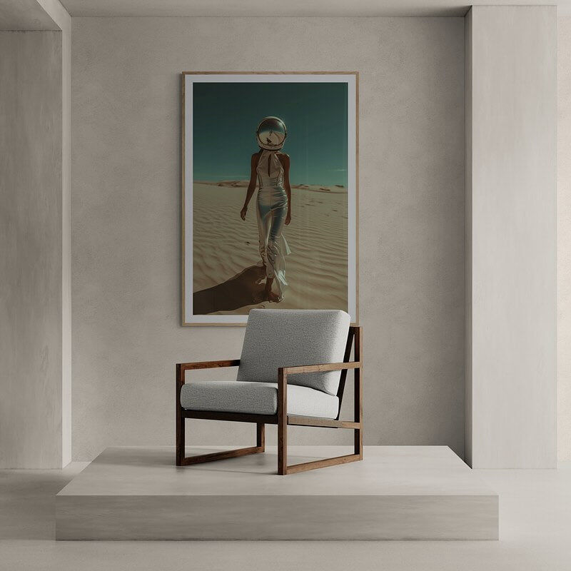 Photograph of a woman wearing an astronaut helmet in the desert.