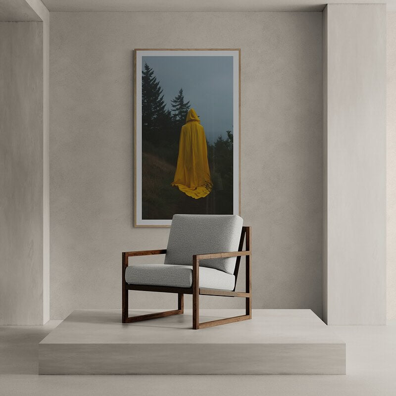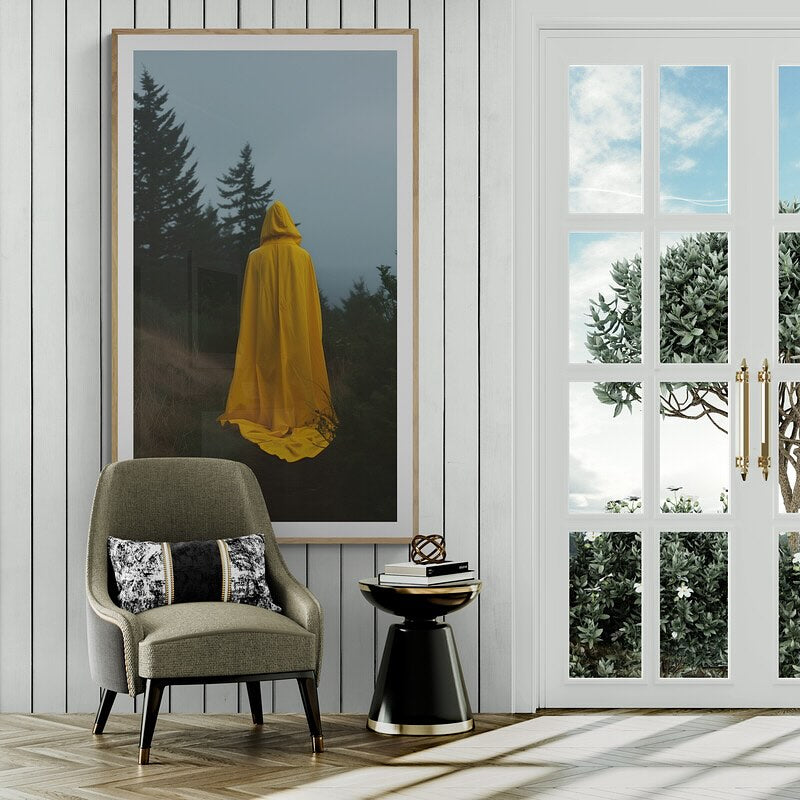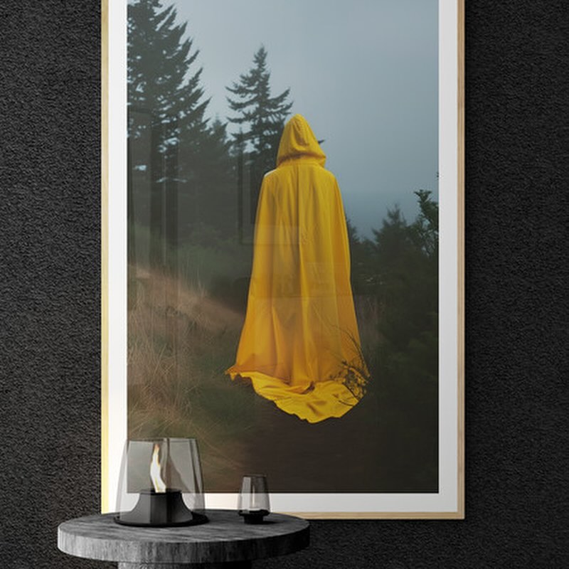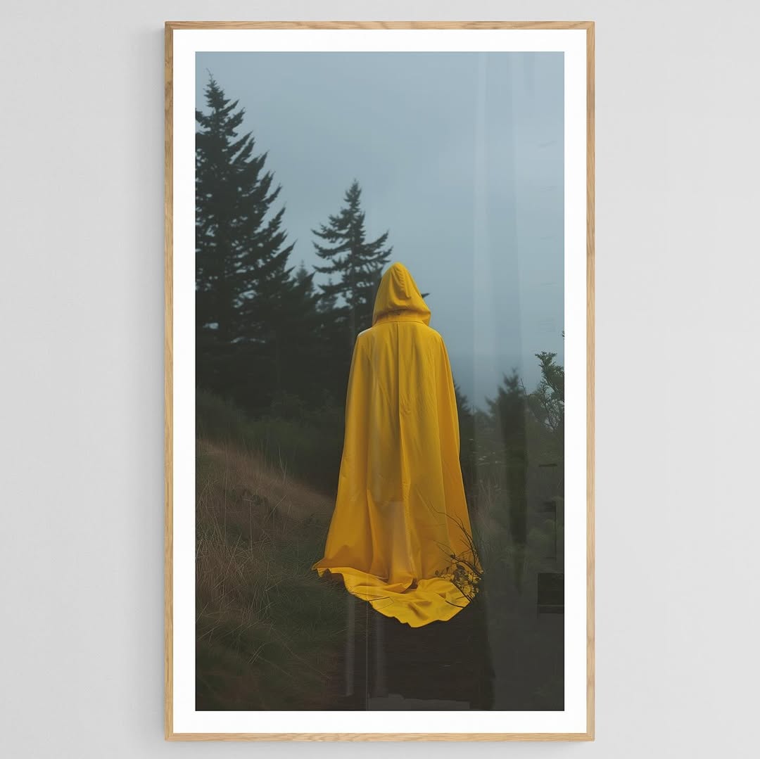 Photograph of a person wearing a yellow raincoat in a eerie forest.