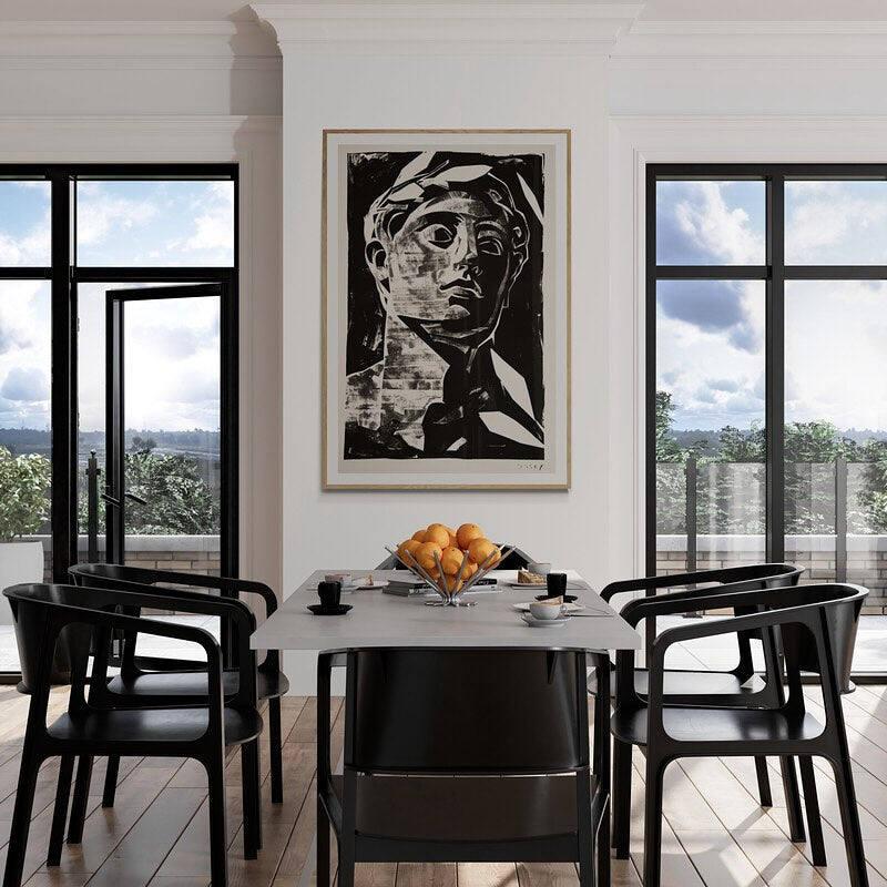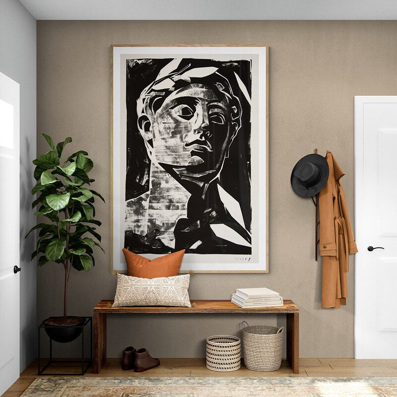 Para obras enmarcadas, sugerimos quitar con cuidado el embalaje protector y colgarla con la ayuda de dos personas, usando clavos resistentes. En el caso de obras de gran tamaño, si es posible, utiliza tornillos y tacos de pared.