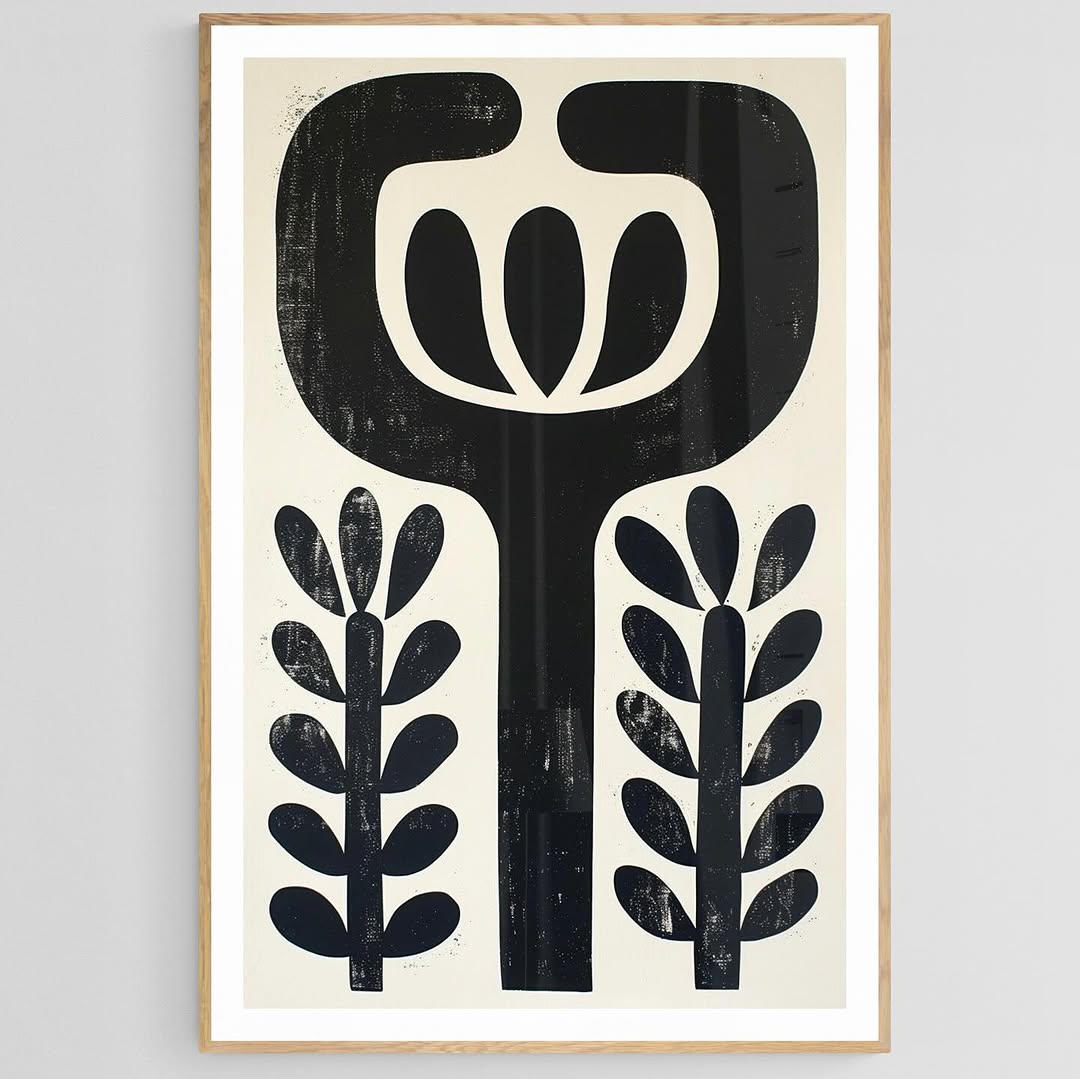 Linoleum engraving art of a flower and wheat and black and white.